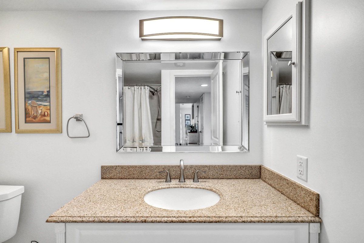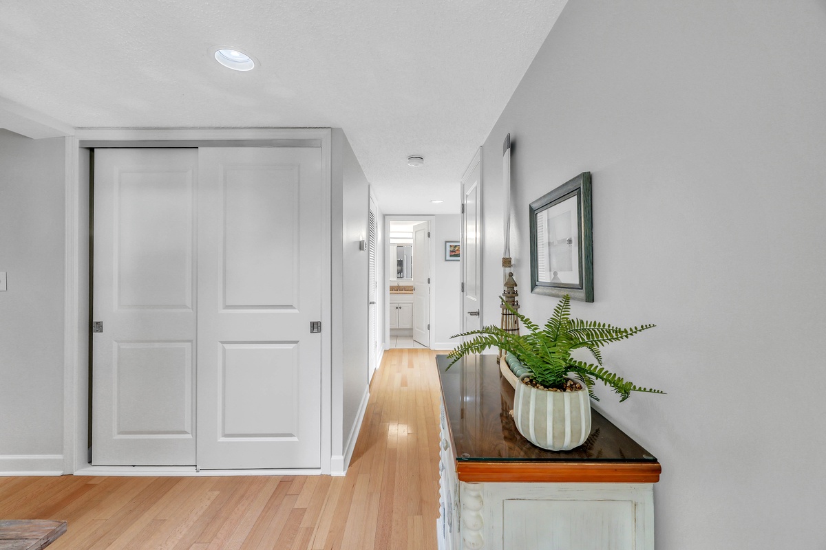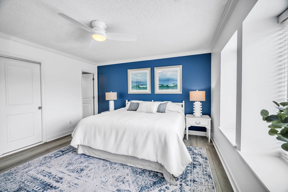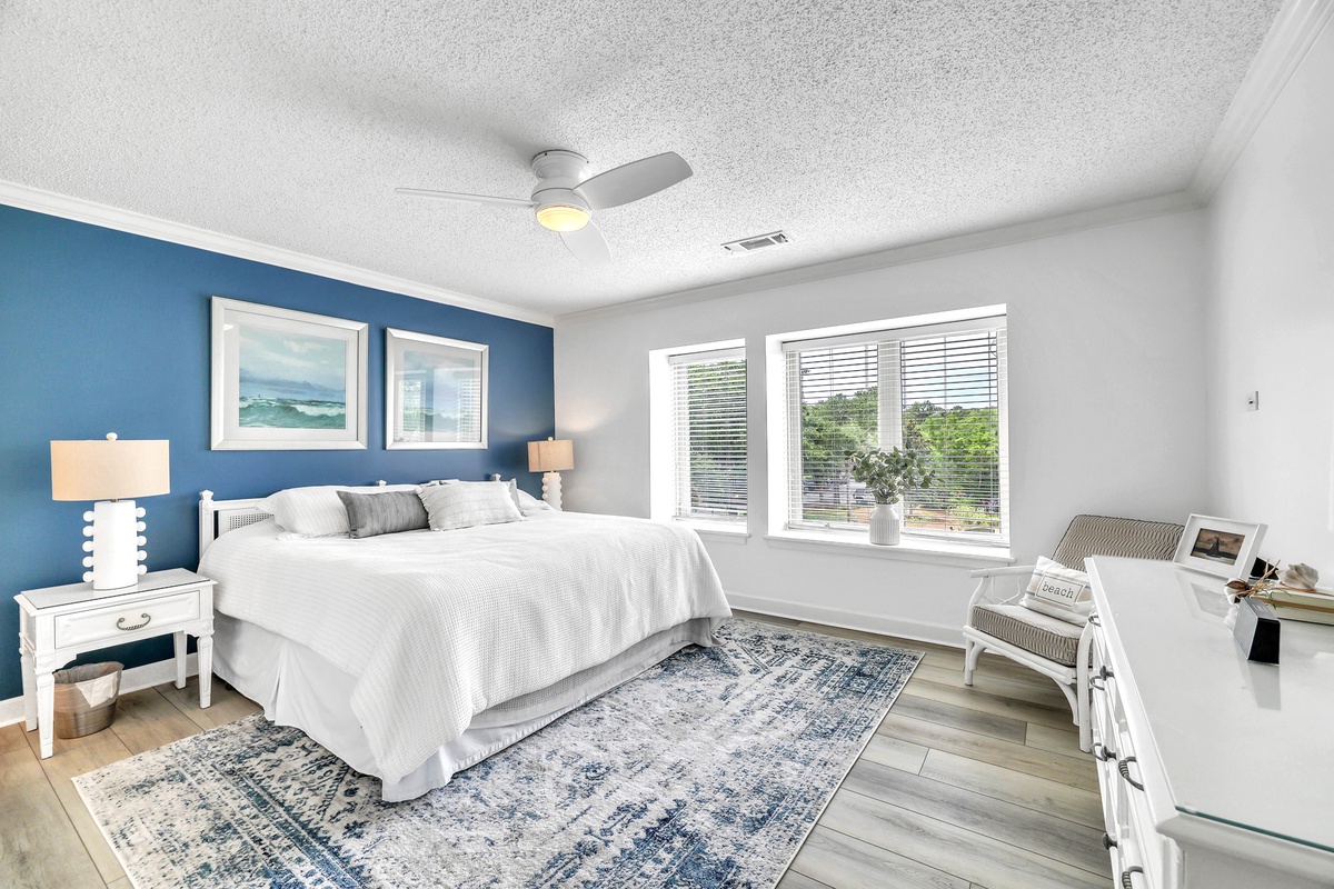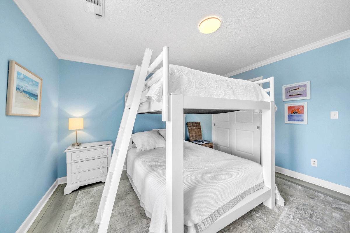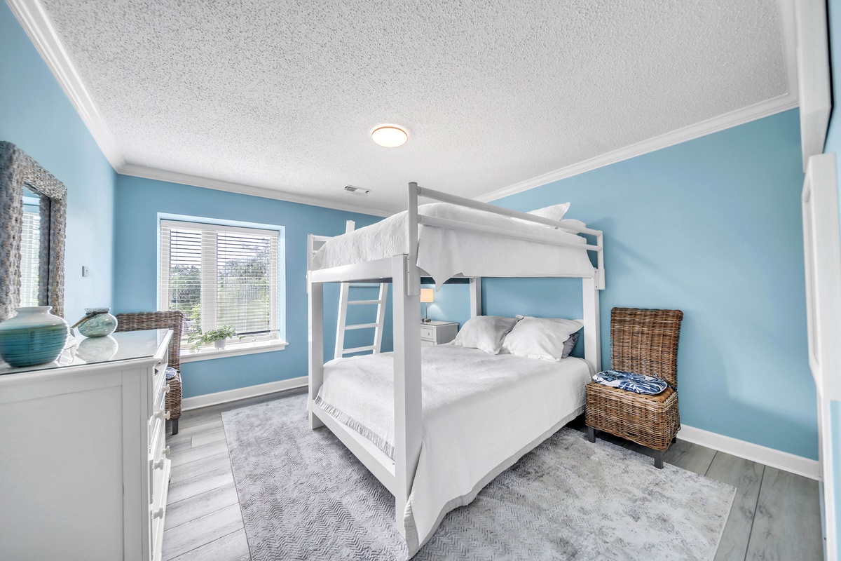 With two spacious bedrooms, this villa is ideal for families, couples, or rental guests seeking a serene stay. The primary bedroom features a plush king-sized bed, serene blue accent wall, coastal artwork, and white contemporary furnishings. Dual nightstands with matching lamps create symmetry and functionality. The guest bedroom is perfect for families or groups, offering a unique queen-over-queen bunk bed—a rare and highly sought-after feature that comfortably accommodates both kids and adults alike. The soft blue walls, coastal decor, and ample natural light enhance the cheerful vibe of the space. The spa-inspired bathrooms and thoughtful hallway layout provide privacy and convenience. Elegant hardwood floors, updated lighting, and quality finishes continue throughout the villa.