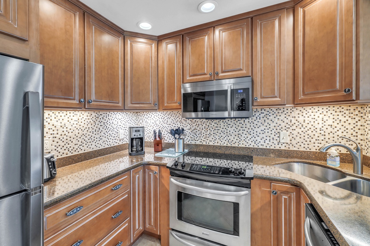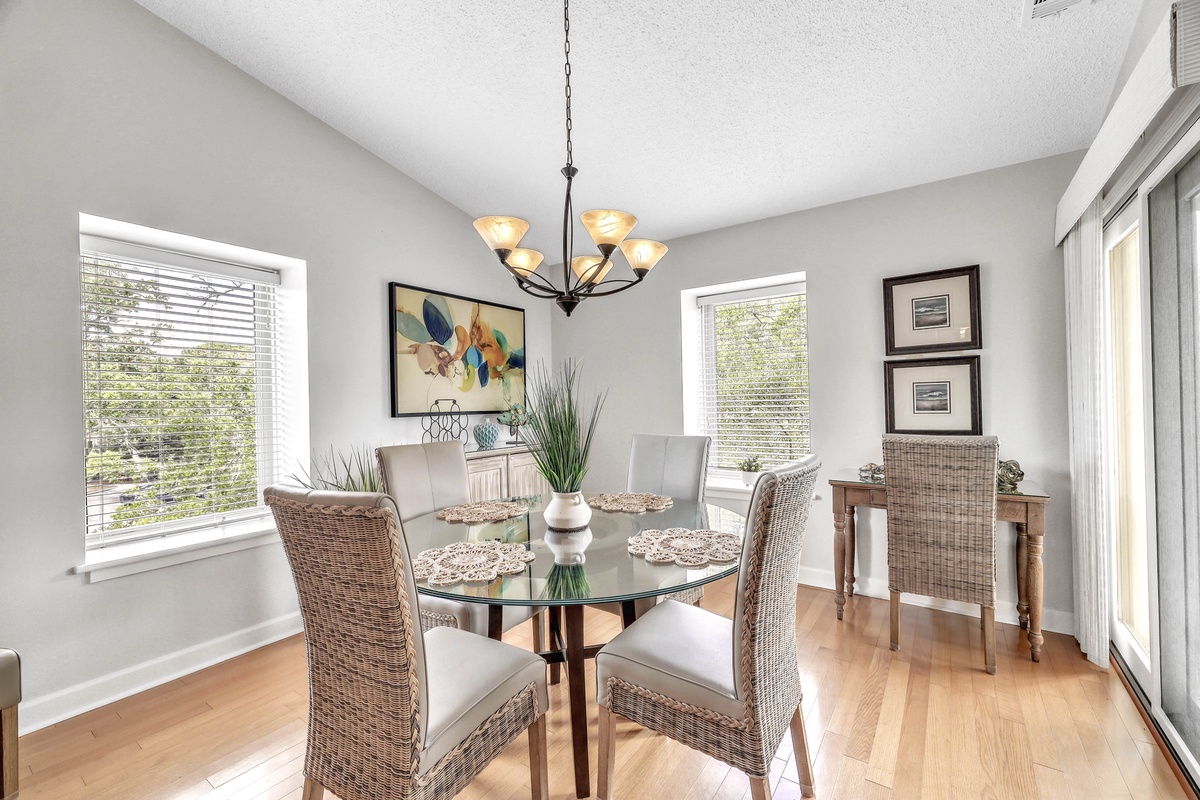 Adjacent to the living room, the dining area offers seating for six around a stylish glass-top table with wicker chairs, just steps from the kitchen pass-through for convenient entertaining. The kitchen is a chef’s delight—fully updated with granite countertops, stainless steel appliances, custom wood cabinetry, and a mosaic tile backsplash. Whether you're preparing a beach picnic or a full dinner, this well-equipped kitchen makes every meal a pleasure!