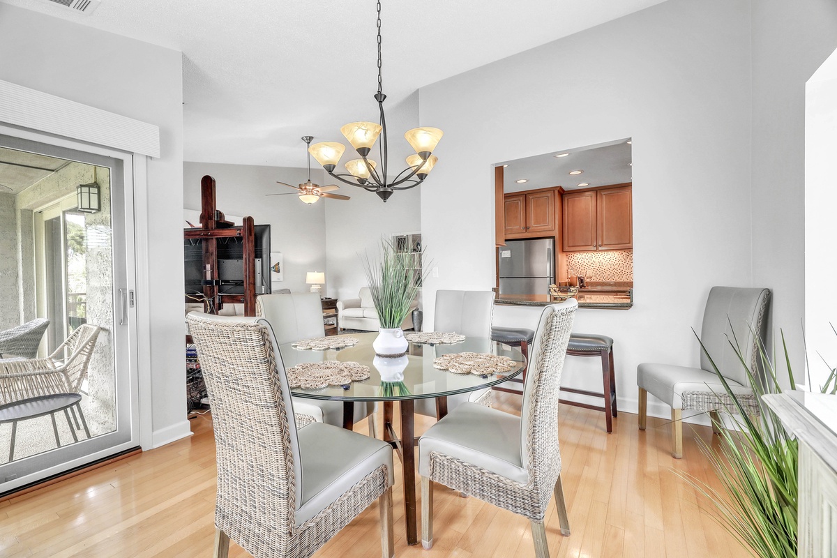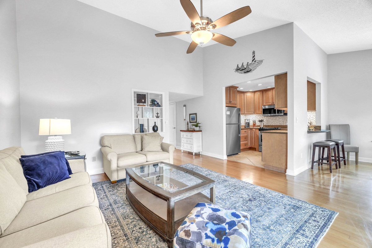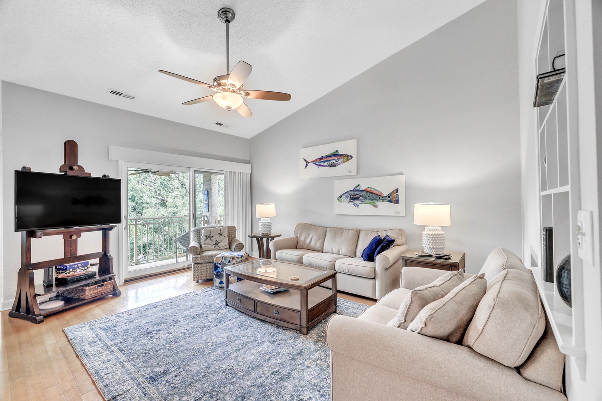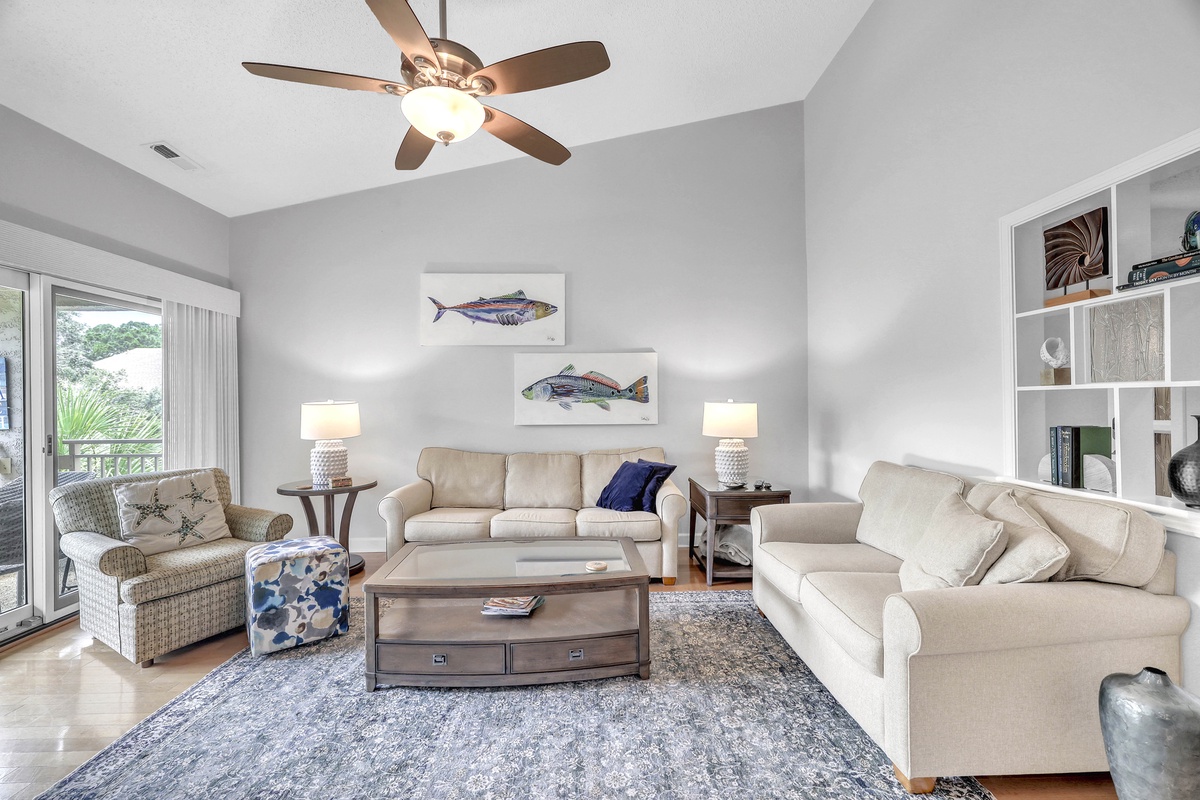 Step inside and feel immediately at ease. The open-concept living and dining areas are drenched in natural light from large sliding glass doors, which lead out to a serene balcony overlooking lush, green foliage. A vaulted ceiling with a large ceiling fan adds to the airy, coastal ambiance. The living room features neutral-toned sofas, accent chairs with coastal patterns, and a vibrant blue area rug that anchors the space. Nautical-themed artwork and designer lighting create a warm and welcoming setting for family gatherings or quiet relaxation.