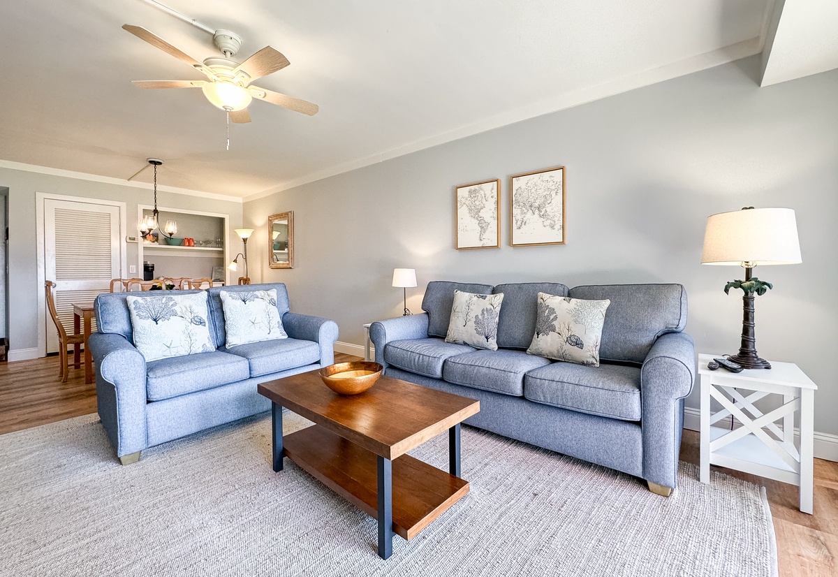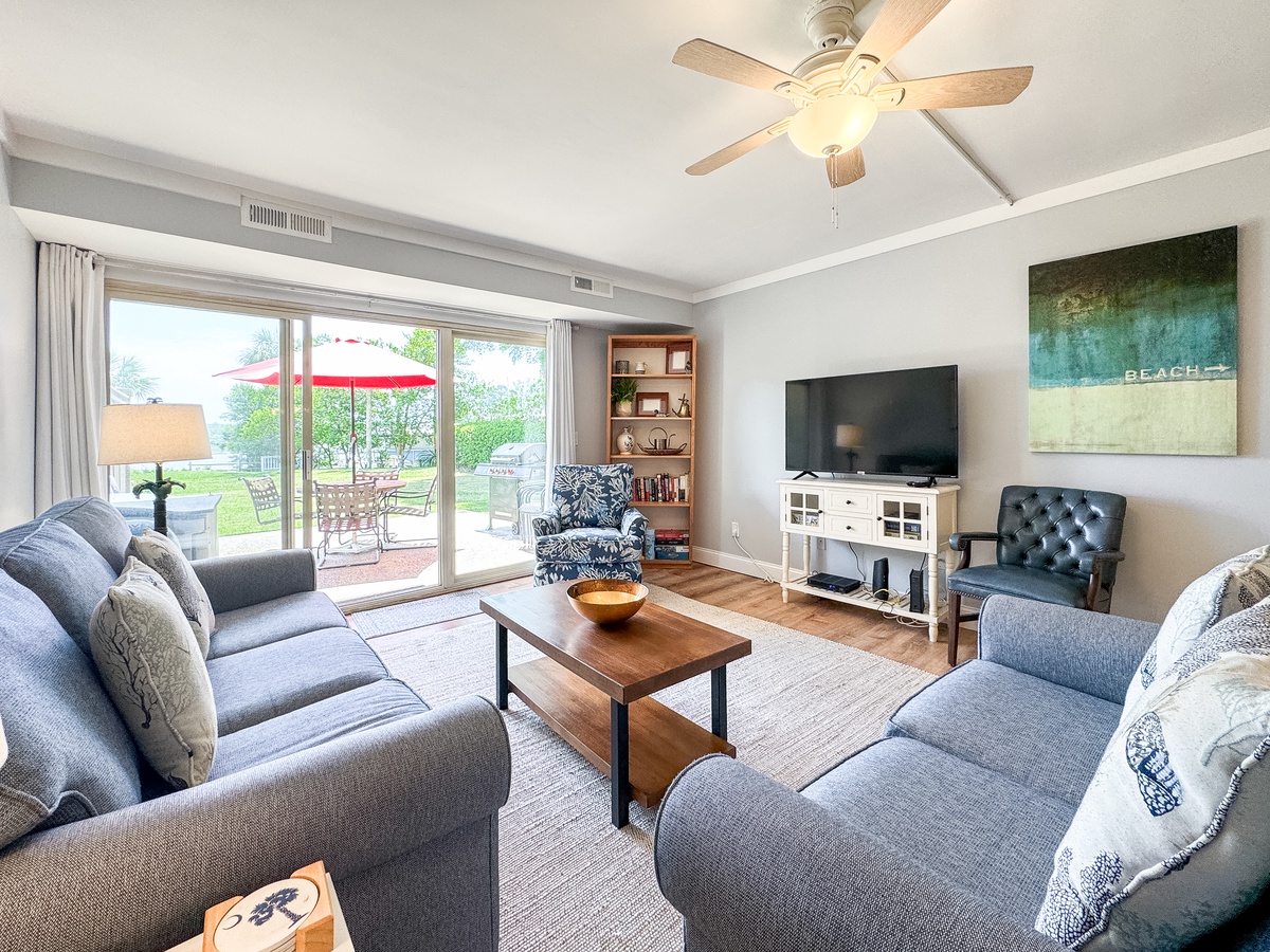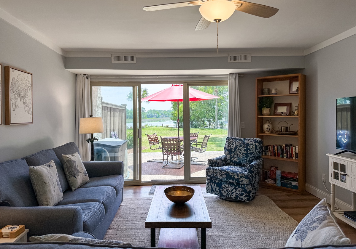 This villa is just steps to the beach, Calibogue Sound, South Beach Marina Village, and the renowned Salty Dog Cafe, this 2-bedroom 2 bath villa comfortably accommodates a family or group of five. Enjoy a stroll to the sandy beaches, tennis, pickleball, and water sports while you're here. Maybe you just want to chill - easy to do outside on the patio where you can take in the views or grill some steaks. The living area is another great space to relax with a good book on the cozy couch, or maybe it's time for a family game or movie night!