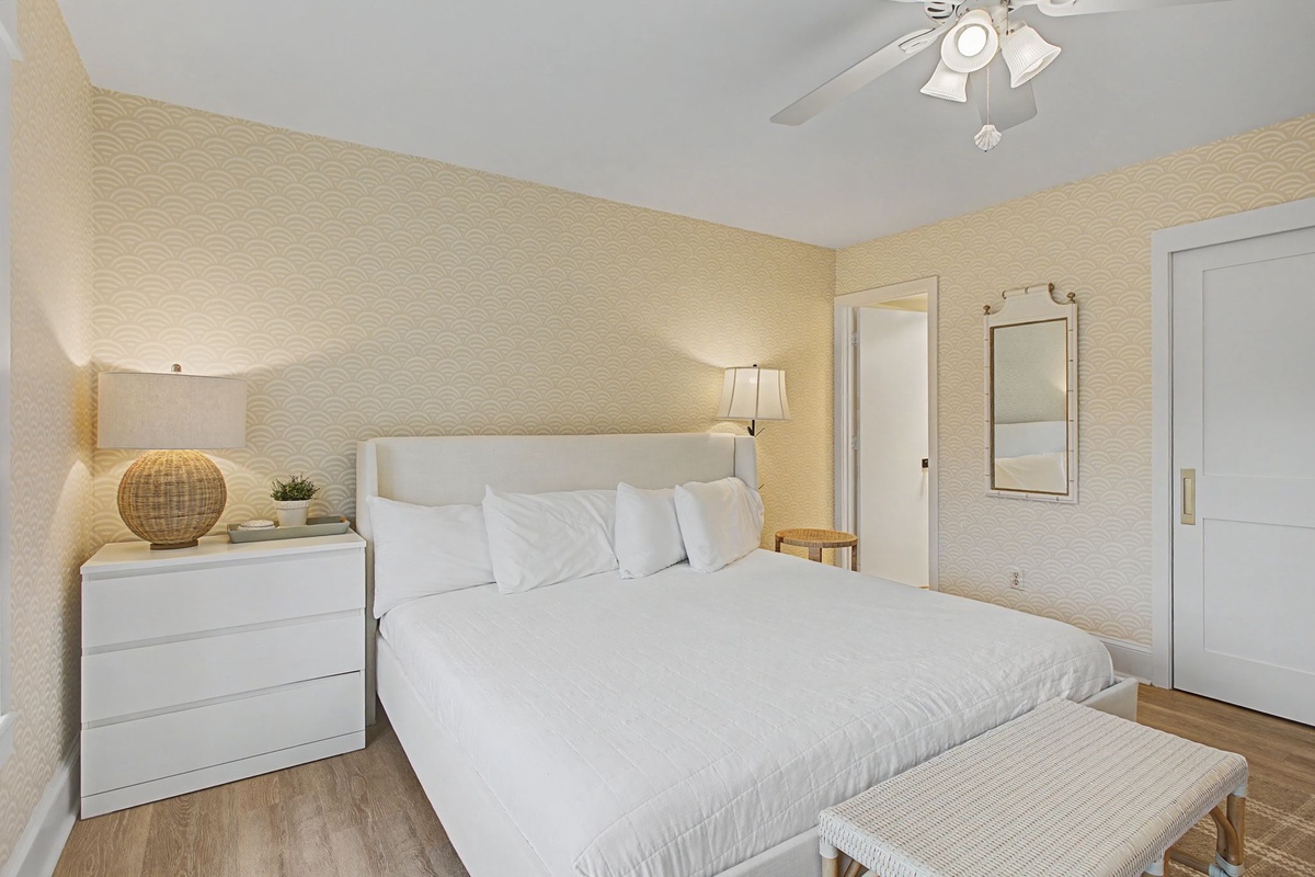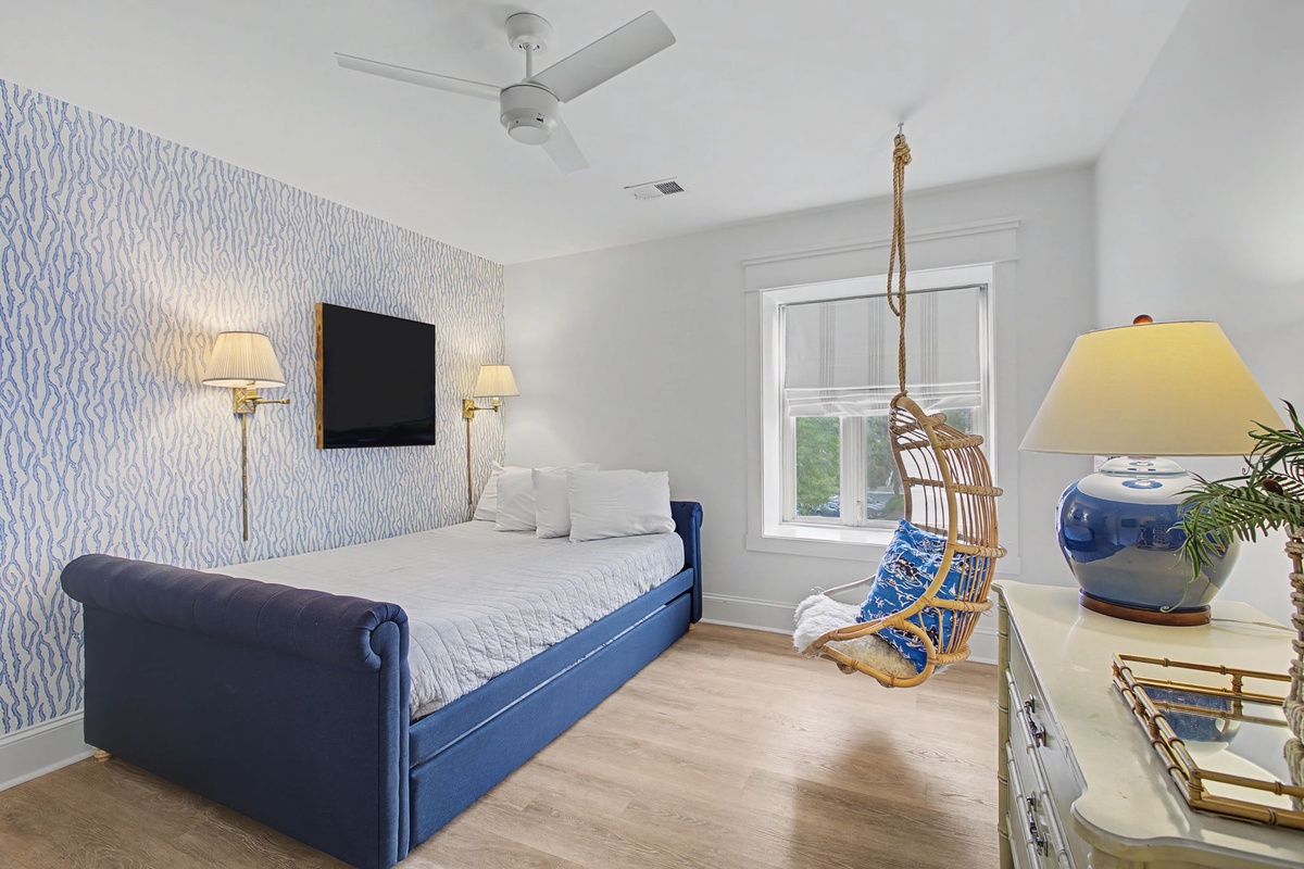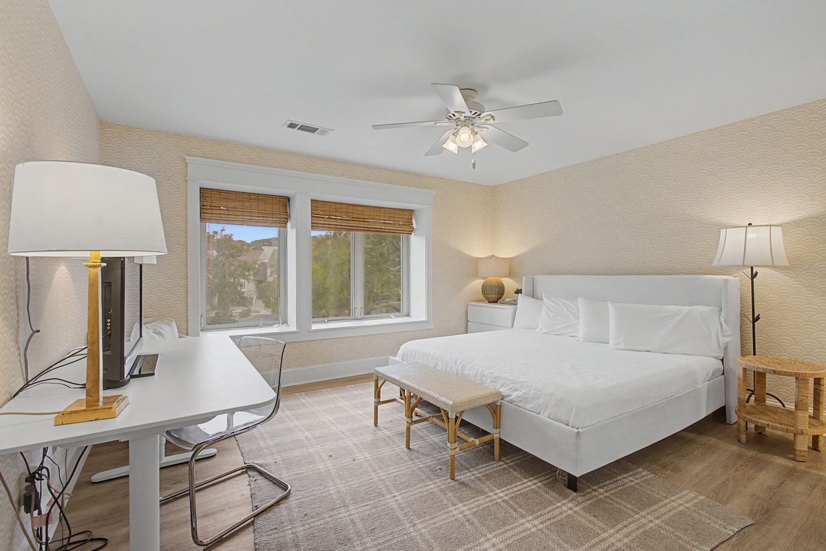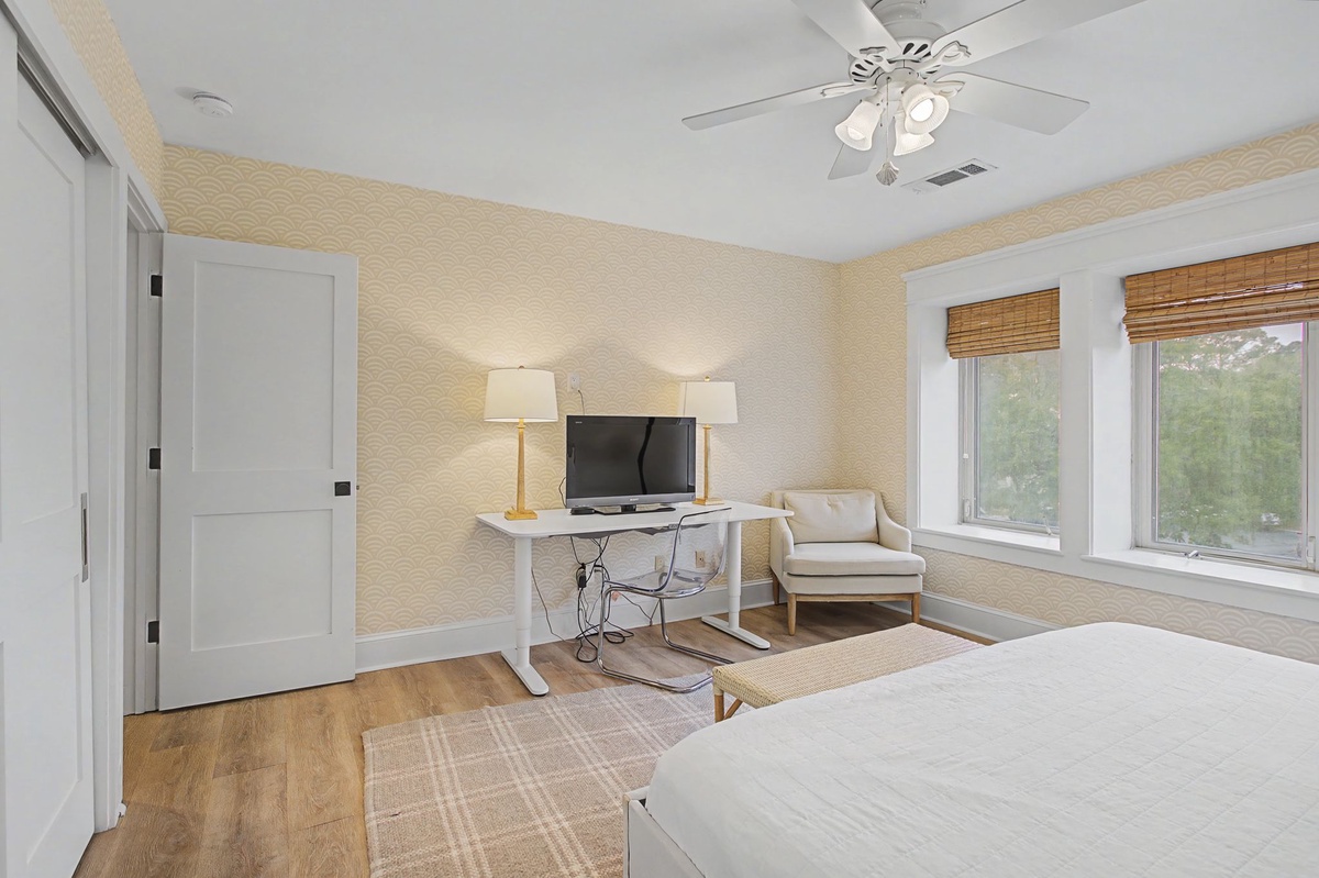 The primary suite is a calm retreat with king platform bed, spacious closets and an adjustable desk for the remote worker. The guest bedroom shines for any age, with a queen roll arm bed and full-size trundle, so there is room for everyone. Plus, the nest chair will be in high demand! There is a stacked washer and dryer in the guest closet and the bath just across the hall. The entry hall has a built-in mud room locker for all your beach gear.