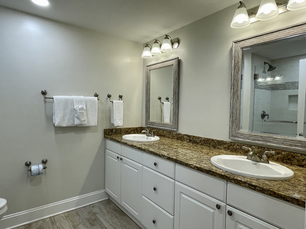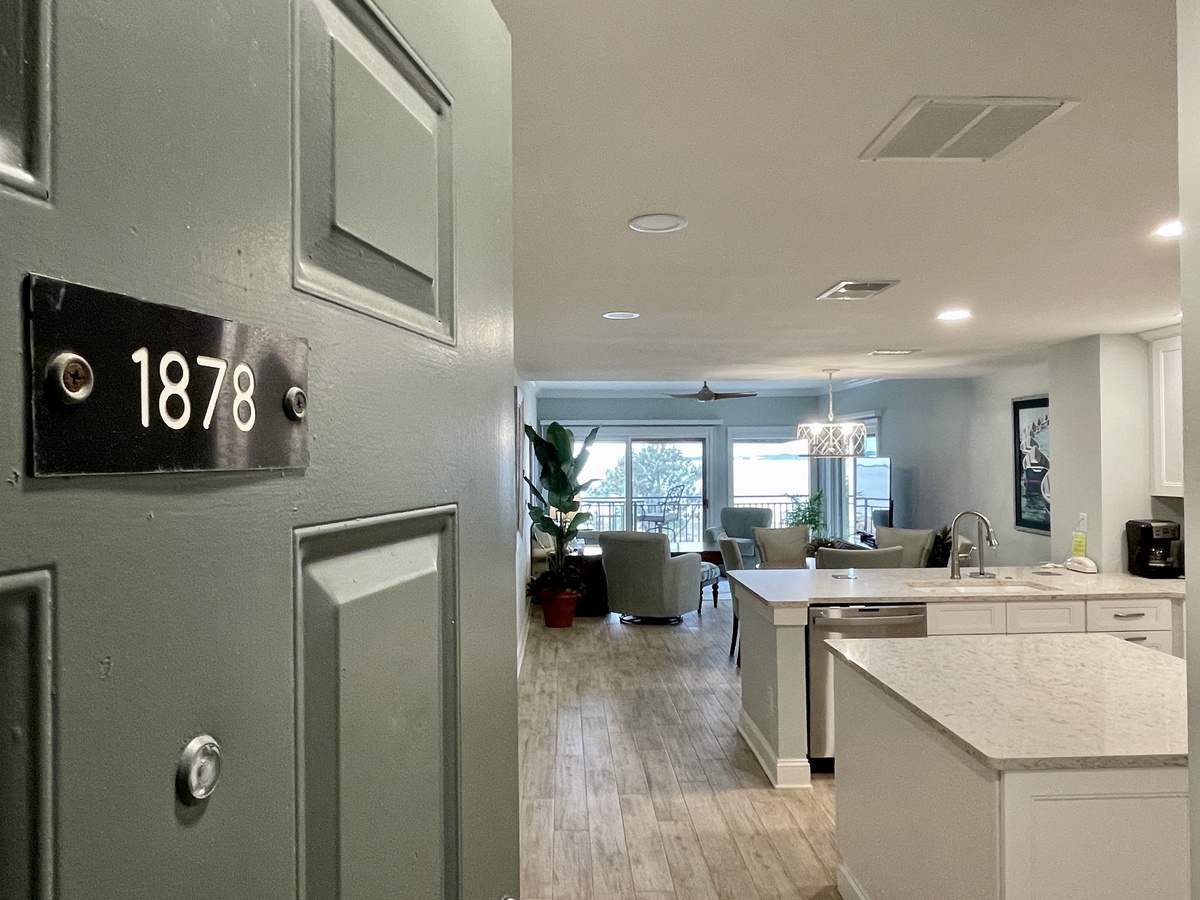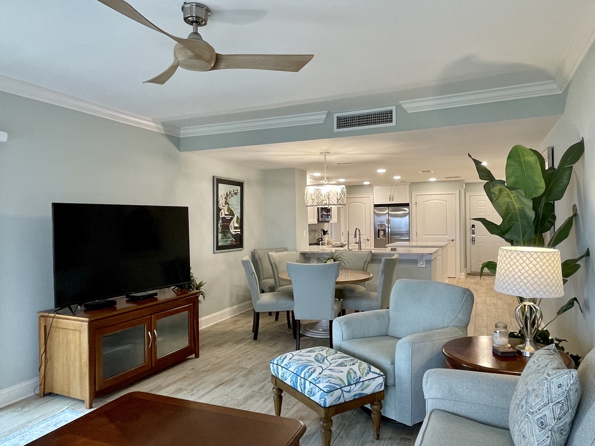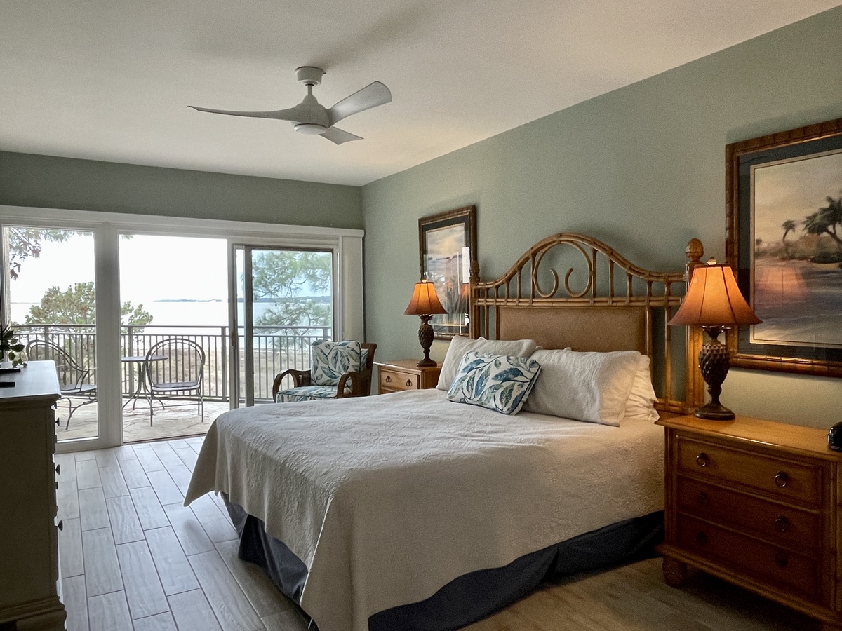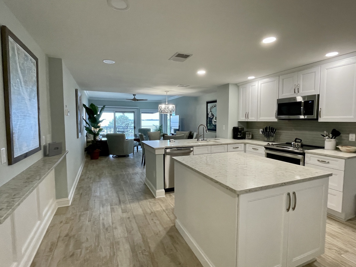 This recently remodeled waterfront villa is located on the 4th floor of the Beachside Tennis Villas. The floor plan has been opened up to remove the entry hallway, so you will open the door to the beautifully appointed living space and the view! First, you will notice the large kitchen with a center island and all new appliances. The dining and living spaces are arranged for comfortable seating of six, plus there is the breakfast bar with seating. The Living room sofa has a queen sleeper and comfortable club chairs and floor to ceiling views off the wrap around balcony.