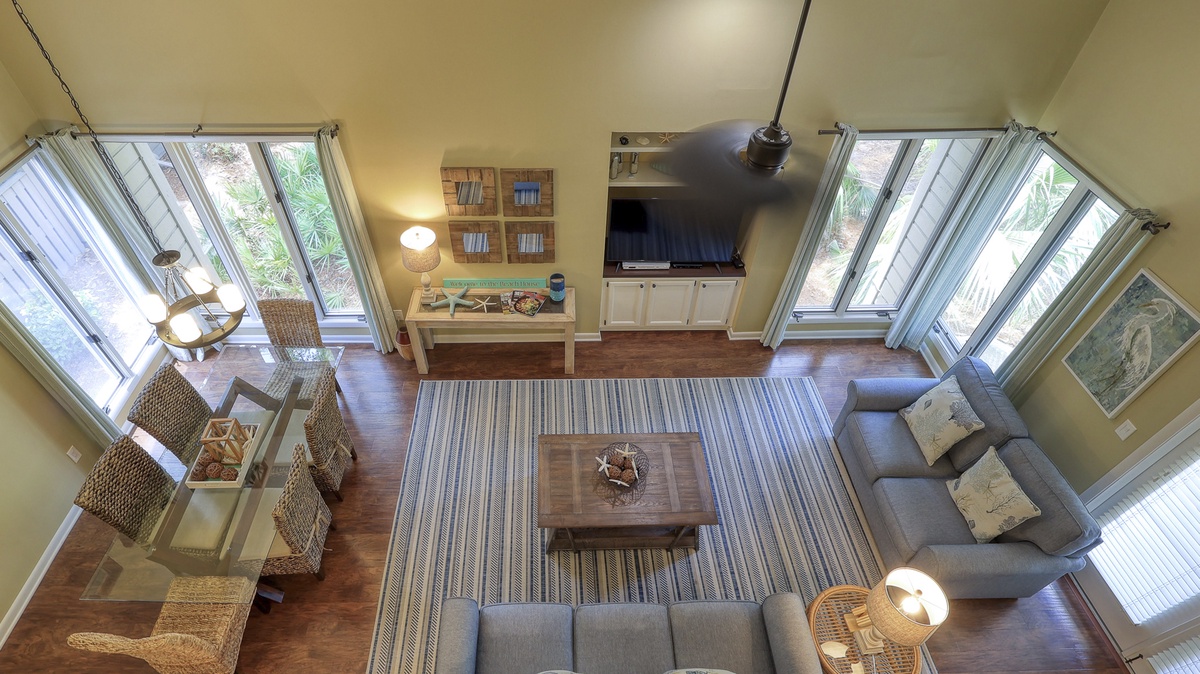 This 2BR/2BA villa has been decorated with your guest experience in mind. The kitchen and baths are outfitted with comfortable and cozy appointments. The open plan includes a living and dining area, a fully-equipped kitchen where you can prepare yummy meals or pack a picnic lunch for the beach, and a comfrotable king suite with access to the patio where you can enjoy serene and peaceful views of the lagoons and the George Fazio Golf Course while sipping sweet tea, having that morning cup of coffee, or enjoying cocktails. A spiral staircase on the first level leads you to the twin loft with a full bath. The sleeper sofa in the living room is also available to accommodate 6 guests fully.
