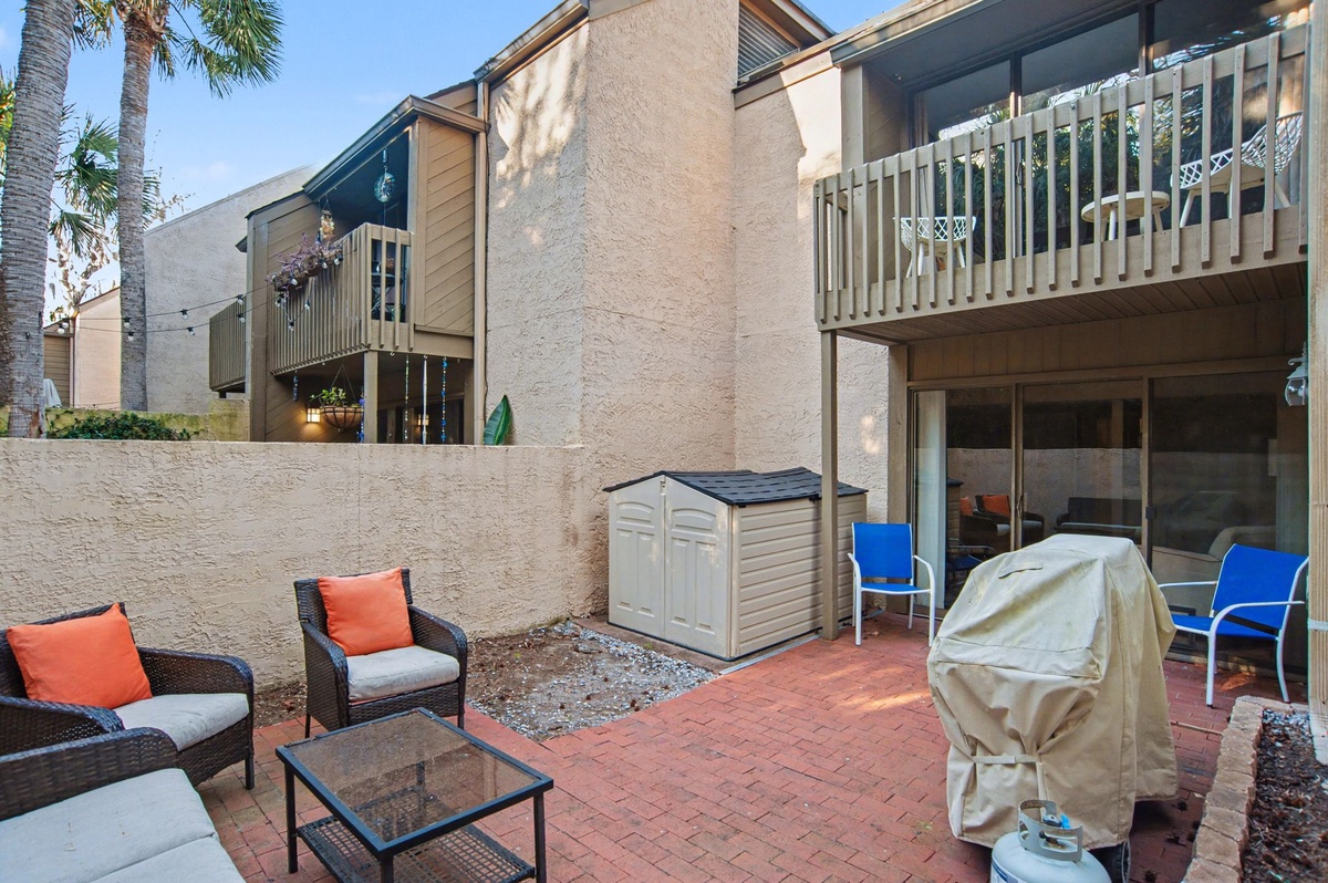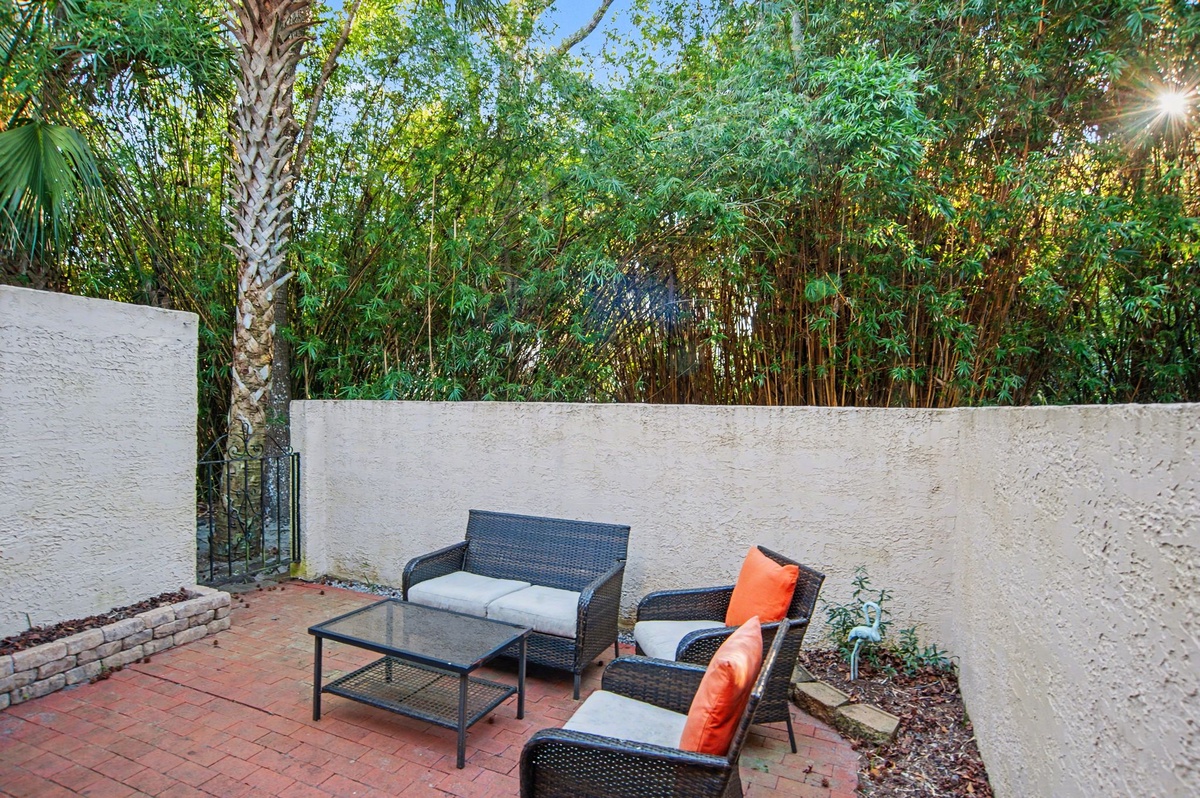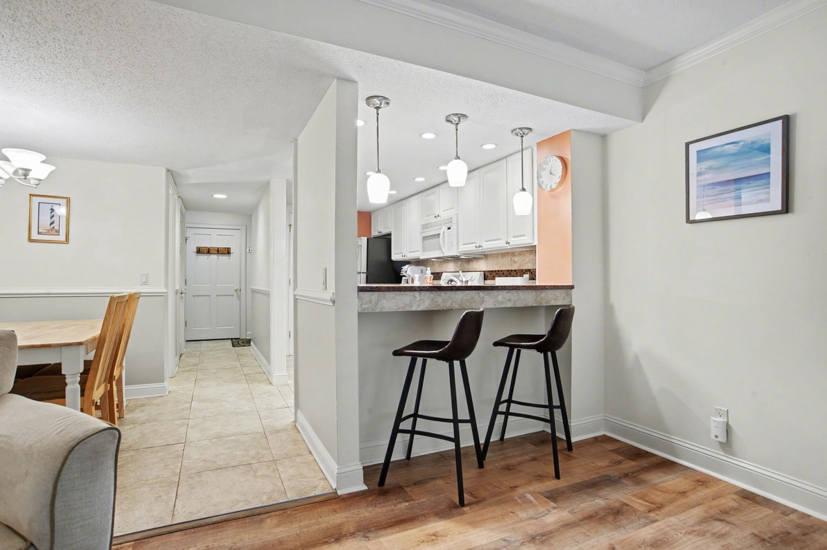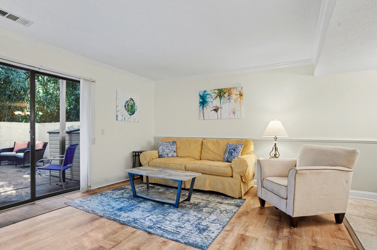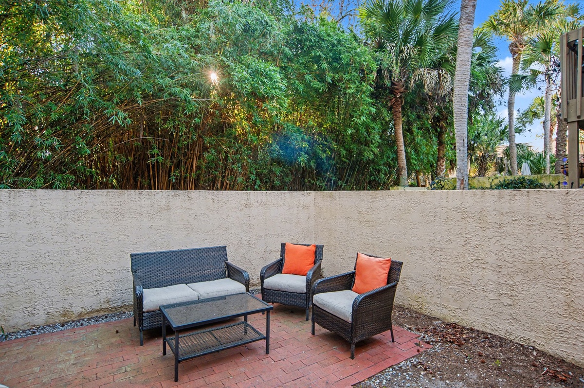 Inside, the condo offers an inviting two level living space that has been carefully updated to blend comfort with modern convenience. A newer central air conditioning system ensures a refreshing atmosphere as natural light fills the rooms. The standout feature remains the private courtyard which is surrounded by high walls for complete privacy and creates a peaceful sanctuary for morning coffee, quiet reading, or evening barbecues on the gas grill. This personal retreat feels like your own hidden corner of the island where you can savor gentle breezes and the quiet rustle of trees without interruption. The interior is equally welcoming with a well equipped kitchen, a breakfast bar, and a dining area that encourages lingering over shared meals and conversations. Everything from the soft coastal décor to the thoughtful layout invites you to slow down and relax.