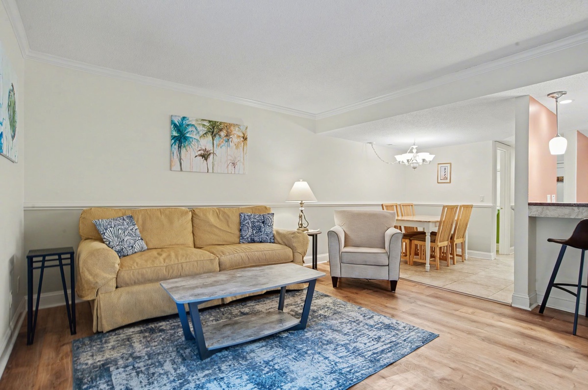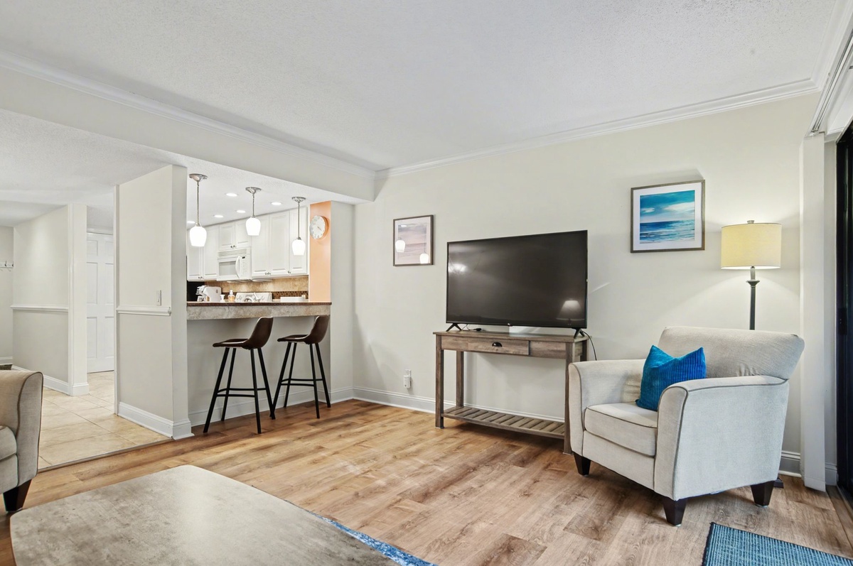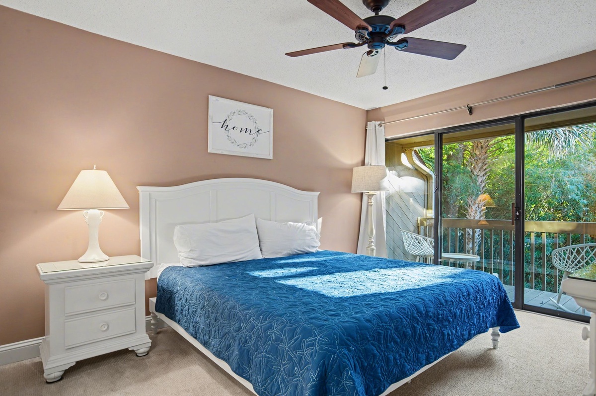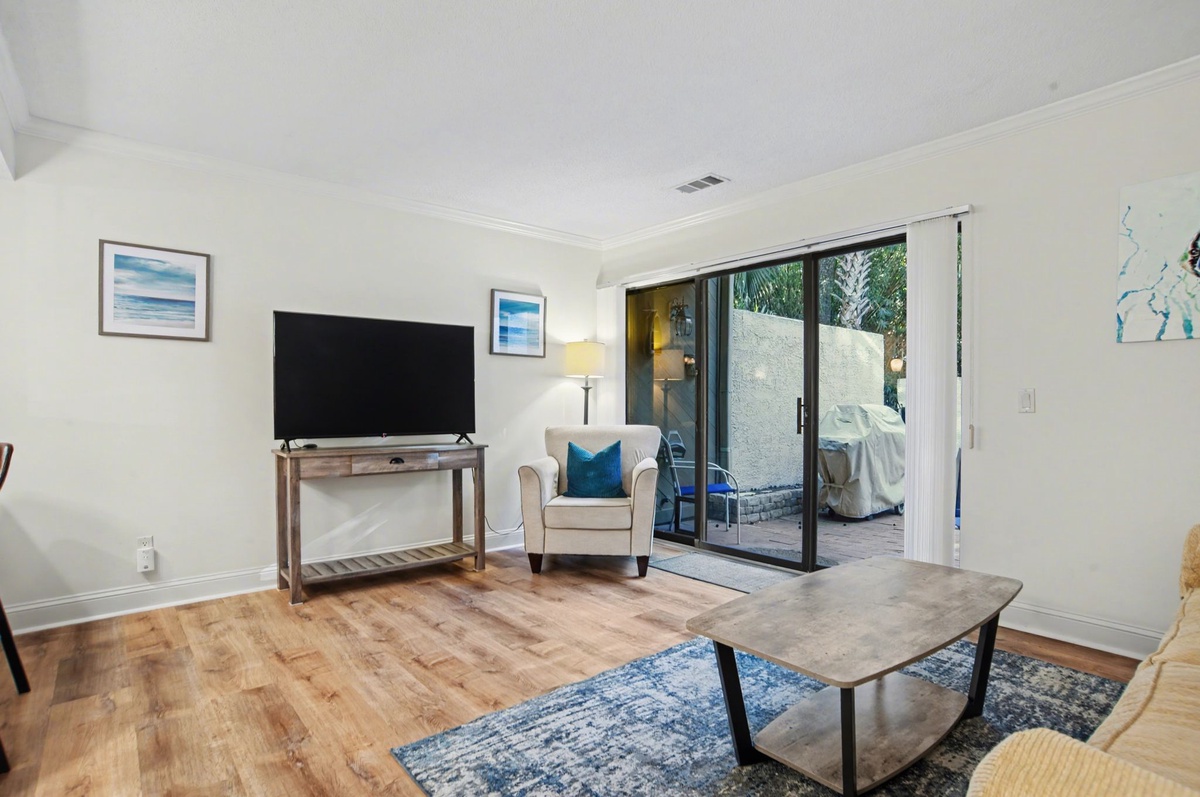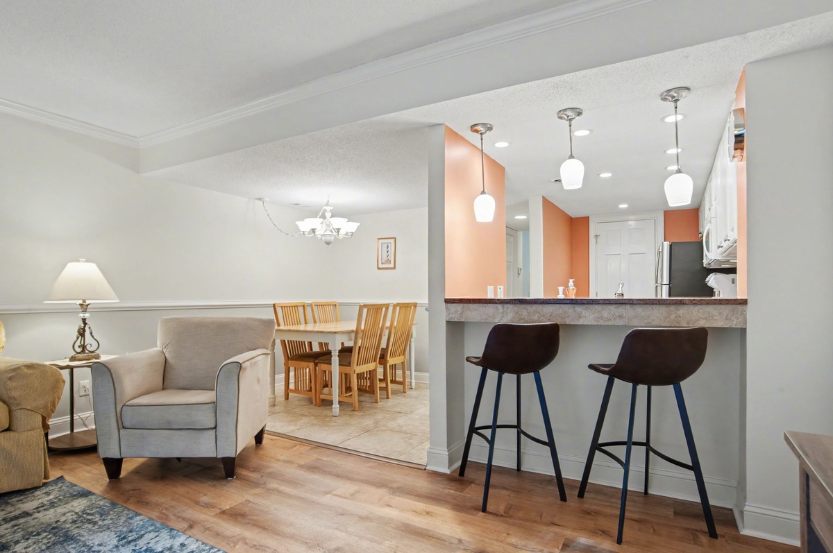 Inside, the condo offers an inviting two level living space that has been carefully updated to blend comfort with modern convenience. A newer central air conditioning system ensures a refreshing atmosphere as natural light fills the rooms. The standout feature remains the private courtyard which is surrounded by high walls for complete privacy and creates a peaceful sanctuary for morning coffee, quiet reading, or evening barbecues on the gas grill. This personal retreat feels like your own hidden corner of the island where you can savor gentle breezes and the quiet rustle of trees without interruption. The interior is equally welcoming with a well equipped kitchen, a breakfast bar, and a dining area that encourages lingering over shared meals and conversations. Everything from the soft coastal décor to the thoughtful layout invites you to slow down and relax.