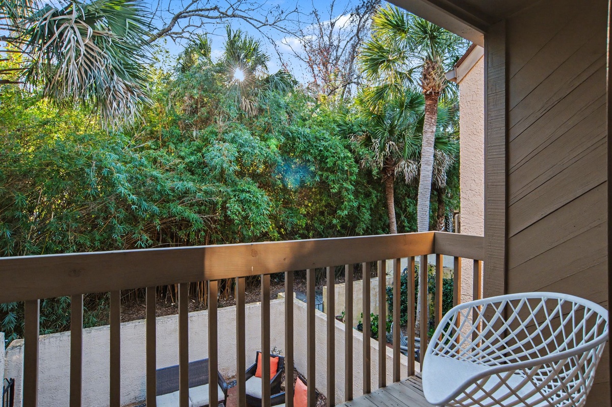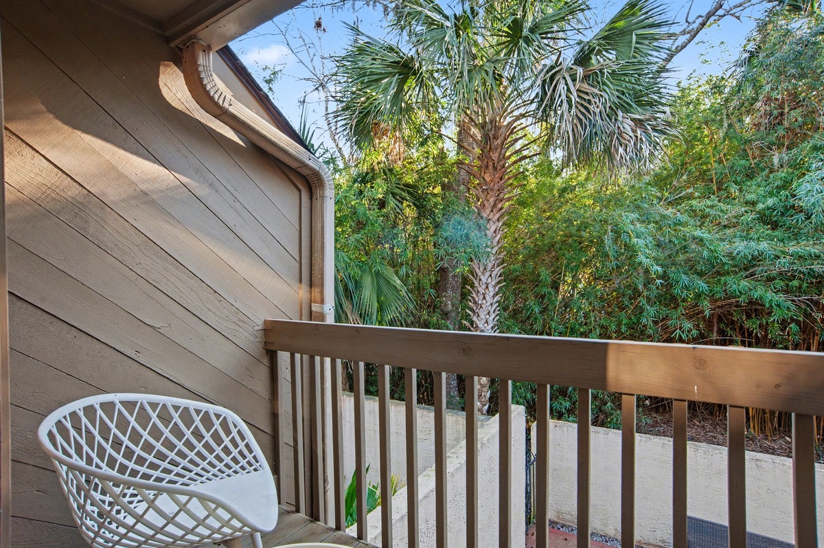 Imagine stepping into a serene island retreat where lush green palms and tropical foliage surround you at every turn! This two story condo at Hilton Head Beach Club Villas welcomes you with a sense of calm that begins the moment you enter your own private and fully enclosed courtyard. This quiet oasis offers a rare level of seclusion that feels worlds away from the bustling beach scene - with direct access to the community pool! As you move to the upper level balcony, you are greeted with sweeping views of swaying palmettos that create an atmosphere of pure coastal tranquility.