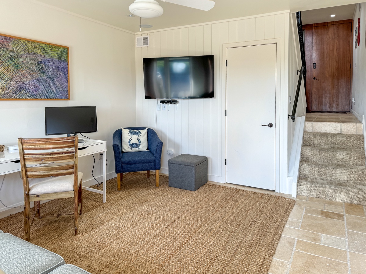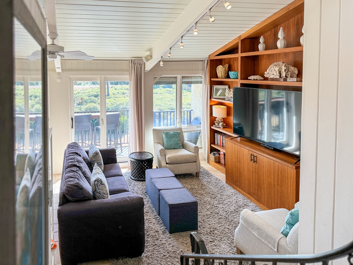 The villa features a spacious living area with large windows that provide stunning views of the ocean and plenty of natural light. The open floor plan allows for easy entertaining, with a fully equipped kitchen, dining area, and comfortable seating. The split-level design of the villa provides privacy and space for all guests.