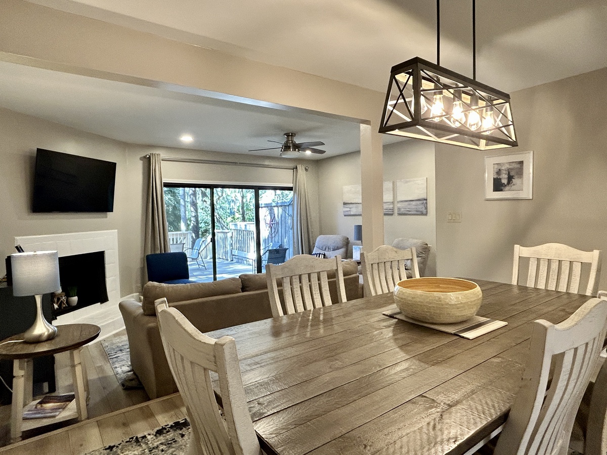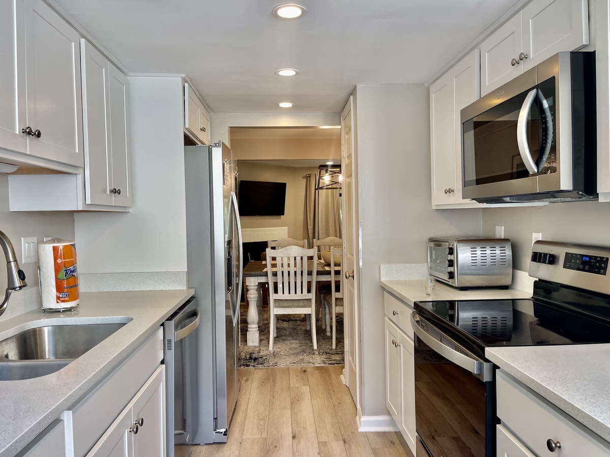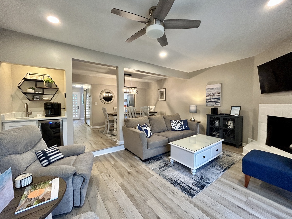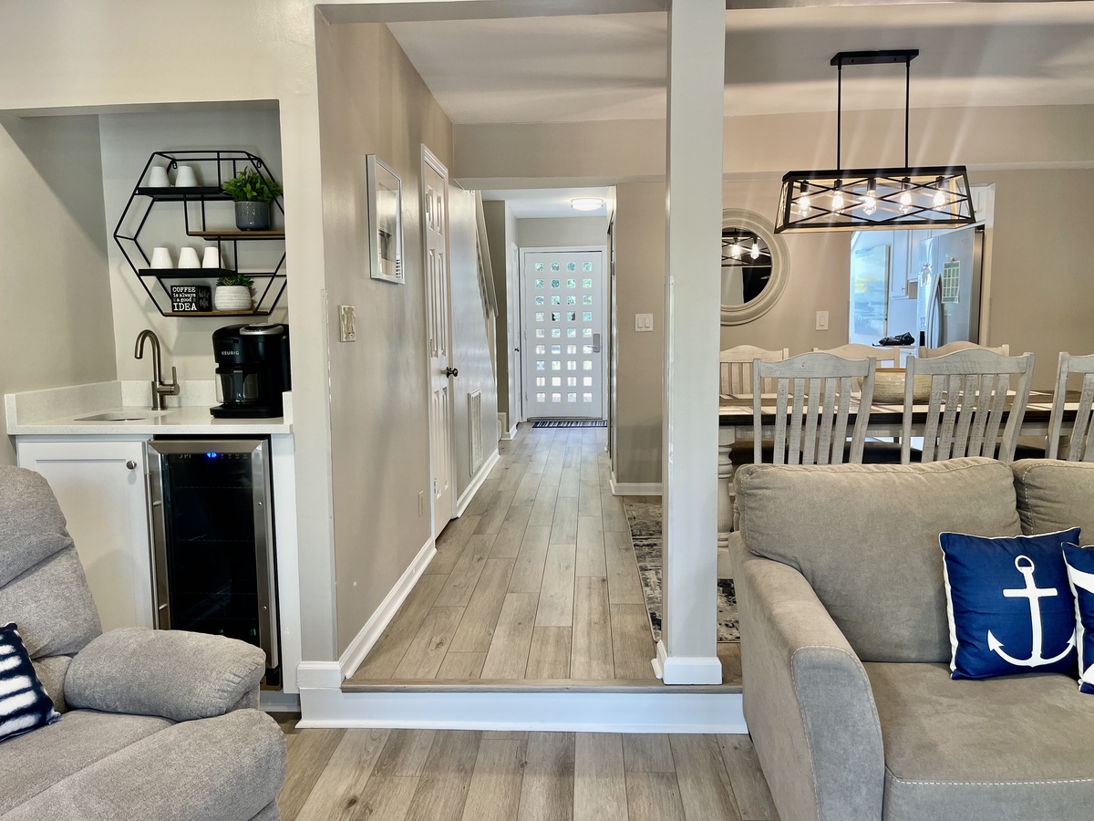 Past the kitchen is the dining area with seating for 6. Separated by a step, past the dining room, is the living room equipped with a wall-mounted Smart TV, a new wet bar with beverage refrigerator, an oversized couch, a club chair and two recliners. Sliding glass doors open to the newly designed large deck with a landscape view and plenty of space for the kids to run around. A gas grill is available for added convenience.