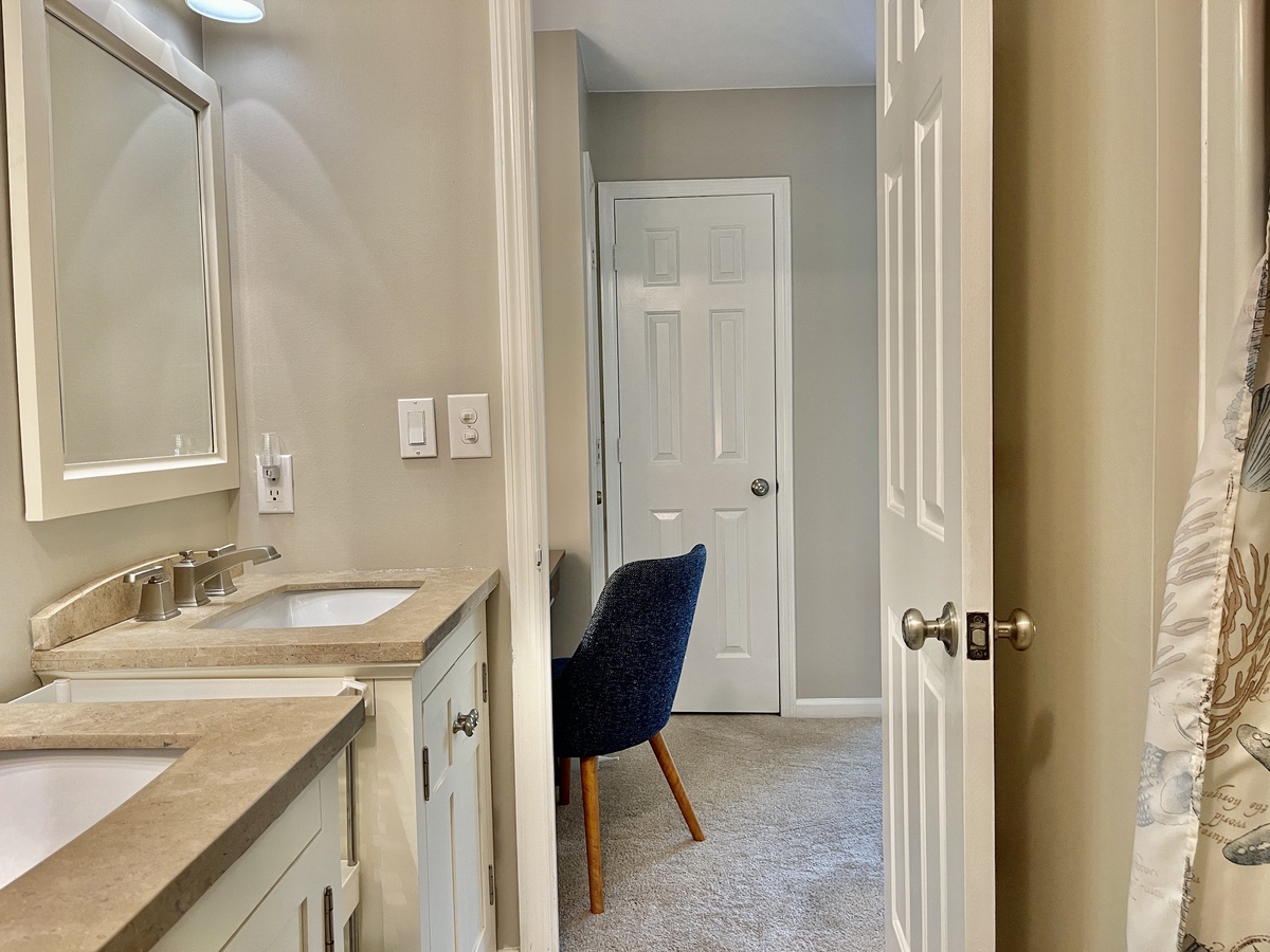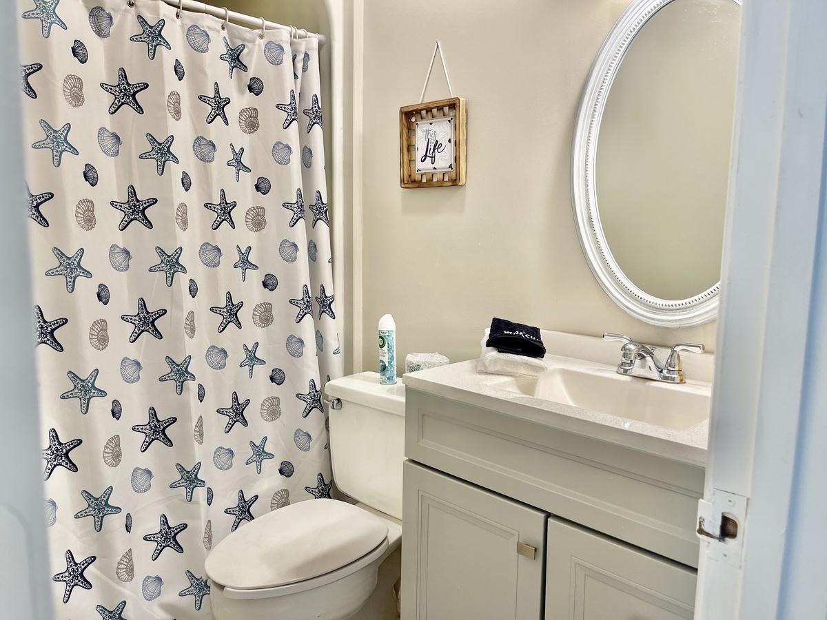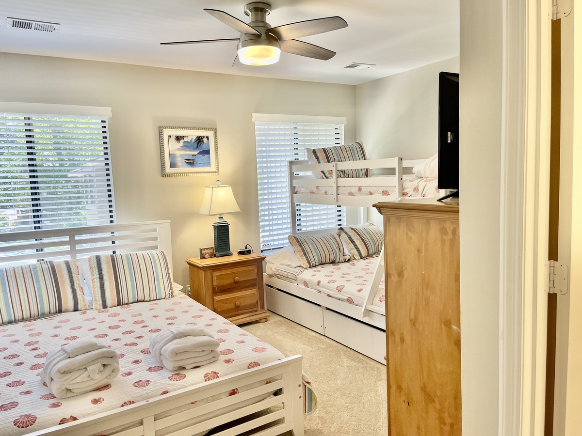 Both bedrooms and the laundry are located upstairs. The primary suite has a king bed, wall-mounted Smart TV and a recently updated private bath with double sinks and a tub/shower combination. The guest bedroom features all new furniture with a queen bed and a bunk bed with a full-size bed on the bottom and a twin bed on the top. These sturdy bunks are designed for kids and adults! This room also has a Smart TV and a renovated bathroom with a tub/shower combination, new flooring, paint and vanity area.