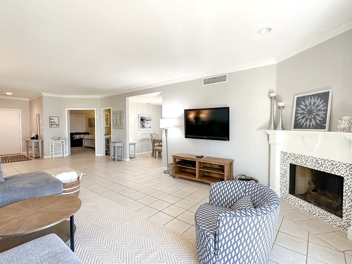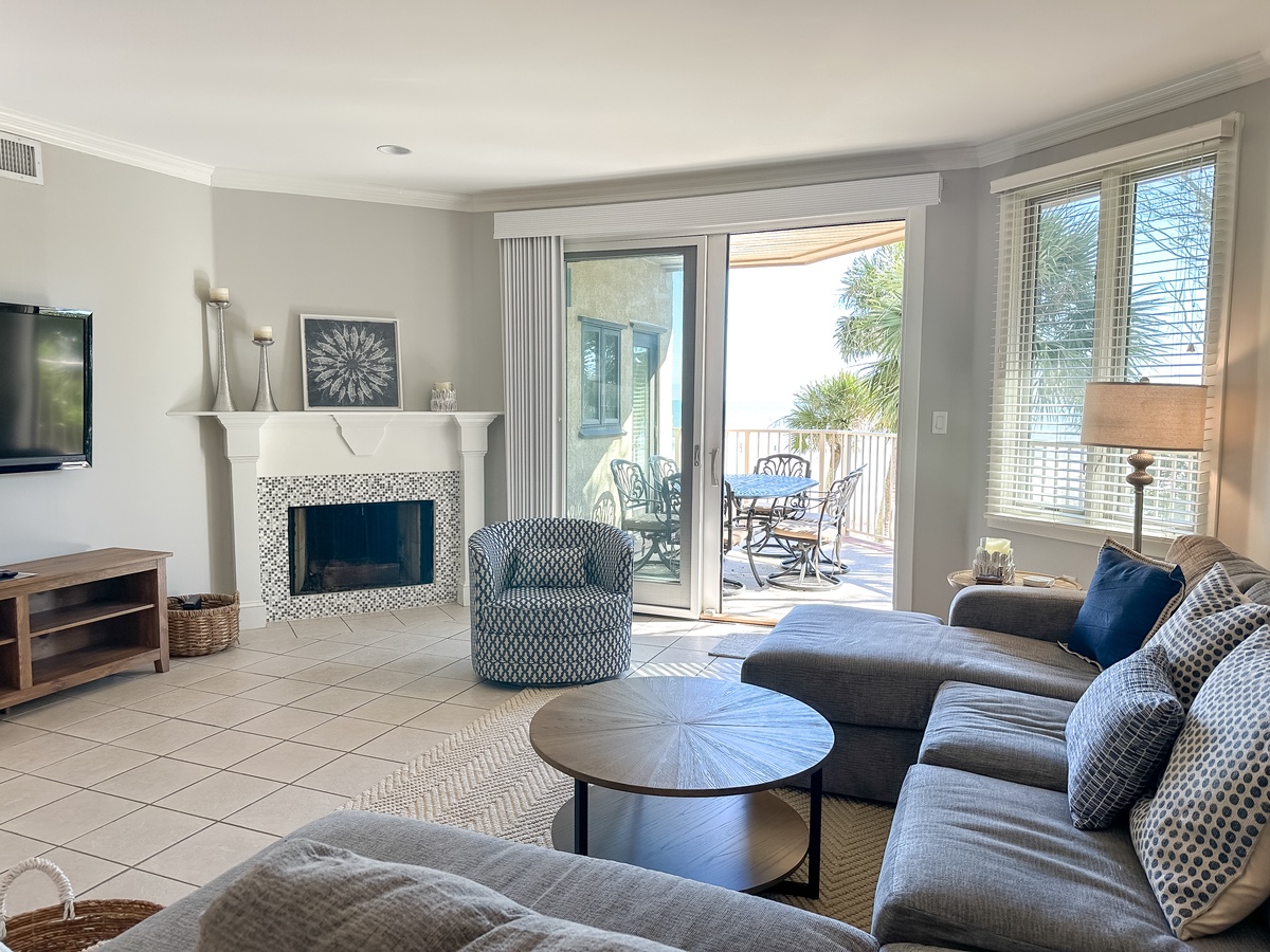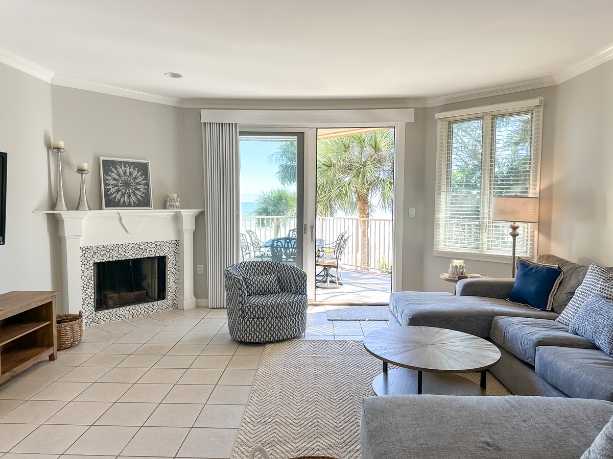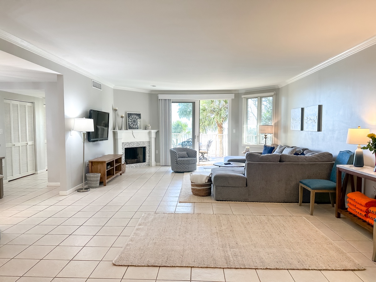 Set amongst towering oaks and palmettos, this island oasis features an open plan to enhance gatherings with family or friends. The living room with fireplace is quite spacious and can easily accommodate game or movie night. And patio sliders afford easy access to the balcony, while framing the stunning ocean views. The dining area has seating for 6 and the well-equipped kitchen has a cozy table for two. For your added convenience, there is a laundry closet with full-size washer and dryer.