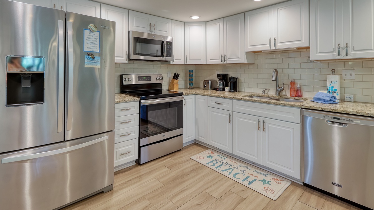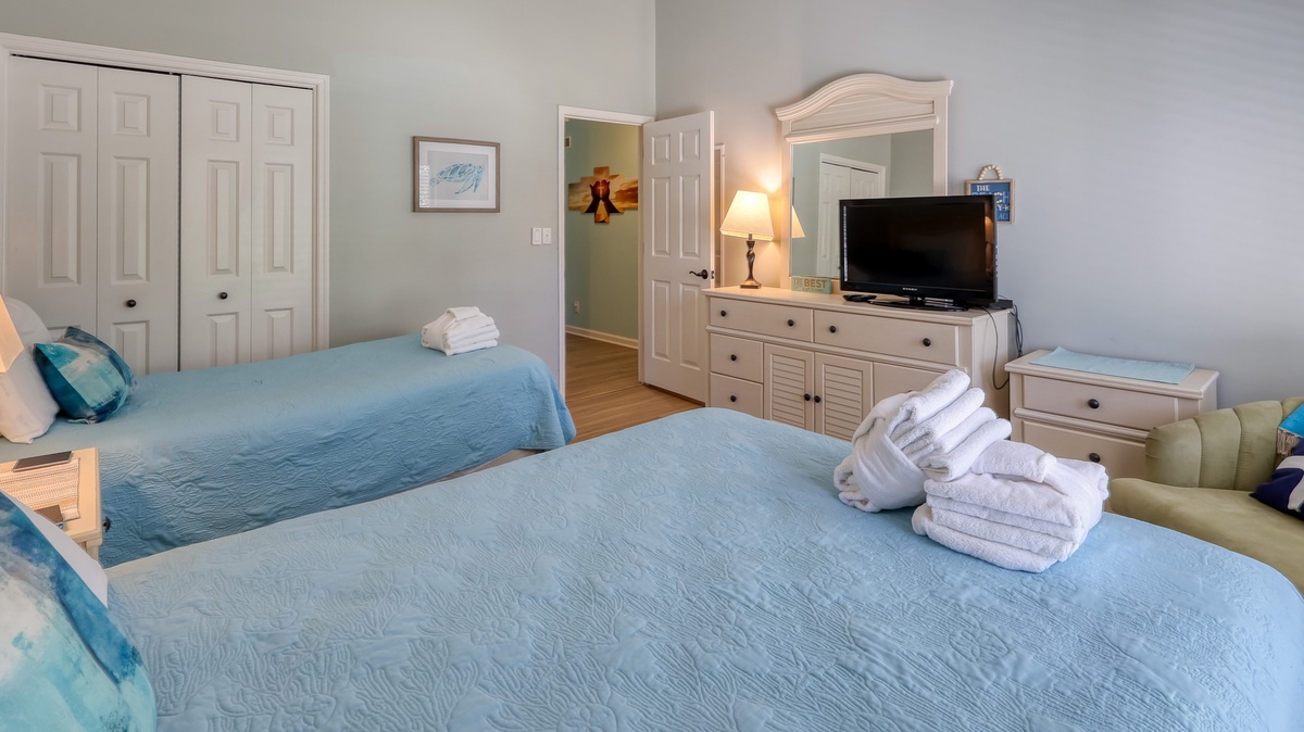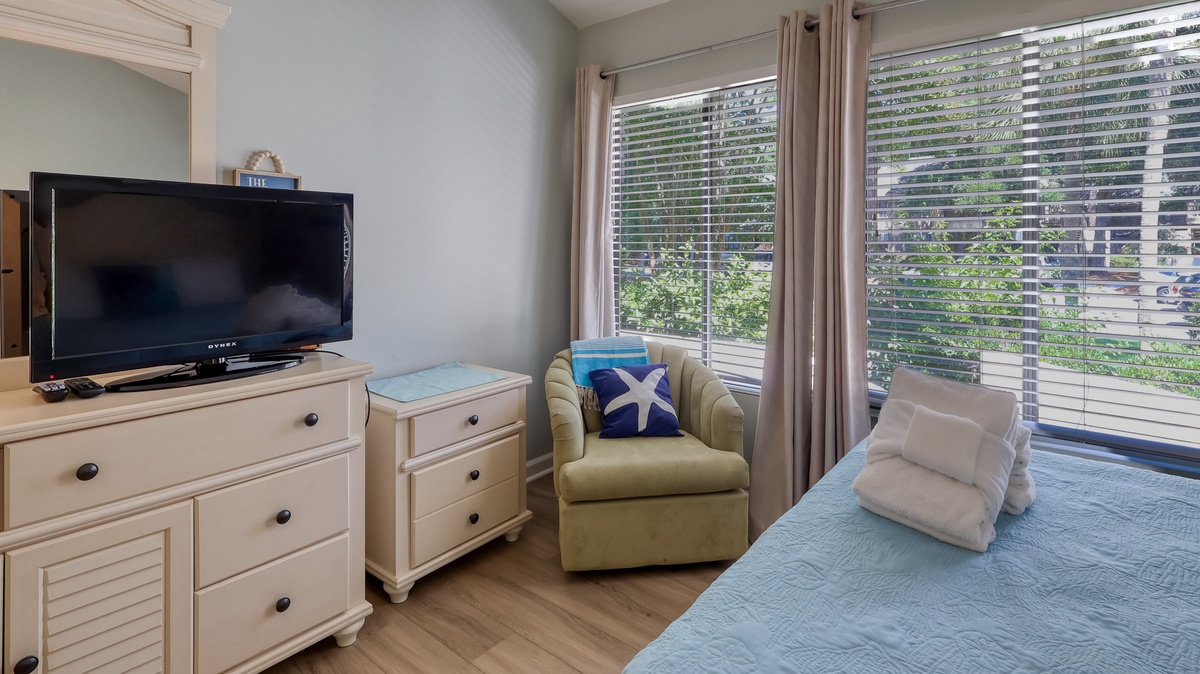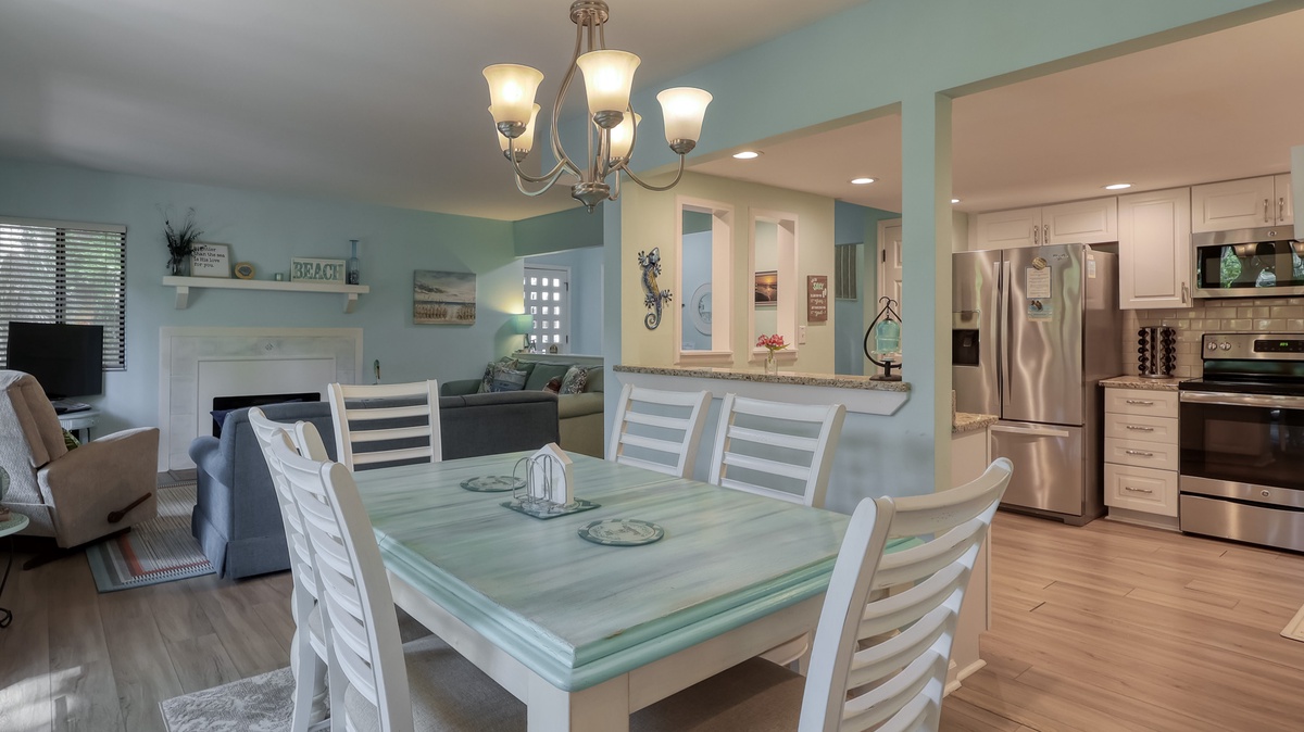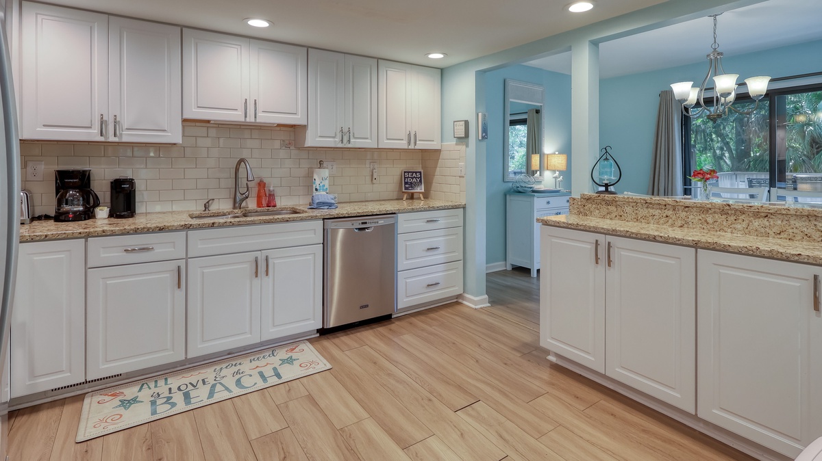 The open concept villa provides plenty of room for entertaining! Enjoy the relaxing colors of the electric fireplace, Smart TV, a new queen sleeper sofa, a comfy couch, recliner chair, and 2 barstools for morning coffee or watching the "chef of the day" prepare your favorite meal. The door wall off the dining room gives you access to the private large deck with tranquil views of palm, magnolia & oak trees with a view of the golf course. The kitchen features, granite countertops, stainless steel appliances, soft close cabinetry, coffee maker, spice-rack, dishes, outdoor grilling tools and is well-stocked for all cooking, grilling & baking needs. The dining area has seats six. Plus, a table leaf & highchair are in guest bedroom closet. The master suite features a king bed, flat screen TV and nook with a table & chairs for two. The private master bath features a large beautifully tiled walk-in shower. The guest bedroom features a queen and a twin bed, as well as a flat screen TV. The full guest bathroom features a tub/shower combination. The villa also is equipped with a full-size washer and dryer.