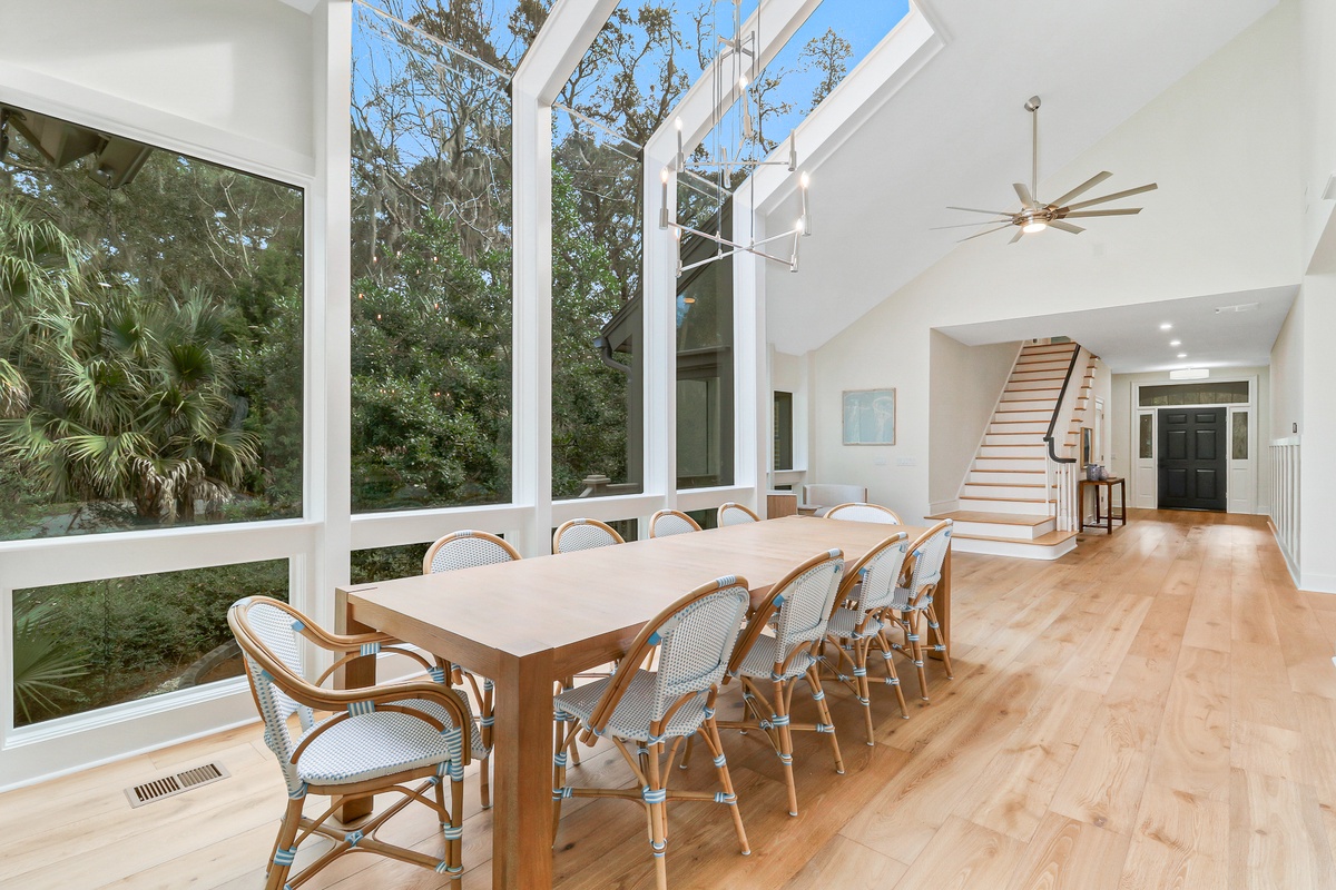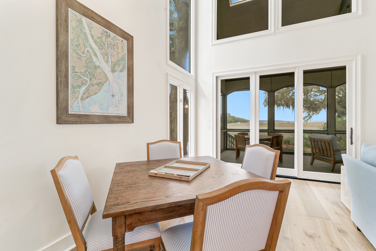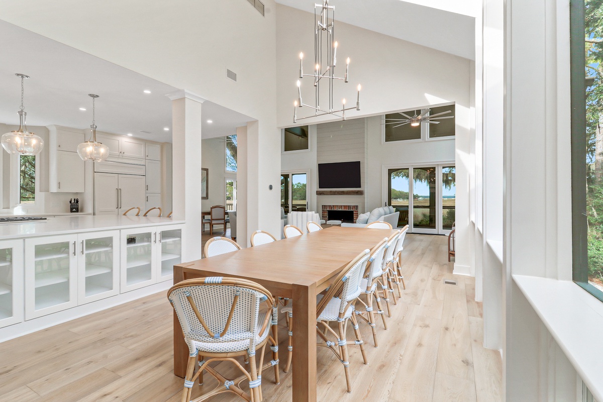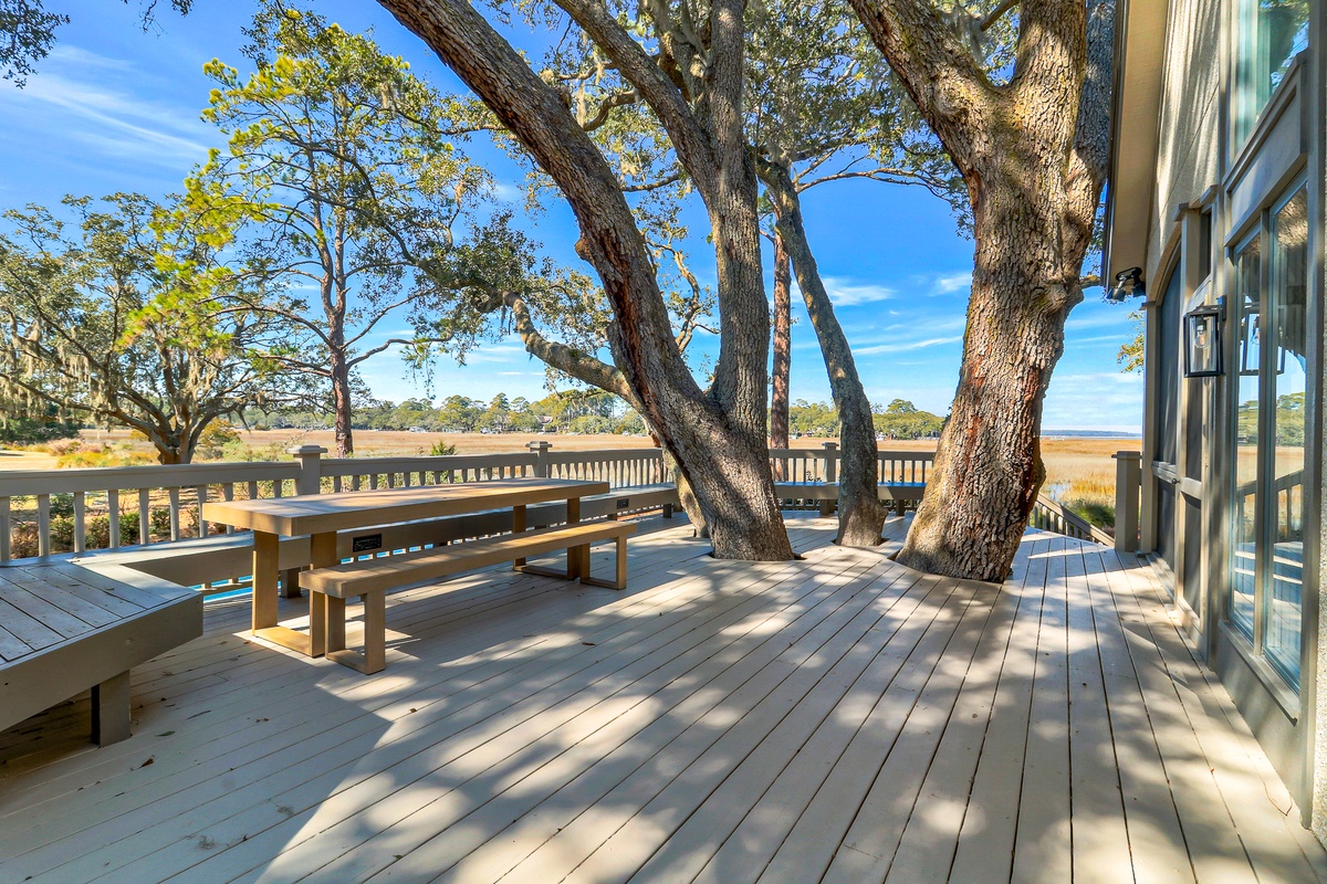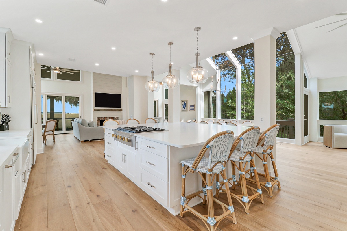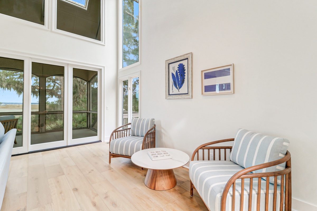 Completely remodeled from top to bottom, the home blends timeless Lowcountry architecture with refined coastal luxury. Wide-plank white oak flooring enhances the open floor plan and light-filled living spaces, making it ideal for large gatherings and relaxed entertaining. Every room has been thoughtfully updated to feel fresh, bright, and welcoming while preserving classic Southern charm. Expansive windows frame stunning water and marsh views throughout the home.