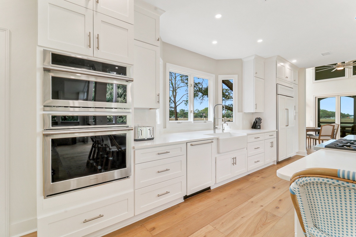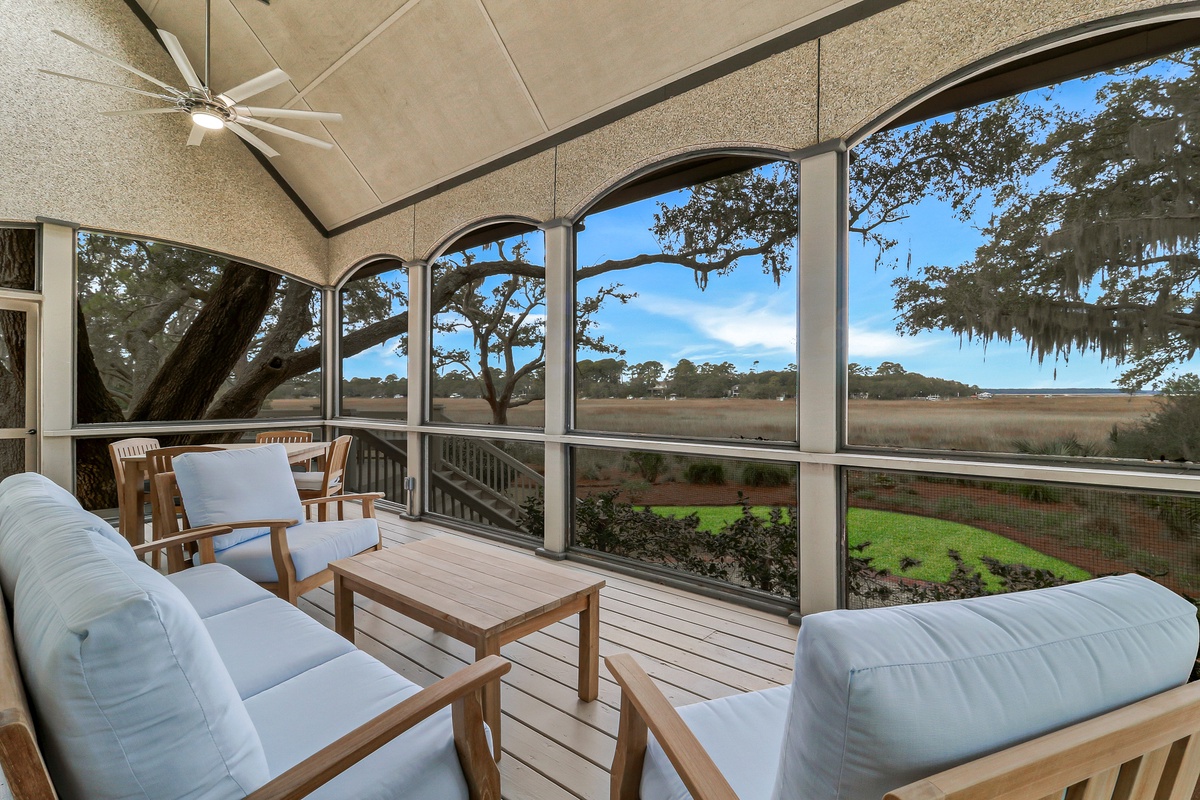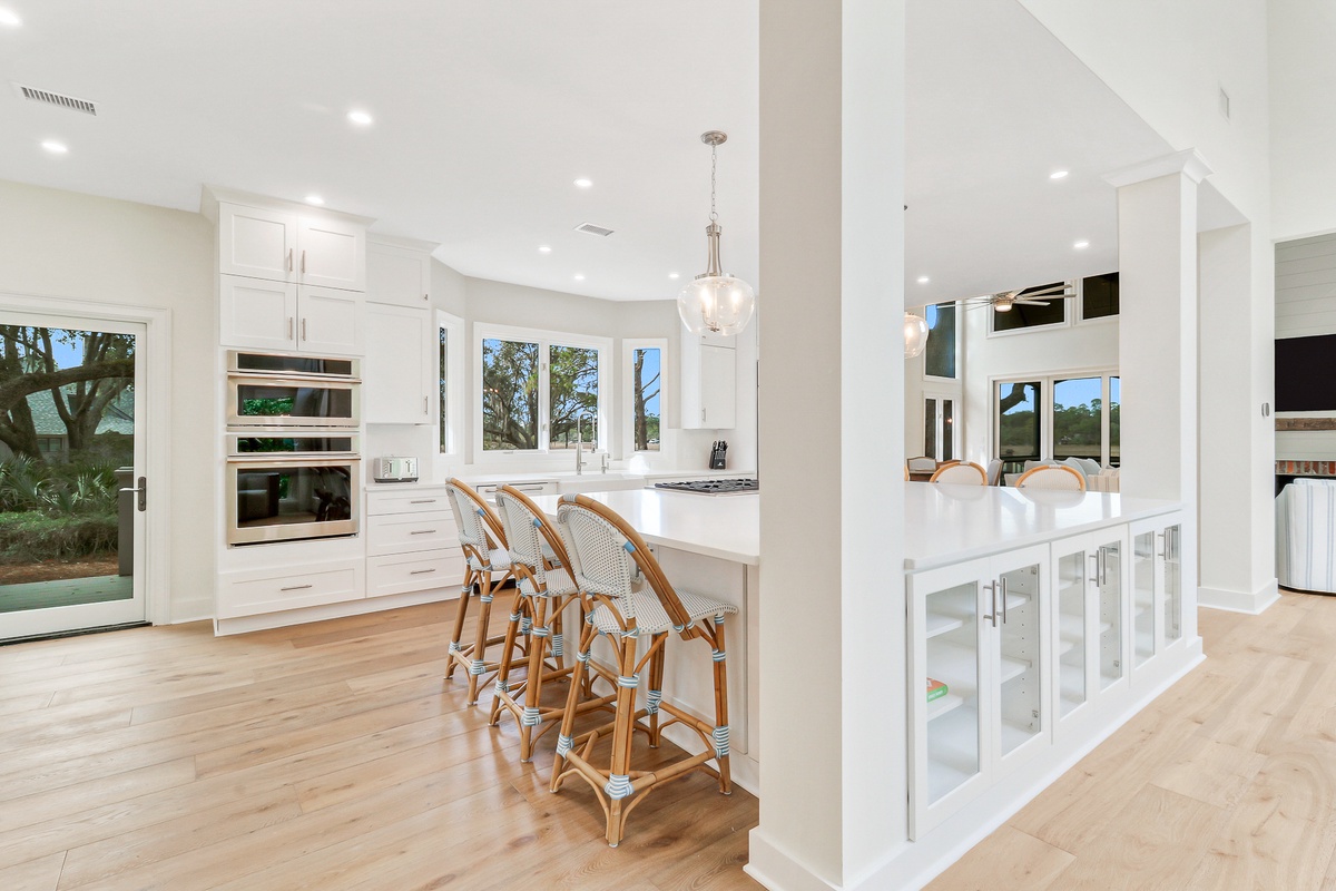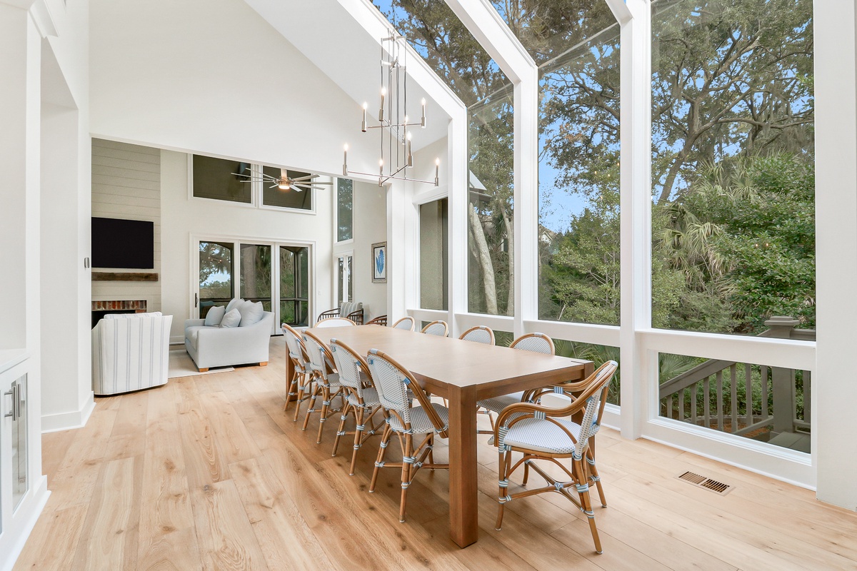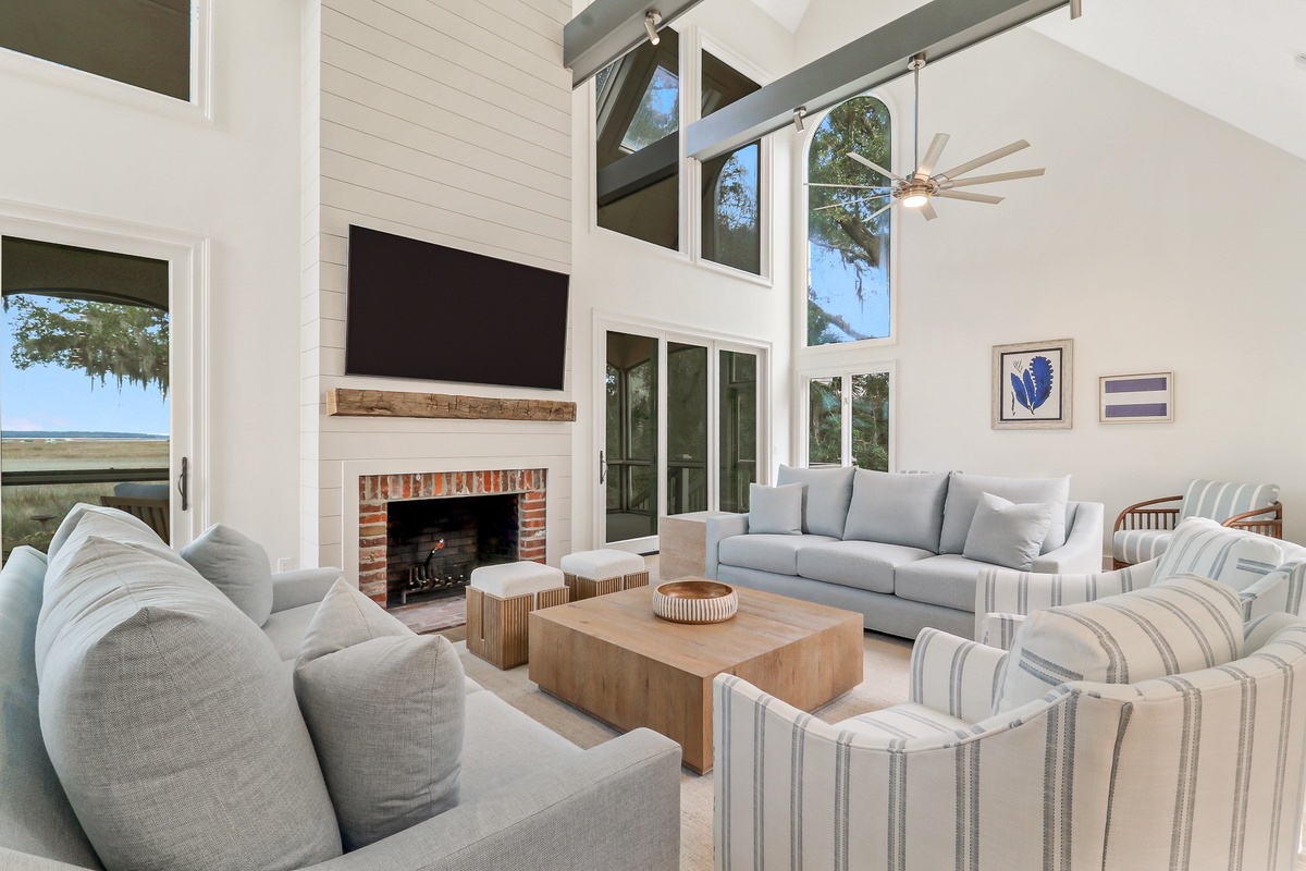 Completely remodeled from top to bottom, the home blends timeless Lowcountry architecture with refined coastal luxury. Wide-plank white oak flooring enhances the open floor plan and light-filled living spaces, making it ideal for large gatherings and relaxed entertaining. Every room has been thoughtfully updated to feel fresh, bright, and welcoming while preserving classic Southern charm. Expansive windows frame stunning water and marsh views throughout the home.