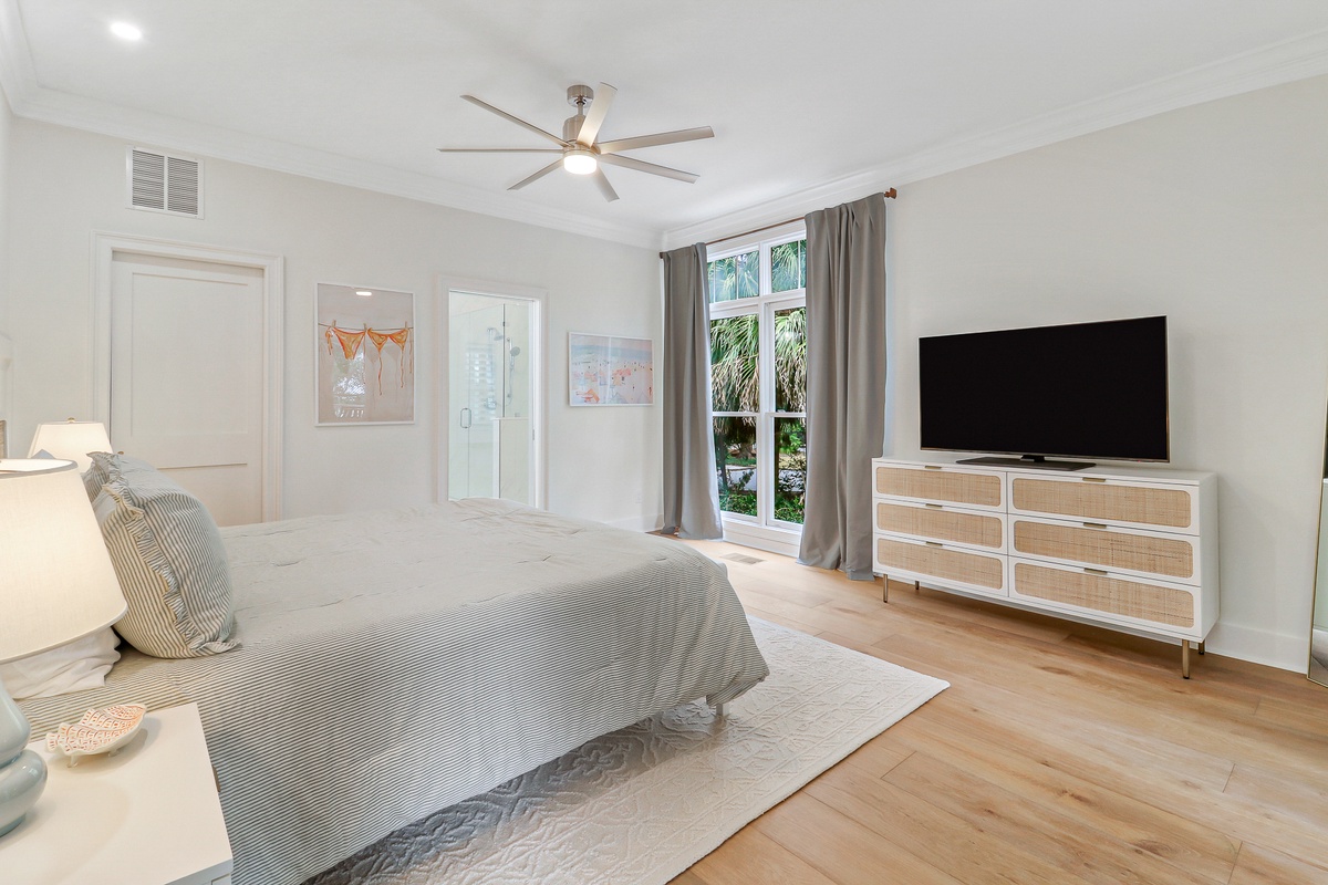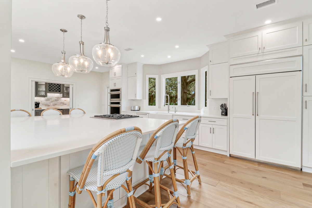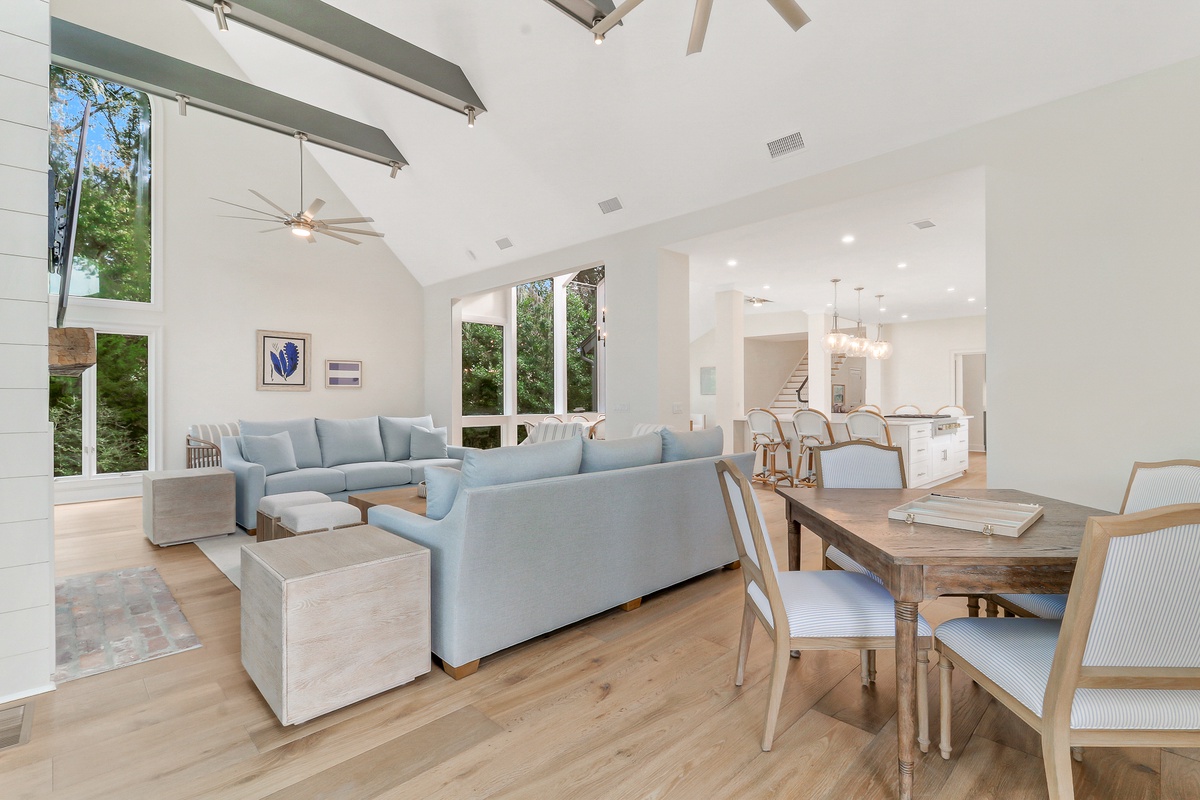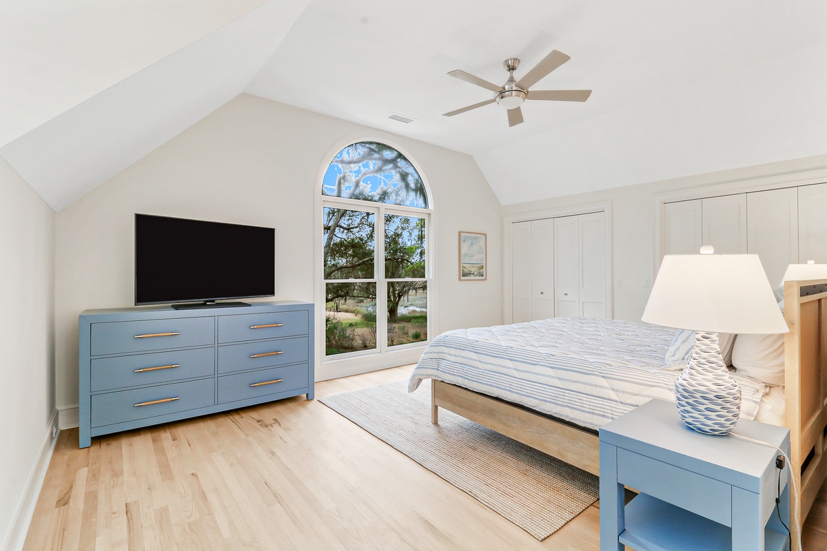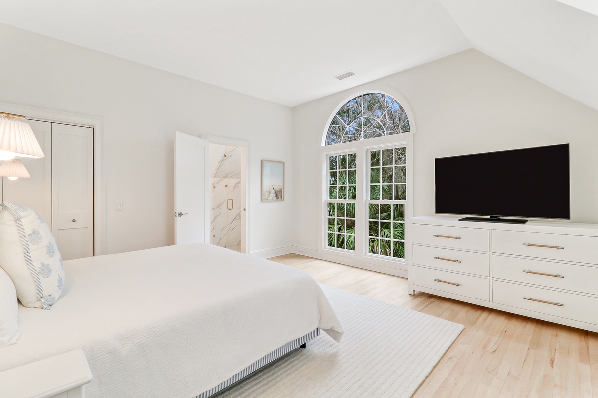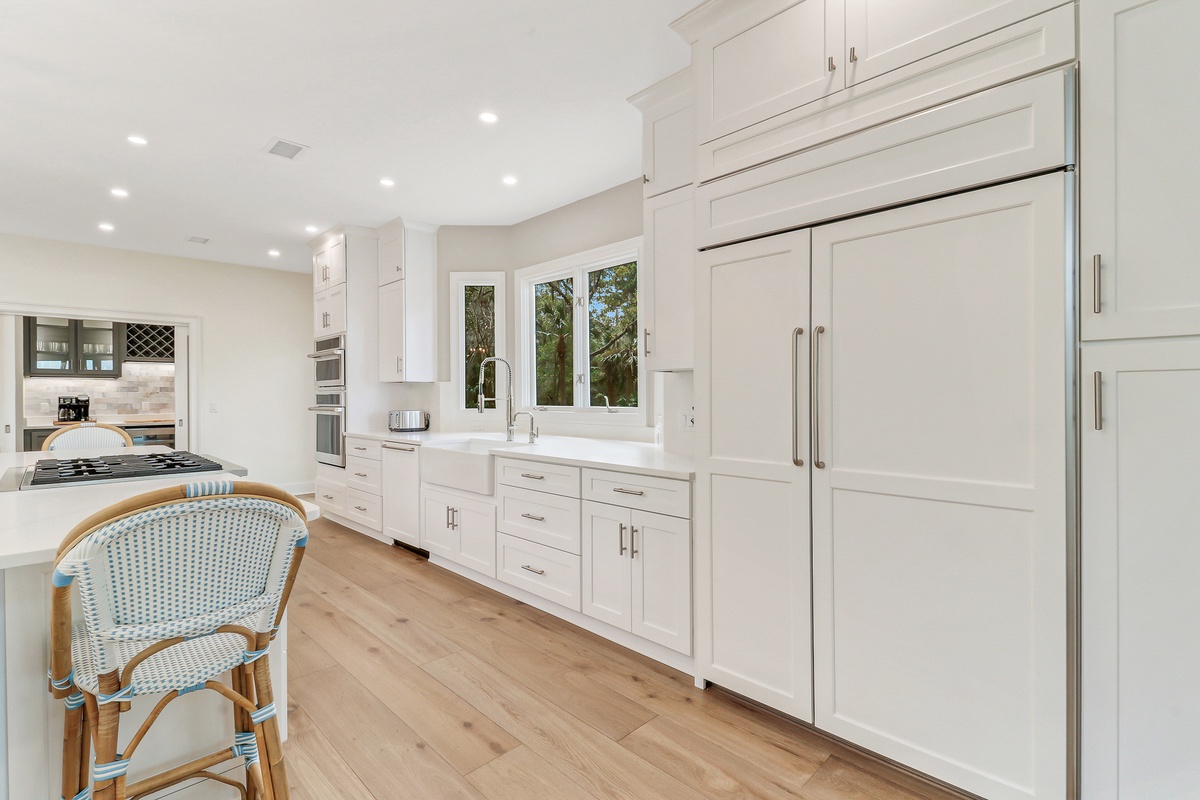 Completely remodeled from top to bottom, the home blends timeless Lowcountry architecture with refined coastal luxury. Wide-plank white oak flooring enhances the open floor plan and light-filled living spaces, making it ideal for large gatherings and relaxed entertaining. Every room has been thoughtfully updated to feel fresh, bright, and welcoming while preserving classic Southern charm. Expansive windows frame stunning water and marsh views throughout the home.