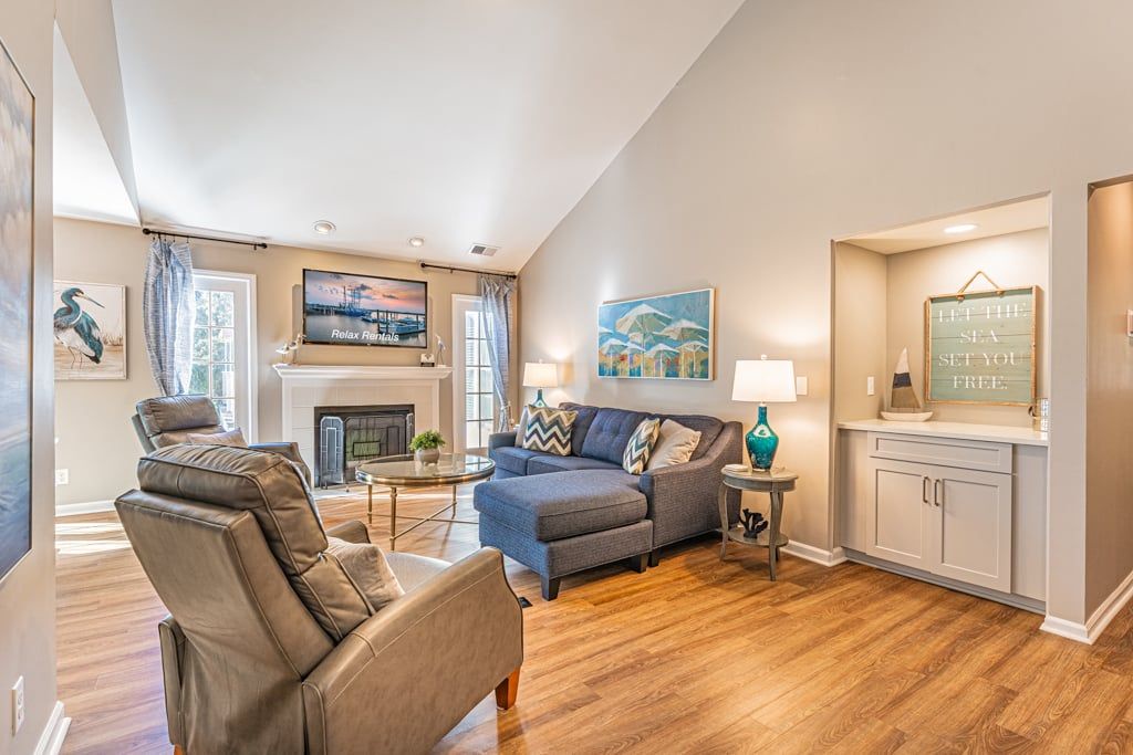Step inside to discover vaulted ceilings, abundant natural light, and a thoughtfully designed open floor plan that encourages both comfort and connection. The living area invites you to unwind by the fireplace while enjoying your favorite shows on the smart TV. Adjacent to this space, the fully equipped modern kitchen features sleek appliances and ample counter space, making meal preparation a joy. The adjoining dining area welcomes laughter-filled meals and lingering conversations, while a dedicated beverage bar complete with wine cooler, sink, and ice maker ensures entertaining is effortless.