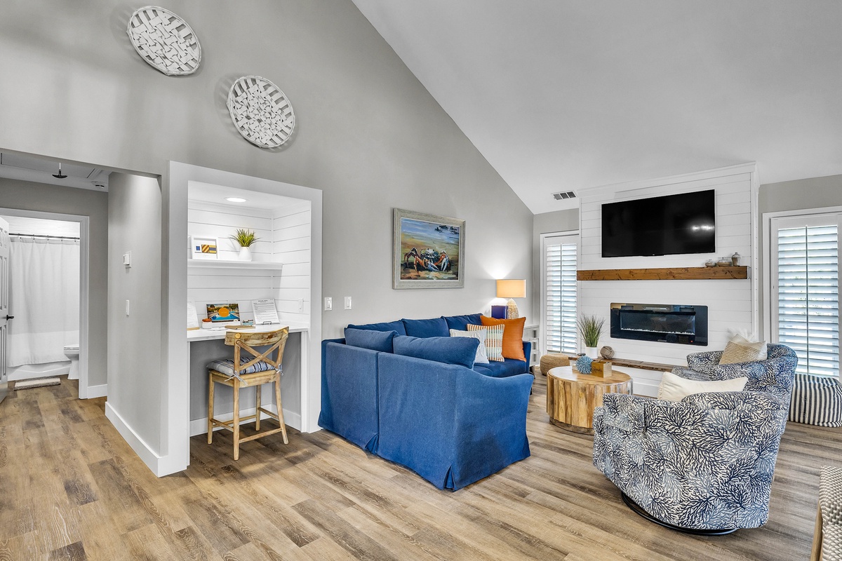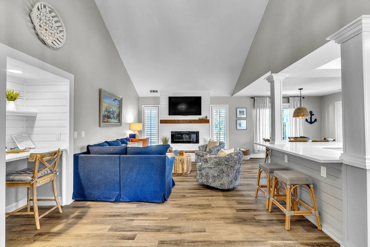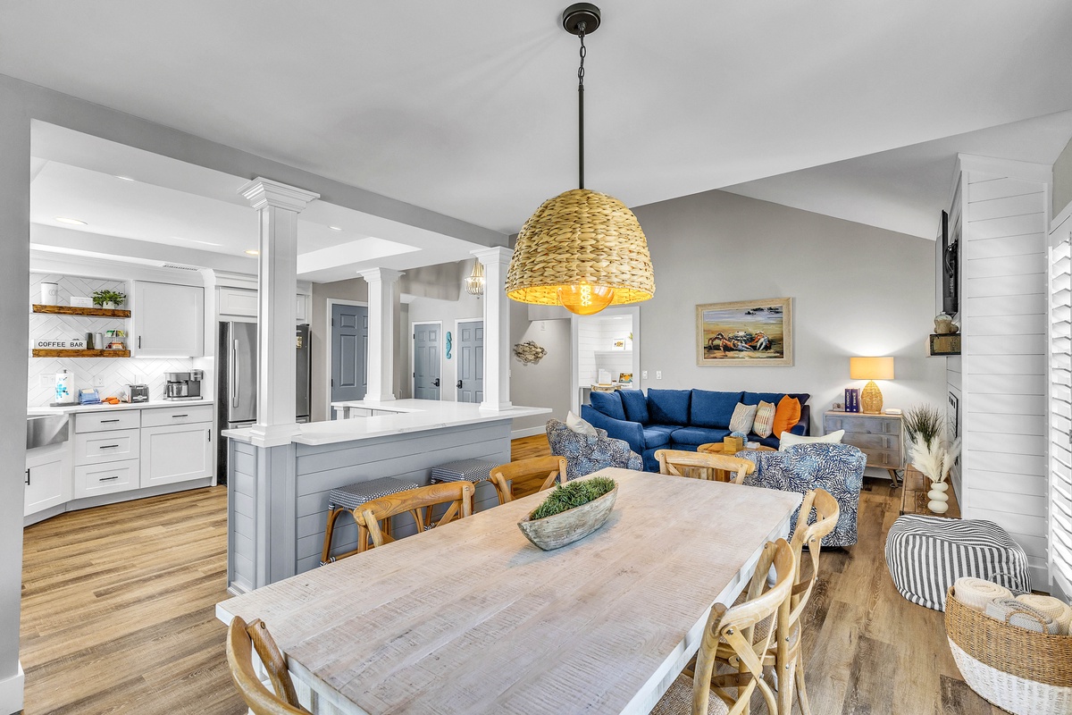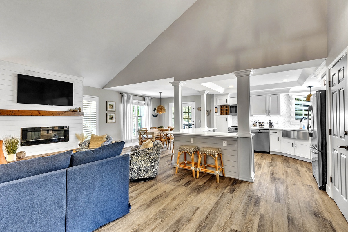 - Sizeable, open living/dining/kitchen space, outfitted with Pottery Barn furniture, counter seating for 4 and formal table seating for 6