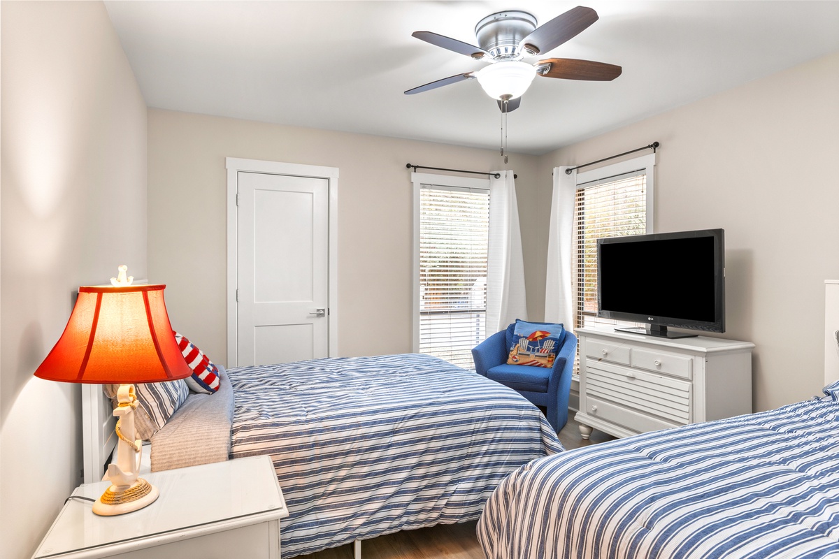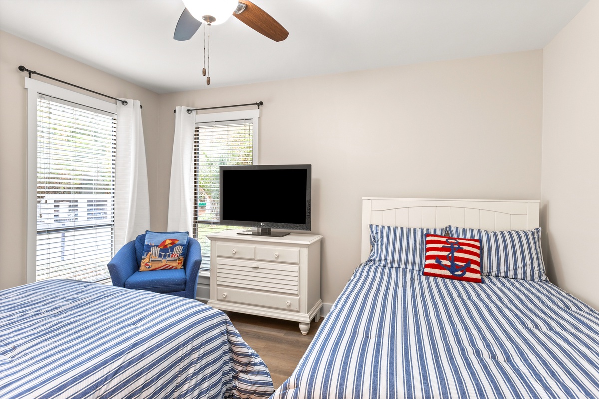 The sleeping arrangements are ideal for families or groups traveling together, offering both privacy and comfort. The primary suite features a king bed, calming neutral tones, and a peaceful atmosphere perfect for unwinding after a full day on the island. A guest bedroom with double beds and nautical accents provides a cheerful and inviting space for additional guests. Every room is designed to feel light, comfortable, and effortlessly coastal, making it easy to relax and truly enjoy your stay.