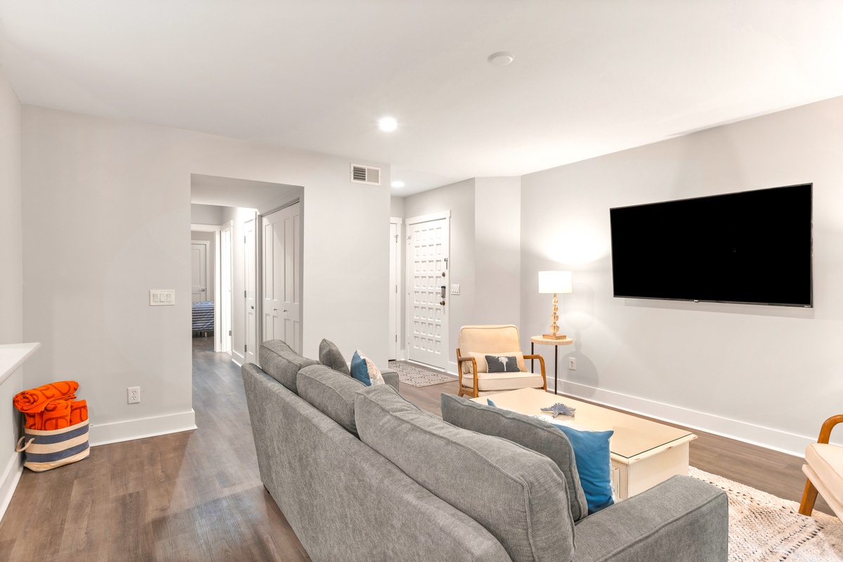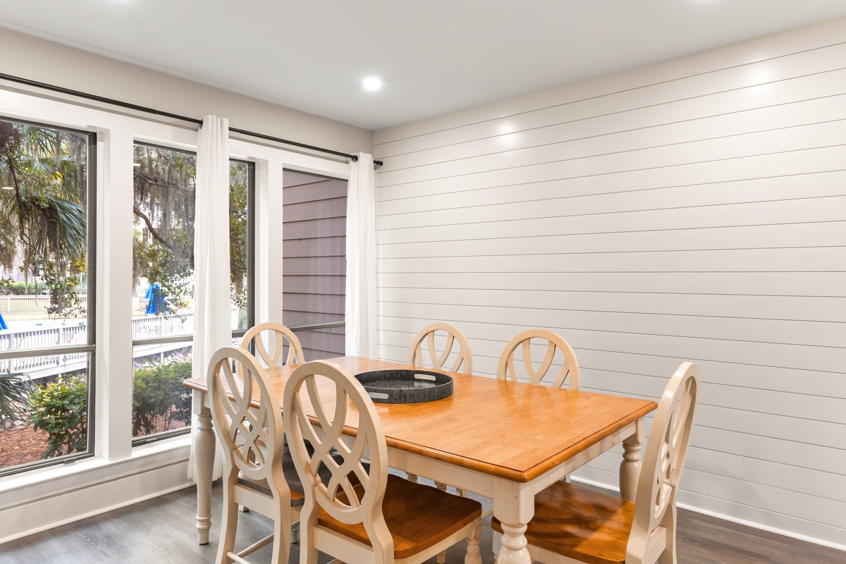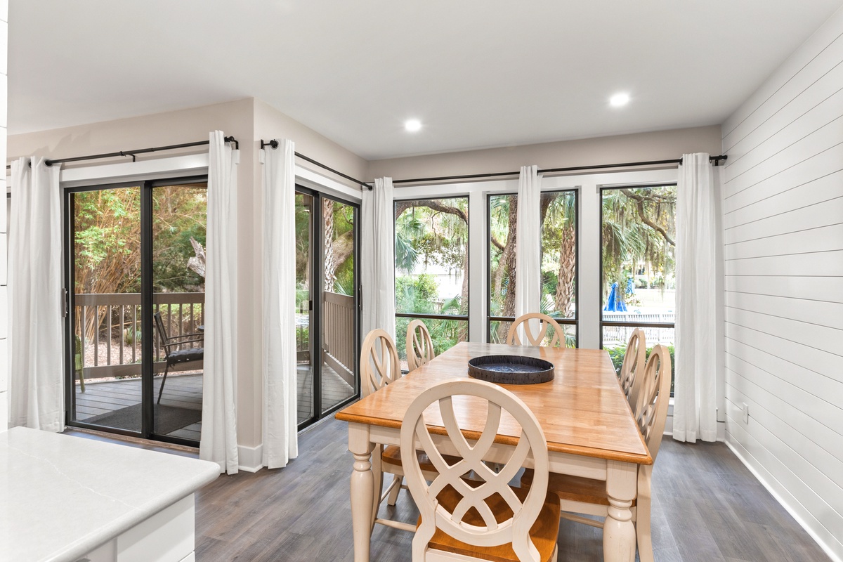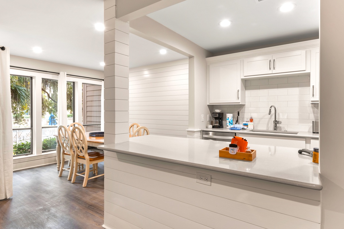 Inside, the open living space is thoughtfully designed for comfort and connection, blending relaxed coastal décor with modern updates. Large sliding glass doors lead to the balcony, creating a seamless indoor outdoor flow that brings the outdoors in. The fully equipped kitchen features clean white cabinetry, ample counter space, and everything needed to prepare meals after a day at the beach or courts. Just steps away, the dining area offers a cozy spot for shared meals, game nights, or planning the next day’s adventures.