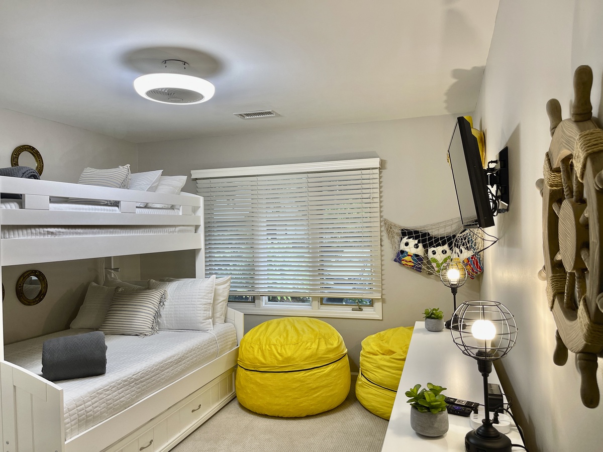 This music-lovers delight comfortably accommodates a family or group of 8 with plenty of space to 'Twist and Shout' and feel 'Free as a Bird'. The primary suite, or "All You Need is Love" Suite has a king bed with en-suite bathroom. The second bedroom, "Imagine", also features a king bed and shares a bathroom with the "Yellow Submarine" room that features a twin-over-full nautical-themed bunk bed as well as a pull-out trundle bed. This home also features a laundry room with ample space to fold your clothes 'With a Little Help from Your Friends'.