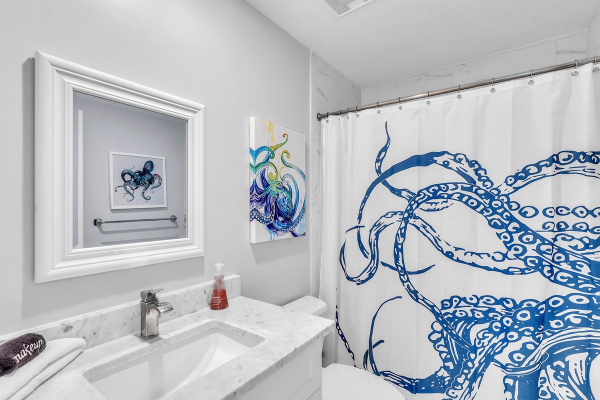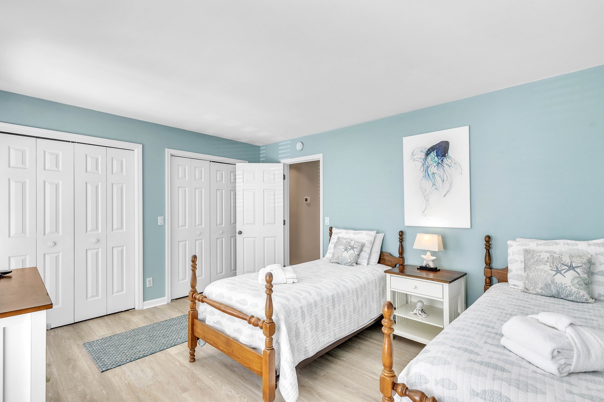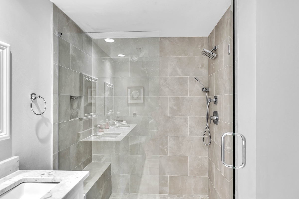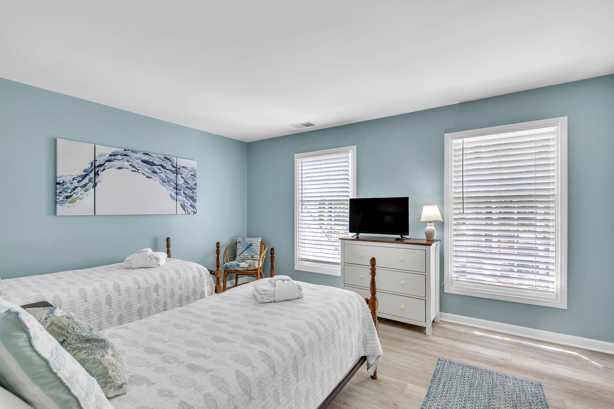The primary bedroom features a King bed, flat screen TV and newly updated private bathroom with standalone shower. This bedroom is located on the corner of the villa with large windows providing ample natural light. The second bedroom provides 2 twin beds, flat screen TV, storage closet, and access to a full bathroom with shower/tub combination.