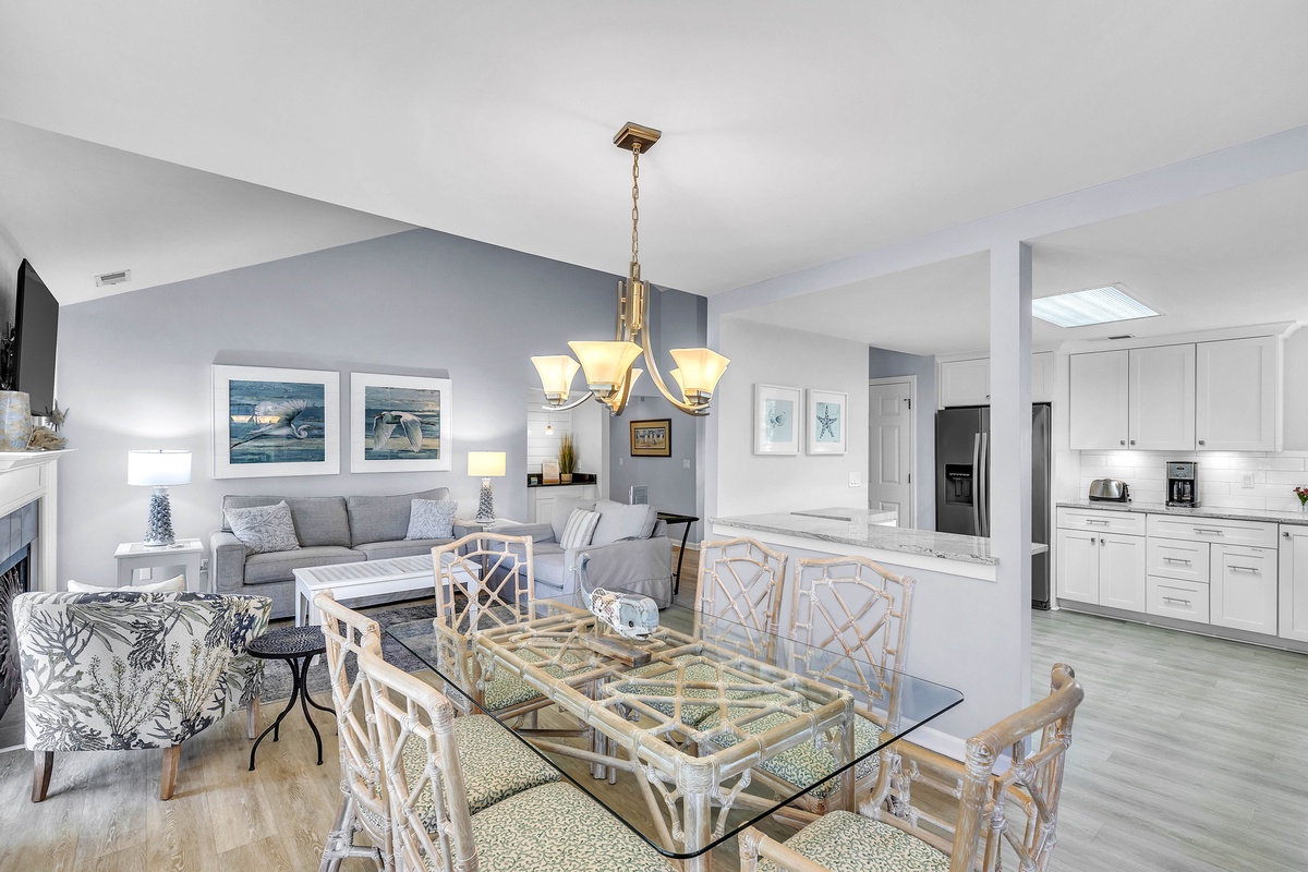 The delightful open plan includes a well-equipped kitchen perfect for preparing snacks for the beach or meals to enjoy in the dining area with table for six. Upon entry, you walk up a set of stairs to all living areas. The property flows into the living area complete with a comfortable sleeper sofa, large flat screen TV, coffee table, and additional seating to relax in front of a movie or discuss plans for tomorrow. Glass doors open to your private balcony with golf and water views; perfect for enjoying your morning coffee or evening cocktail.