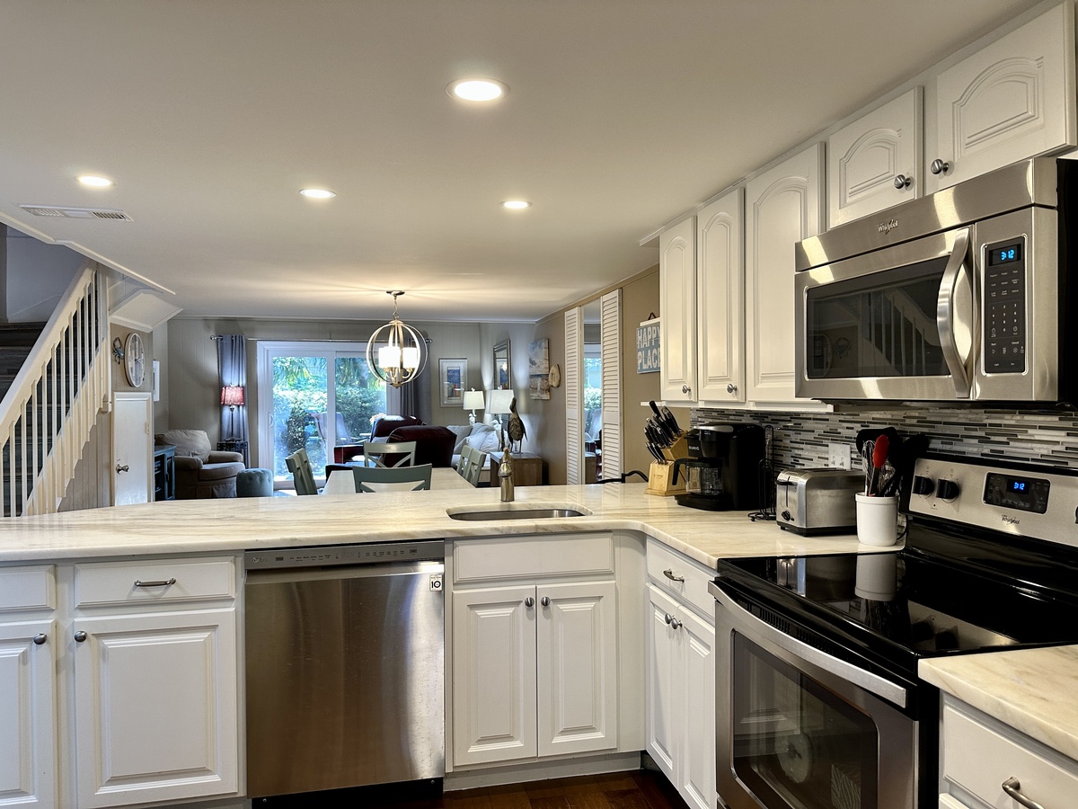 Enjoy this newly renovated 2-bed 2-bath end-unit where everything is new, from the flooring to the new furnishings. Your party of six will find this comfortable coastal oasis much to their liking. The main level features a fully stocked kitchen complete with full-size washer and dryer for your convenience, a lovely dining area, and living room with sliders leading to a private patio with gas grill and convenient access to the pool and the soft white sands of the beach.