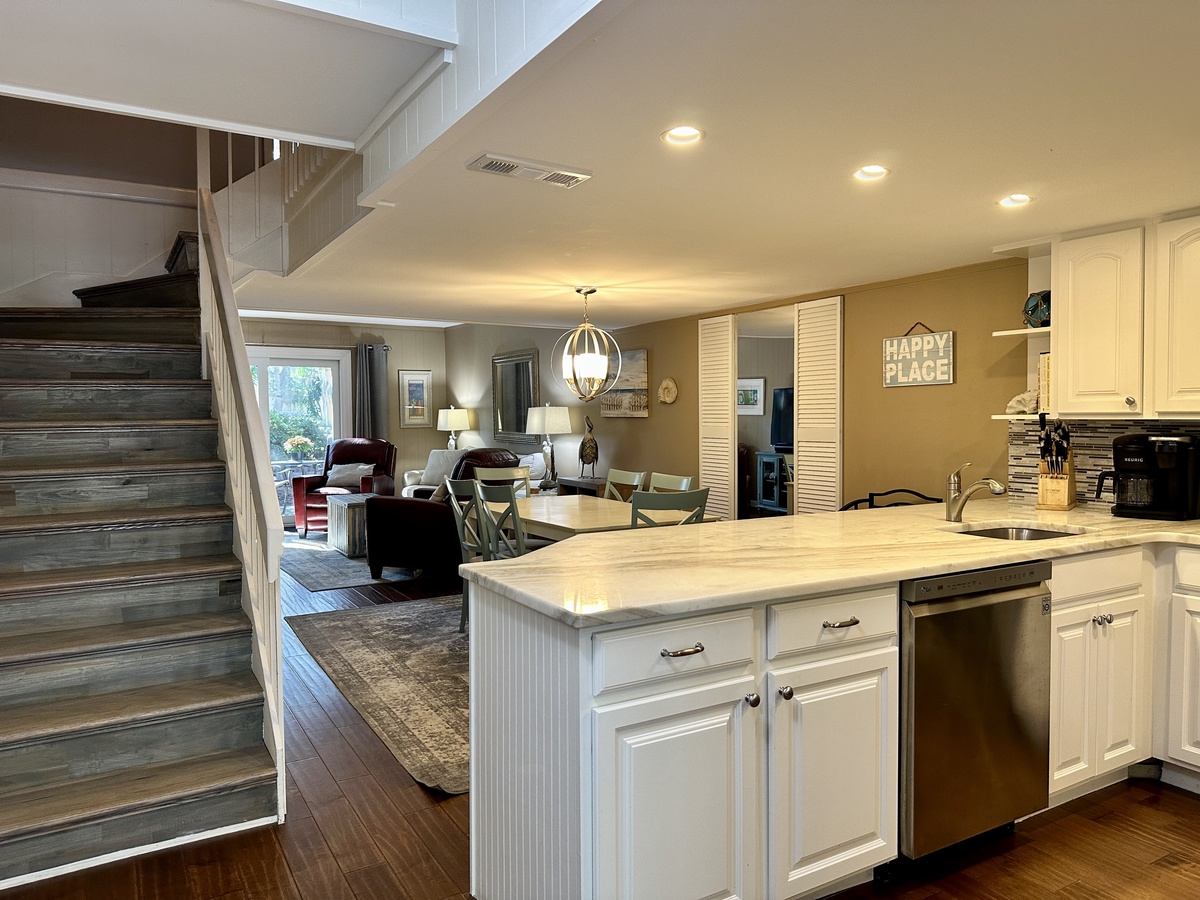 Condo was beautiful with top of the line appliances. Everything you need in is there. The community pool is right by the back patio, but FYI for families with small children, the shallow end is about 3 feet deep. Little ones can't stand at all, and there is only one small area for stairs. The beach is a short walk away, easy enough to cart kids and gear without an issue, and run back for bathroom breaks if needed. The condo community was under construction during my stay, and it was difficult to see where to turn. Construction was quickly showing progress, and we heard nothing all week! Parking is easy, right in front of the condo with a visitor spot right next to it. Keyless entry was easy and helpful as to not need to remember grabbing a set of keys on the go. The stairs going up could use an extra railing on the other side where it turns up for anyone unsteady or little ones. Bedrooms gorgeous and beds comfortable. Kitchen, dining and living room are great! We had a plumbing issue the first night, and water leaked from the upstairs shower to the downstairs, but maintenance answered the call right away (11pm) and had someone come first thing in the morning. Issue was fixed quickly and the company provided an apology, gift card for dinner and cookies. Everyone was very kind and helpful, and I would definitely recommend and use again. Wish my own house looked like this!Amy M. - Posted: 4/21/2021