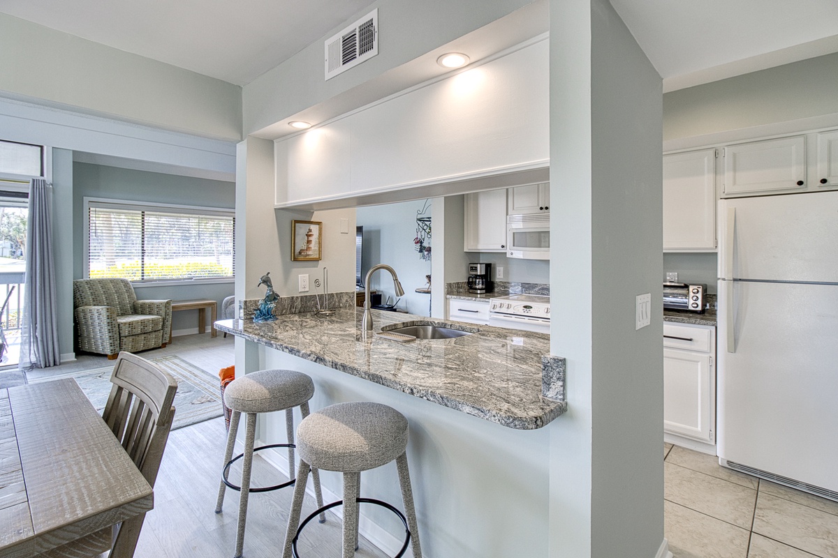 Shopping, dining, and grocery store are about a 15 minute bike ride away (using the provided bikes-great bonus amenity). 2 minute walk to the pool and about a 30 minute bike ride to popular Coligny Beach. We enjoyed coffee on the patio overlooking the golf course in the morning. The condo was clean and comfortable but needs new carpet or flooring in the bedrooms and a little updating. It is located in a beautiful neighborhood.Jeff W. - Posted: 9/8/2021
