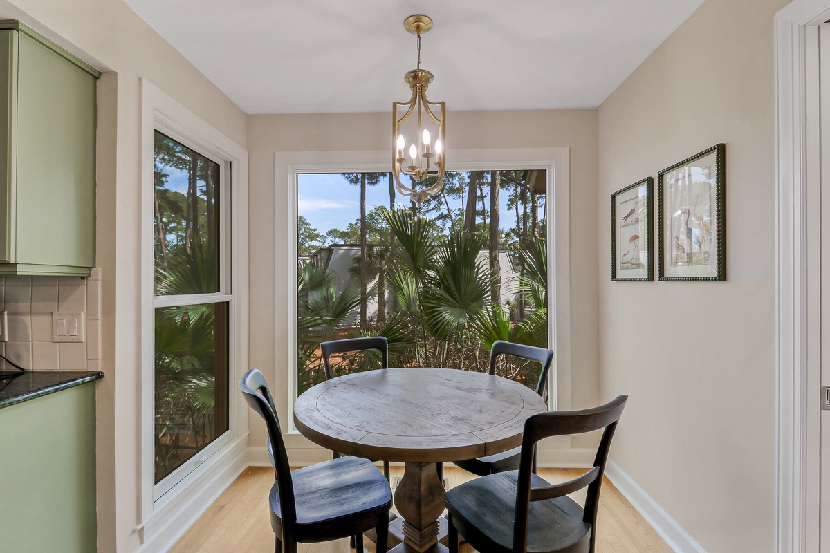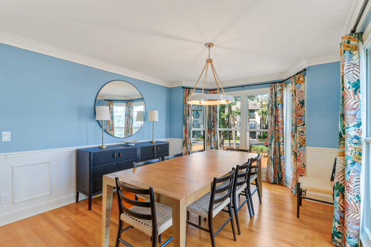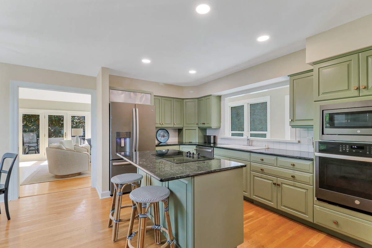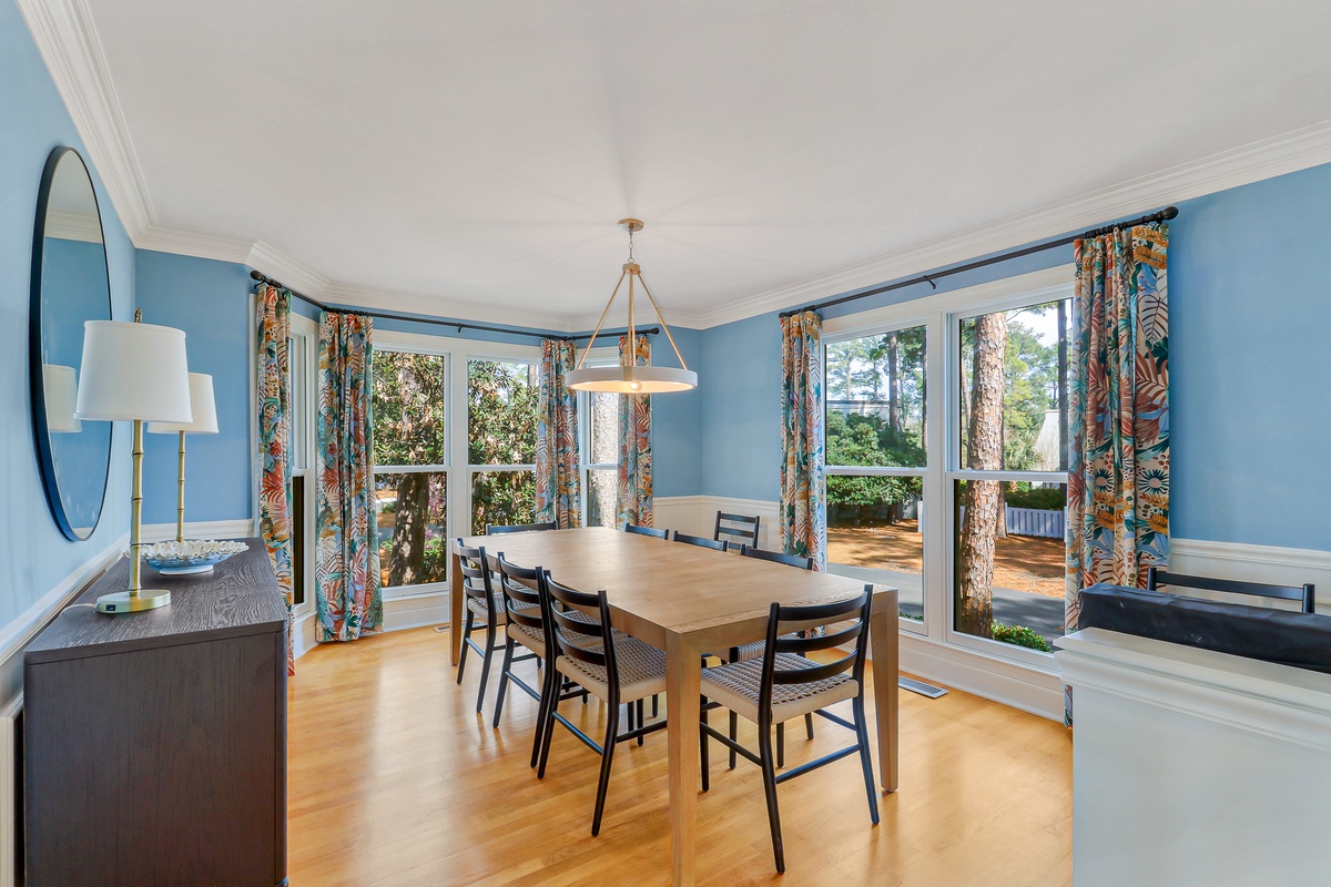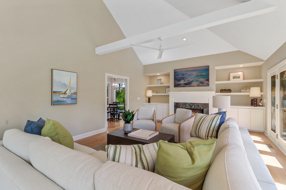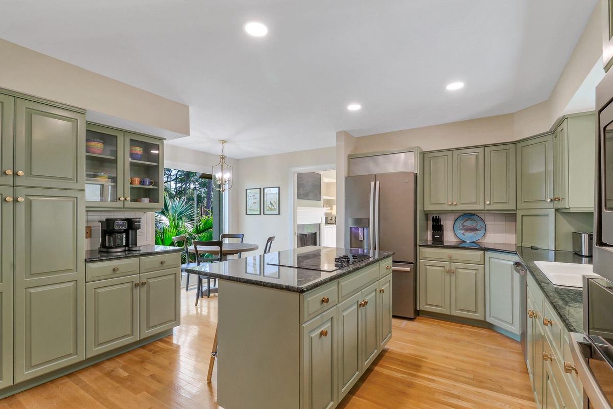 Inside, more than 3,000 square feet of beautifully updated living space unfolds with natural light, warmth, and effortless flow. Hardwood floors, smooth ceilings, and expansive windows create a bright and welcoming environment ideal for gatherings after a day of golf, sailing, or beach time. The open living area connects seamlessly to the dining space and kitchen, forming the heart of the home where meals and memories are shared. The kitchen features granite countertops, rich cabinetry, and generous workspace designed for both casual breakfasts and elegant evening entertaining.