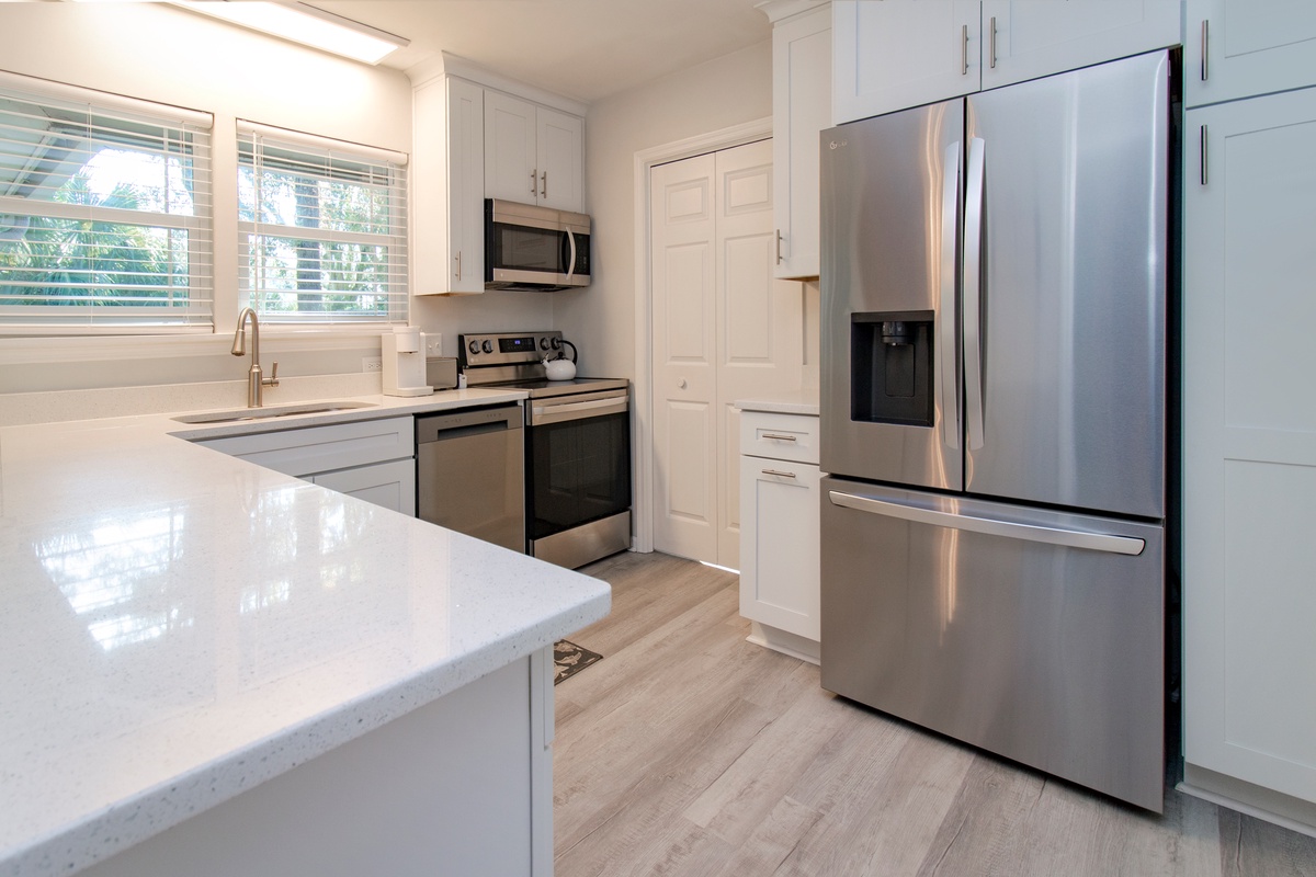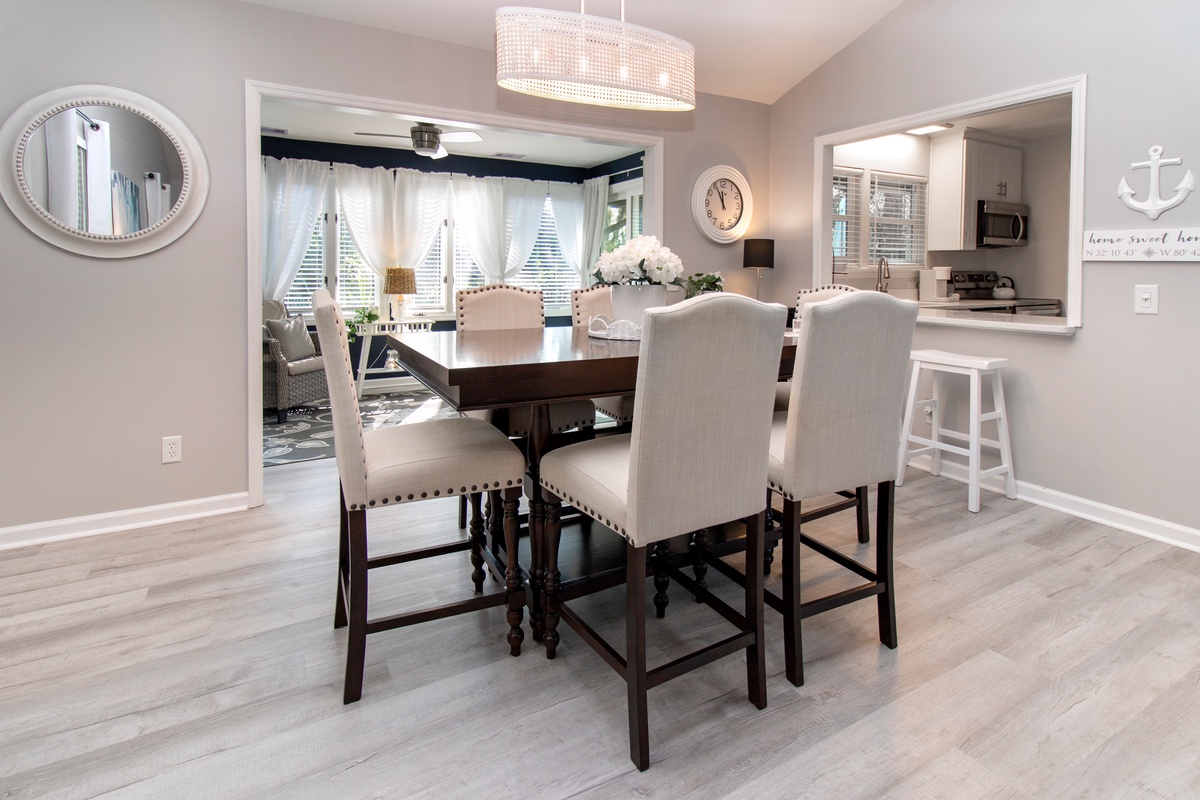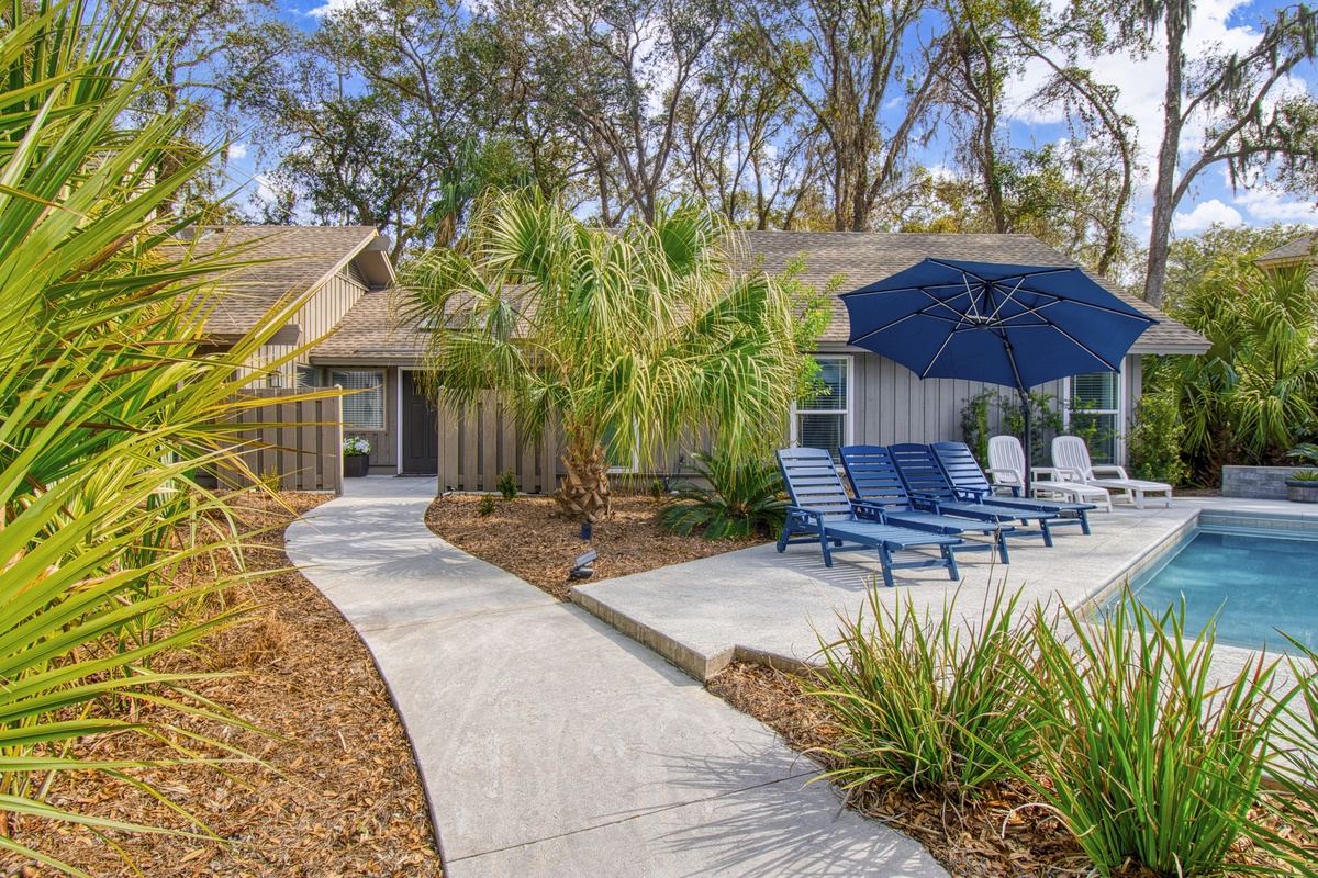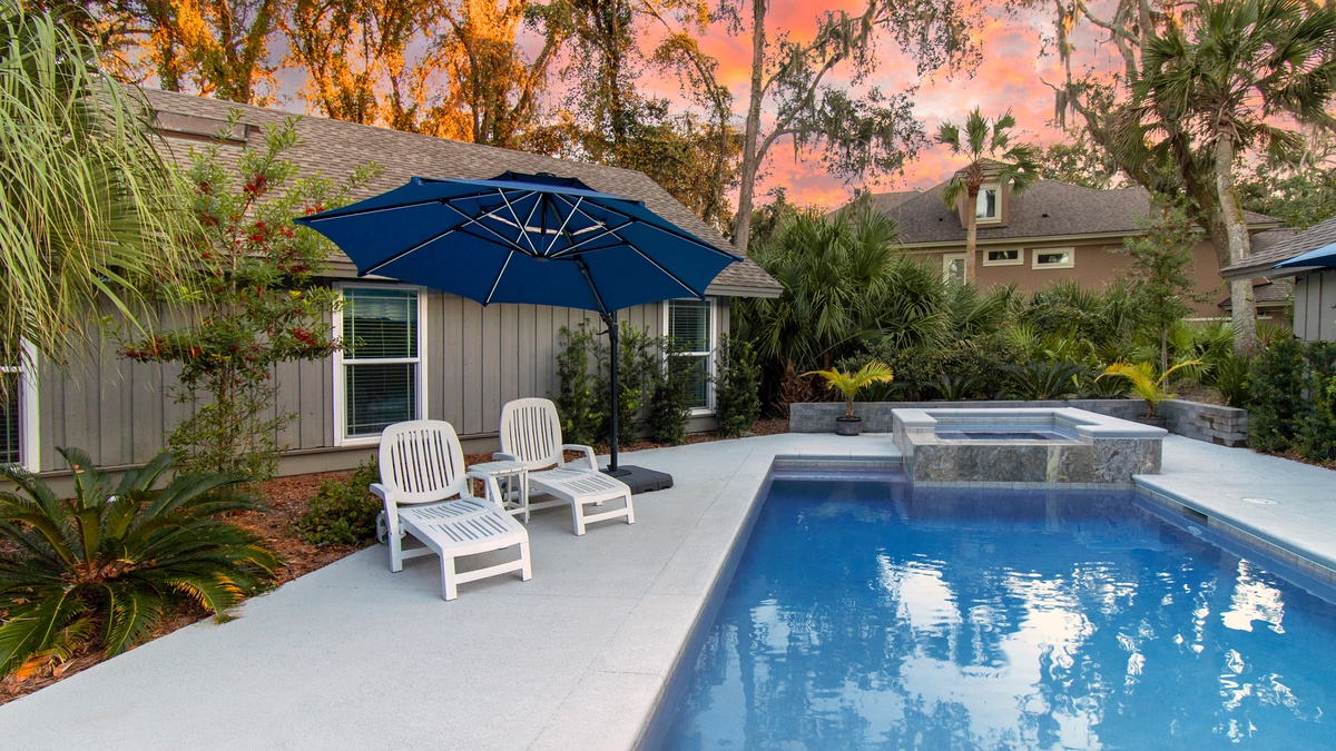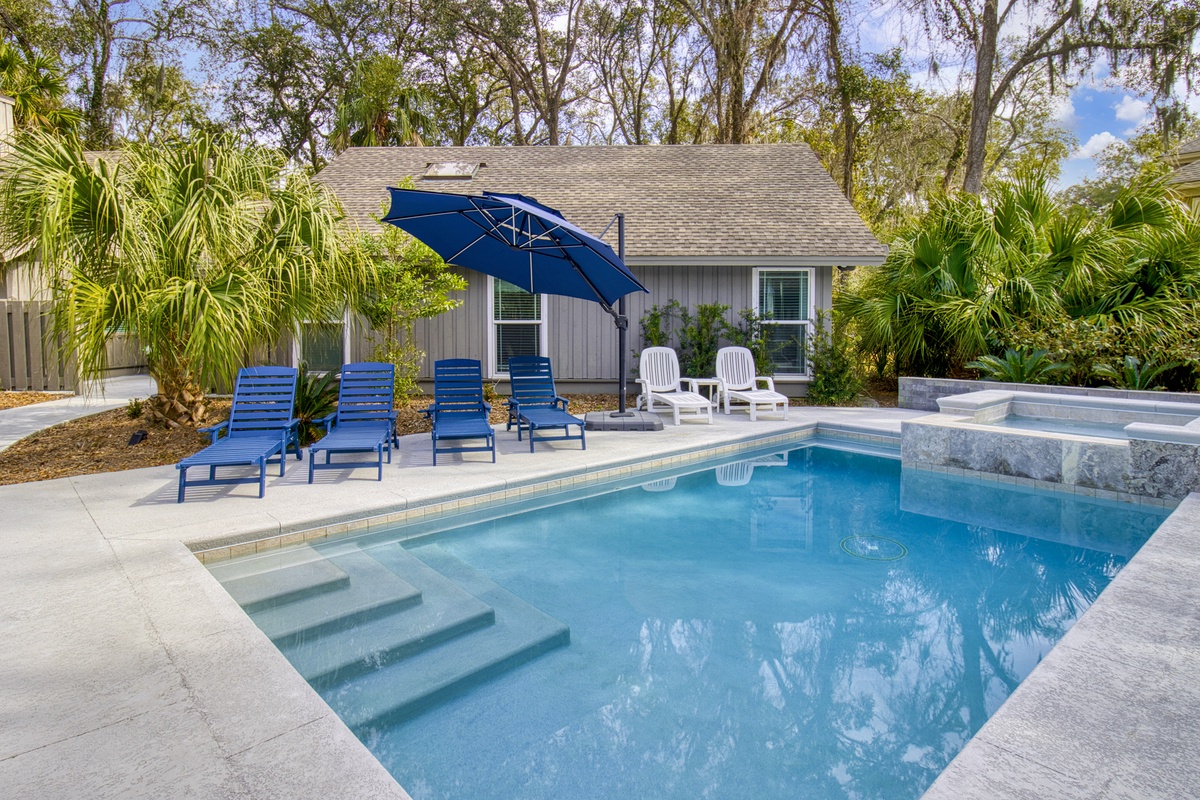 Step into a beautifully remodeled home with a brand-new kitchen, designed to deliver a crisp and clean aesthetic. Sunlit spaces abound, from the open living areas to the inviting Carolina room with its wall of windows. The backyard oasis includes a saltwater heated and chilled pool with a spillover spa, offering you a luxurious spot to relax after a day on the golf course or at the beach. A ping-pong table awaits for the ultimate battle in the garage. This home has it all, including a front courtyard with Southern charm and an oversized detached 2-car garage for added privacy and space.