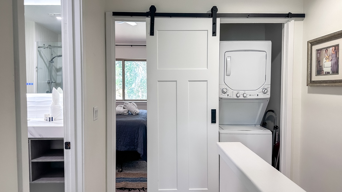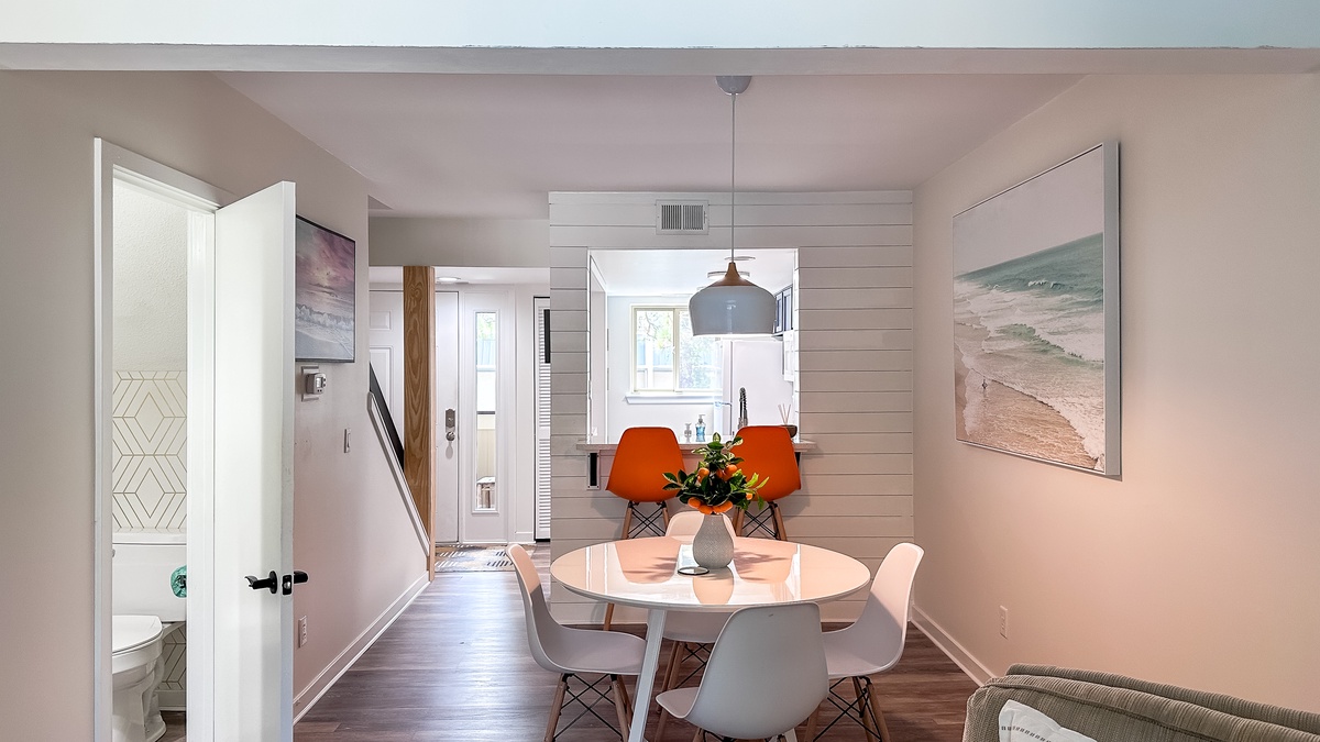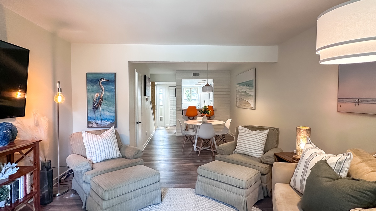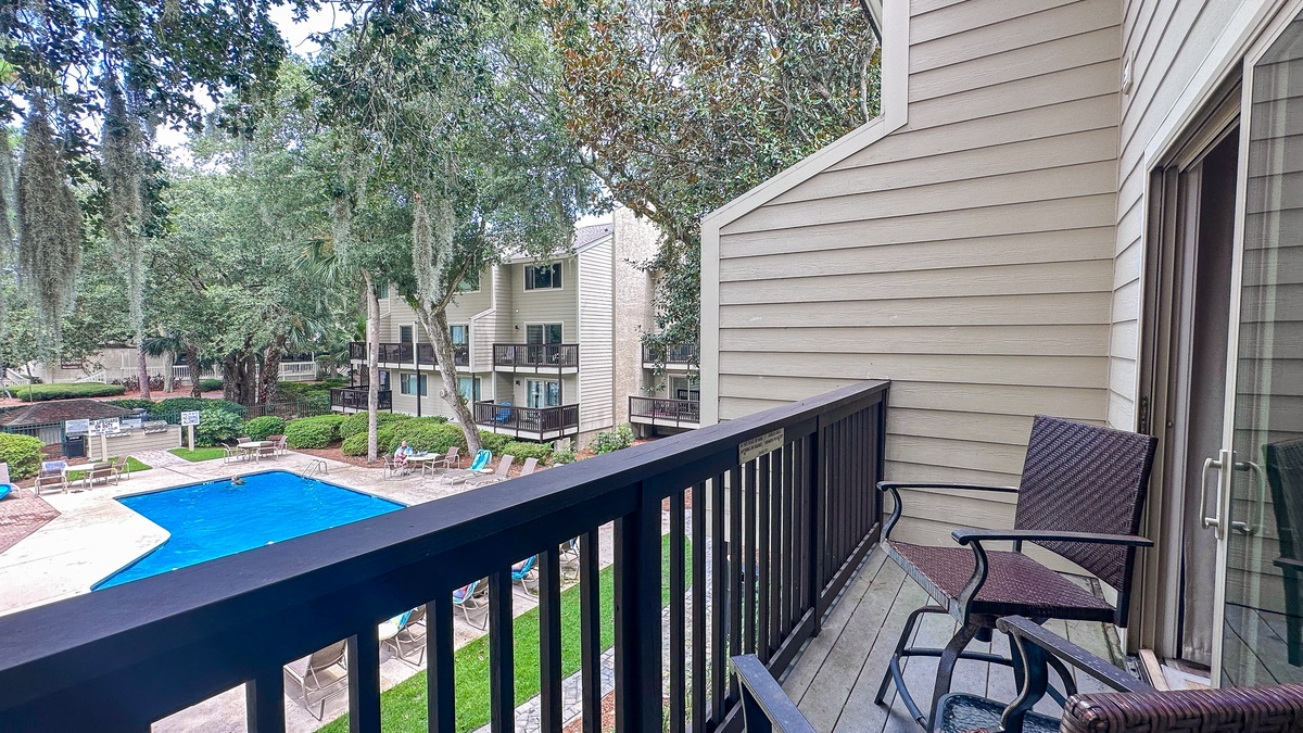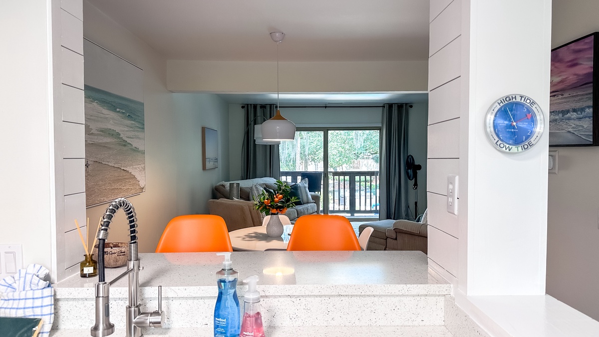 303 Tanglewood is a modern and beachy 3rd-floor villa with 2 full bedrooms and 1 1/2 baths and is perfectly situated in prime South Forest Beach. The main level has a fully equipped kitchen, a dining area for getting your grub on, and a comfy living room with oversized television for the nighttime Netflix binge! Off the living area is a spacious balcony with seating that overlooks the communal pool and inner courtyard. Upstairs you will find the 2 bedrooms and just renovated hotel-style bathroom with a walk-in shower and all the bells and whistles! The primary bedroom has a king bed, and the 2nd bedroom has one queen bed and a twin bed. The upstairs also is home to the stackable washer and dryer located behind the barn-style door at the top of the stairs.
