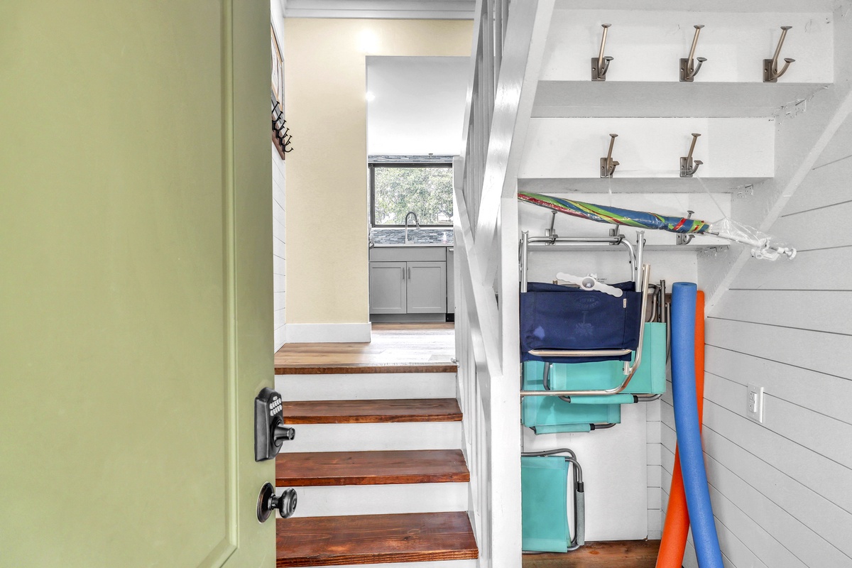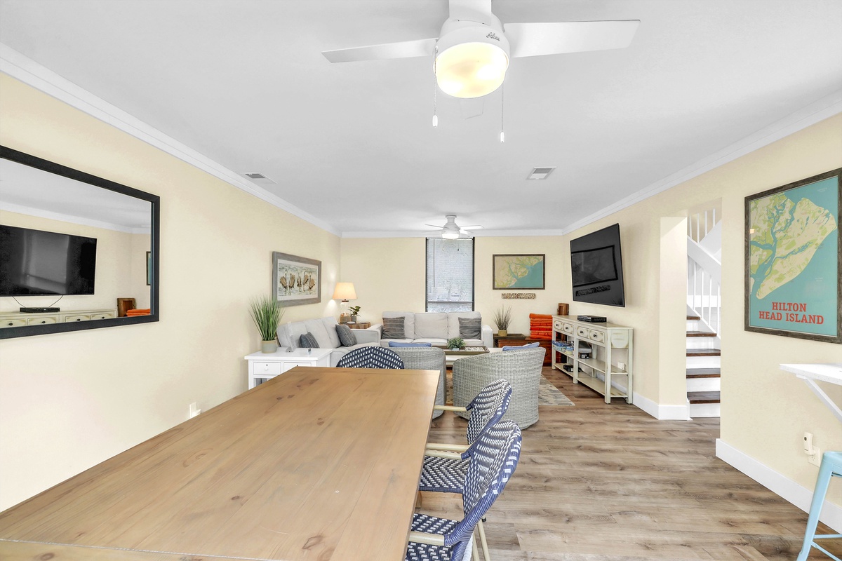 Venture to the second level, where two bedrooms and a full bathroom await. The first bedroom boasts a king bed, while the second bedroom features two sets of twin-over-twin bunk beds, each equipped with its own trundle bed. This level provides a cozy haven for friends or family to unwind after a day of island adventures.