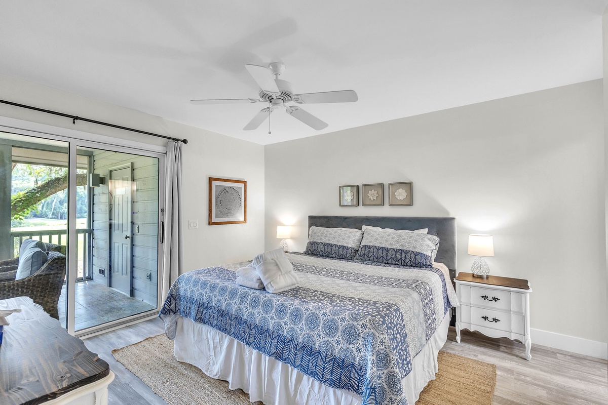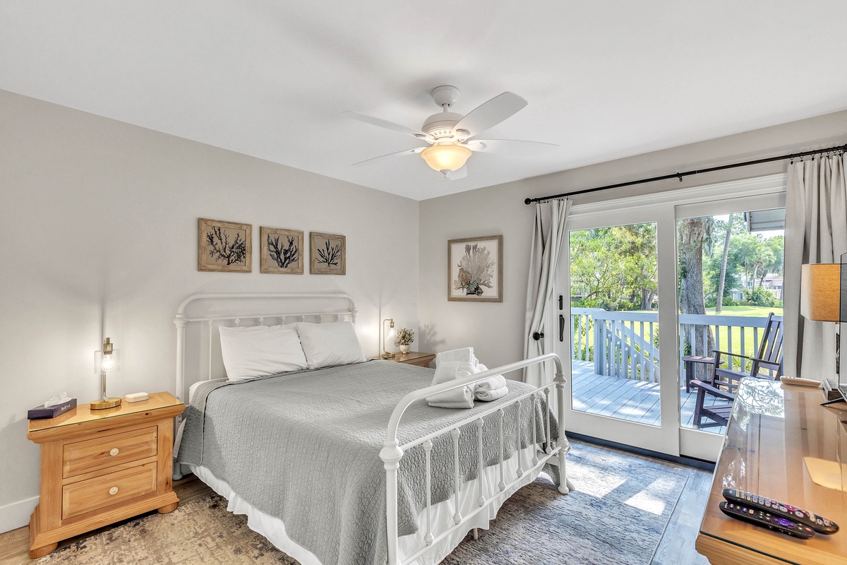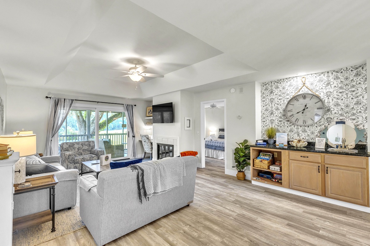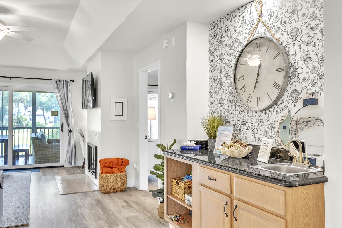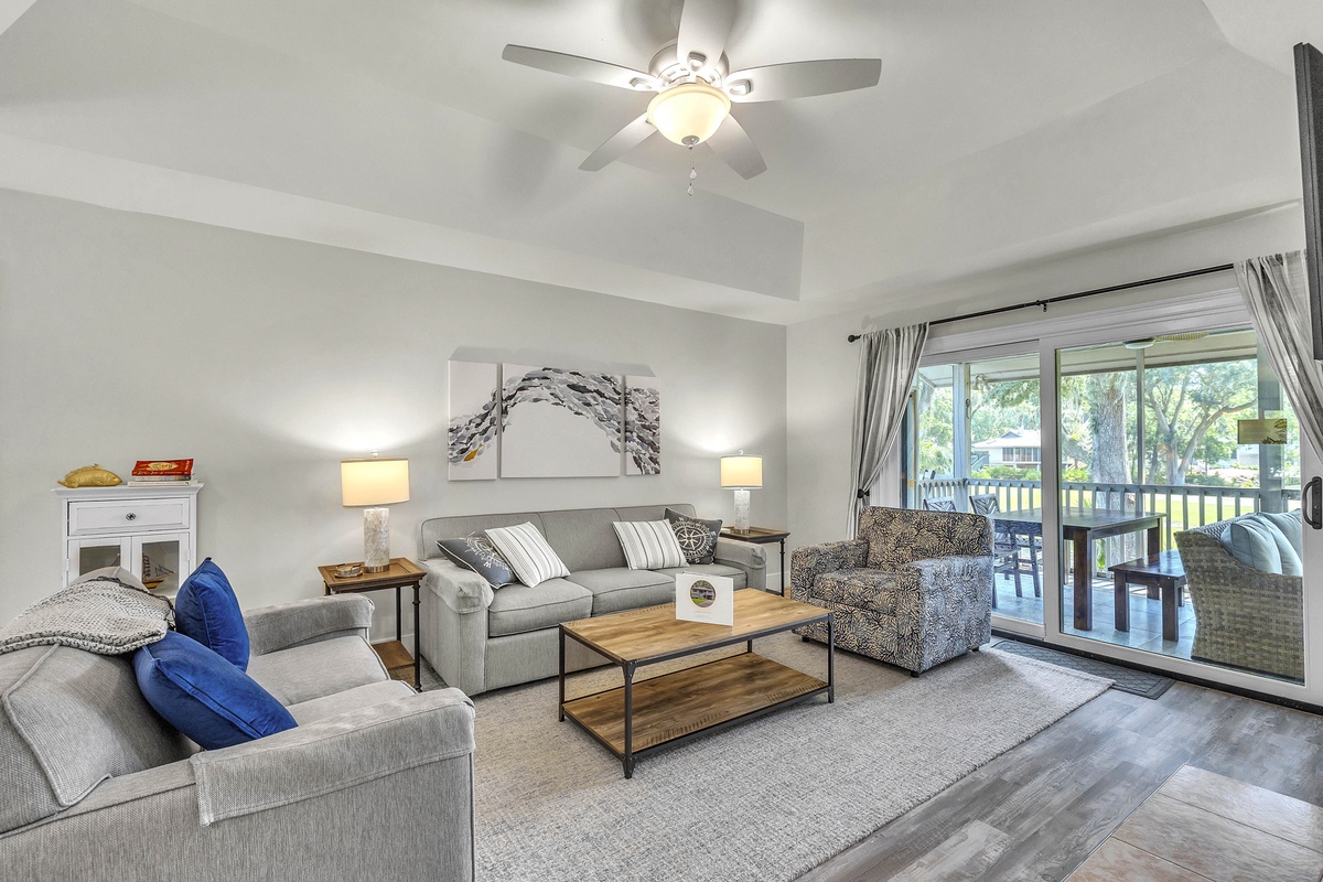 Escape to your dream family or golf getaway in this stunning 3BR/2BA home overlooking the 8th Green of the Galleon Golf Course, affectionately dubbed "The Atlantic Hideaway." Recently renovated, this home features a fully equipped kitchen and open-concept living area perfect for a midday snack or a quick retreat from the Summer heat. Just off the main living area is the enclosed back patio with golf course views, an outdoor dining table, and comfy rocking chairs. You may even find a stray golf ball or two! The primary suite features a king bed and en-suite bathroom with a walk-in shower. The second bedroom has two twin beds and shares a full hallway bathroom with the third bedroom, which has a queen.