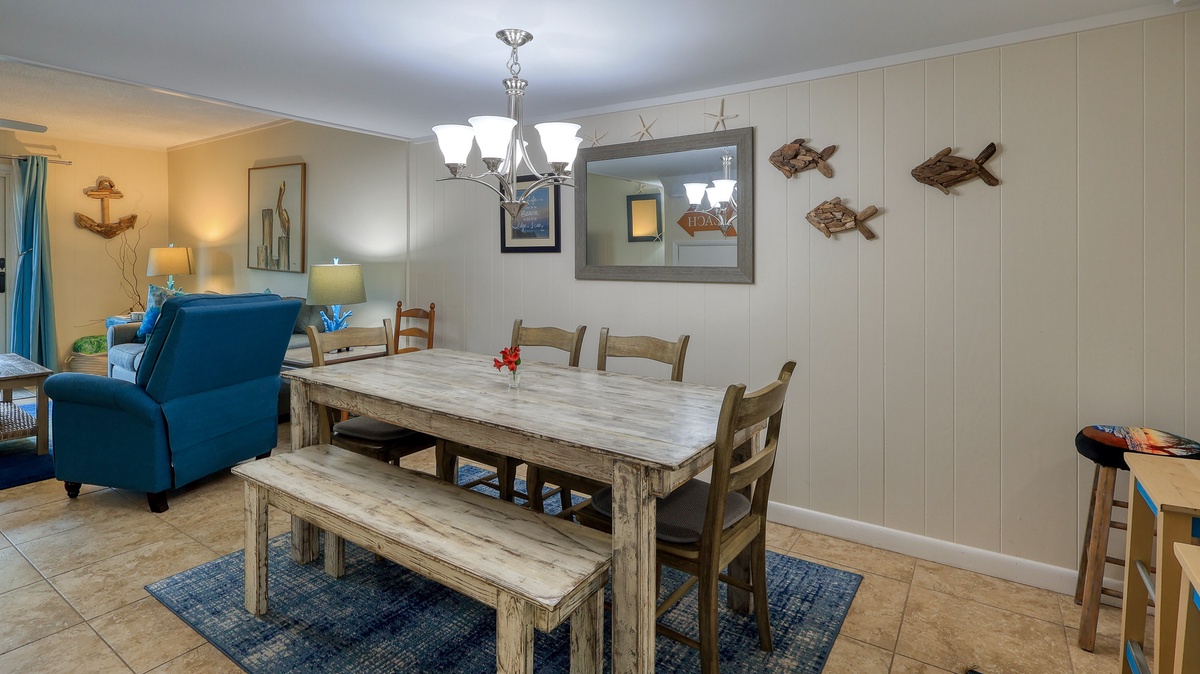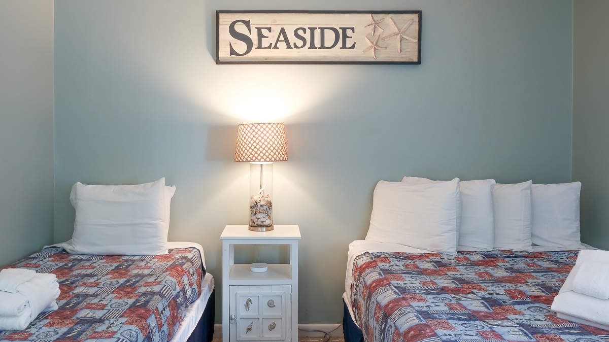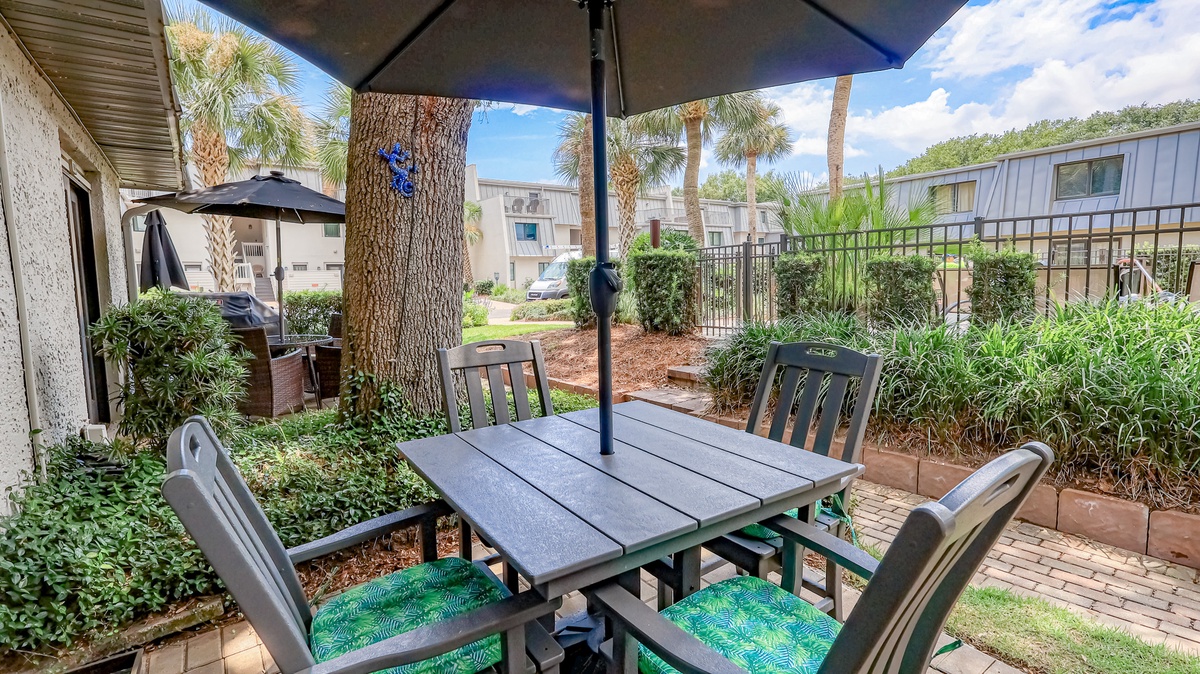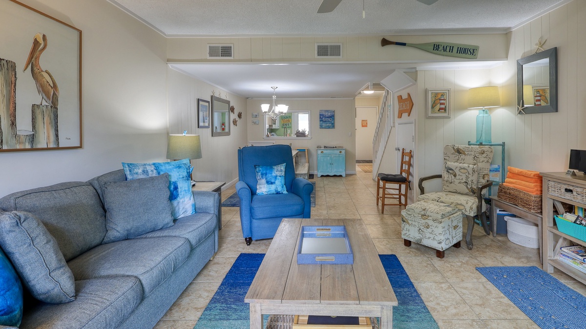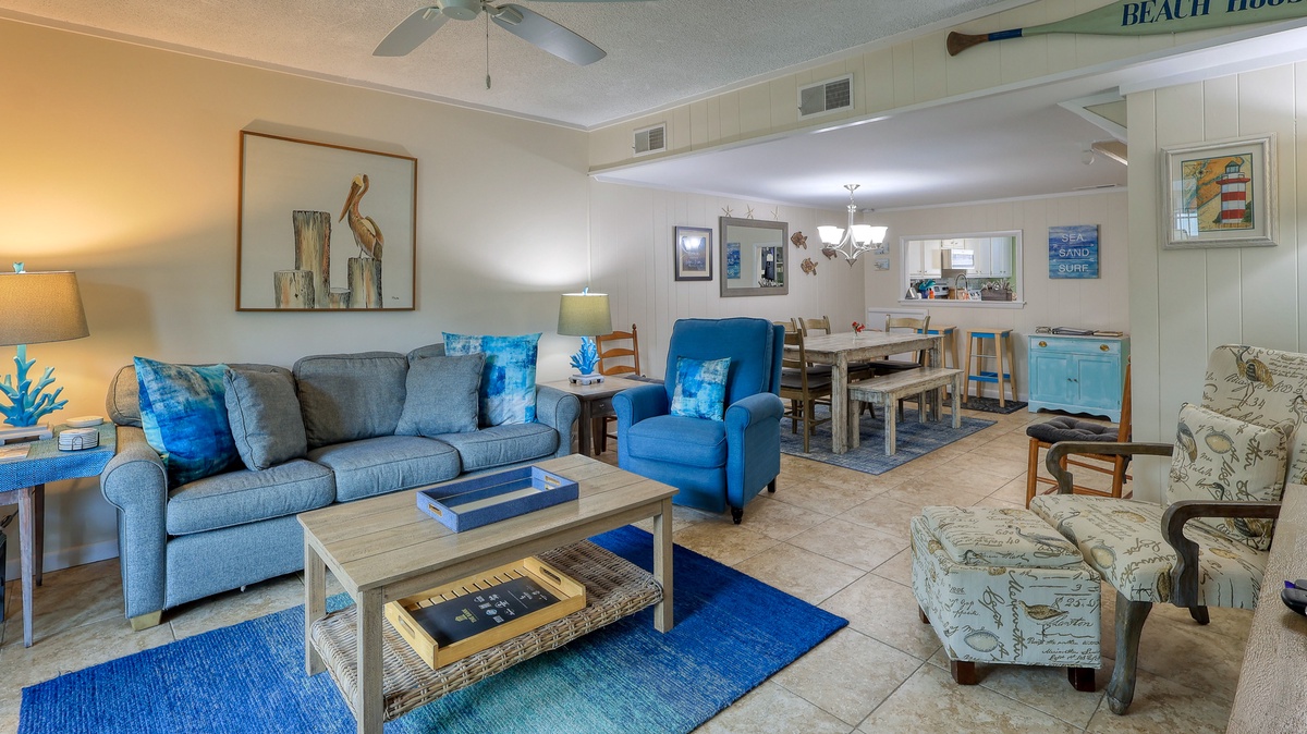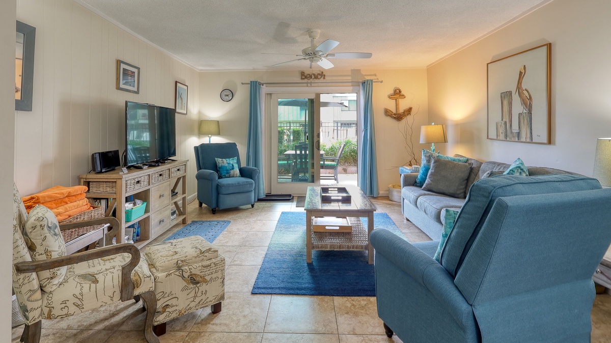 Ocean blue and sandy tan hues give the interior of this villa a relaxed, beachy vibe the whole family will enjoy. Awake to the smell of freshly brewed coffee coming from the fully-equipped kitchen, enjoy movie night in the spacious living area, sip sweet tea on your private patio, get the steaks out to cook on the outdoor grill, or be toes in the sand after just a few minute walk to the beach.