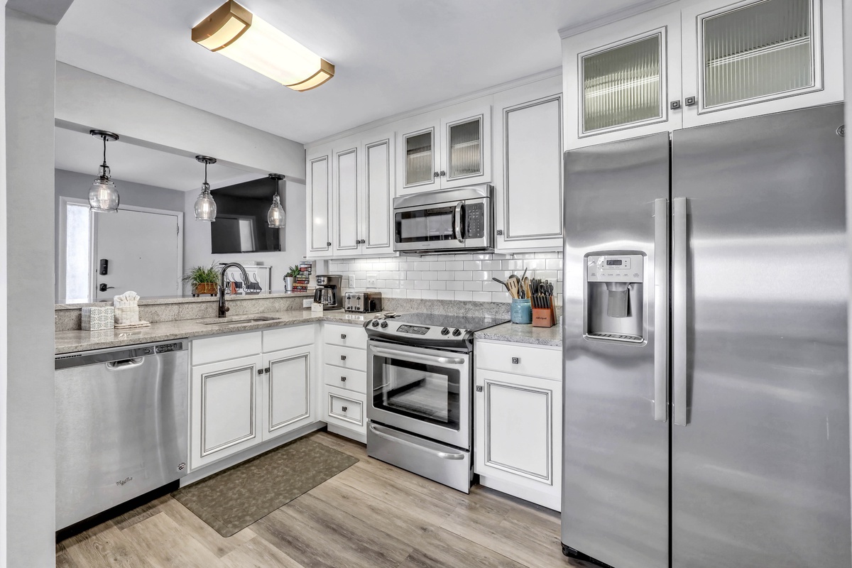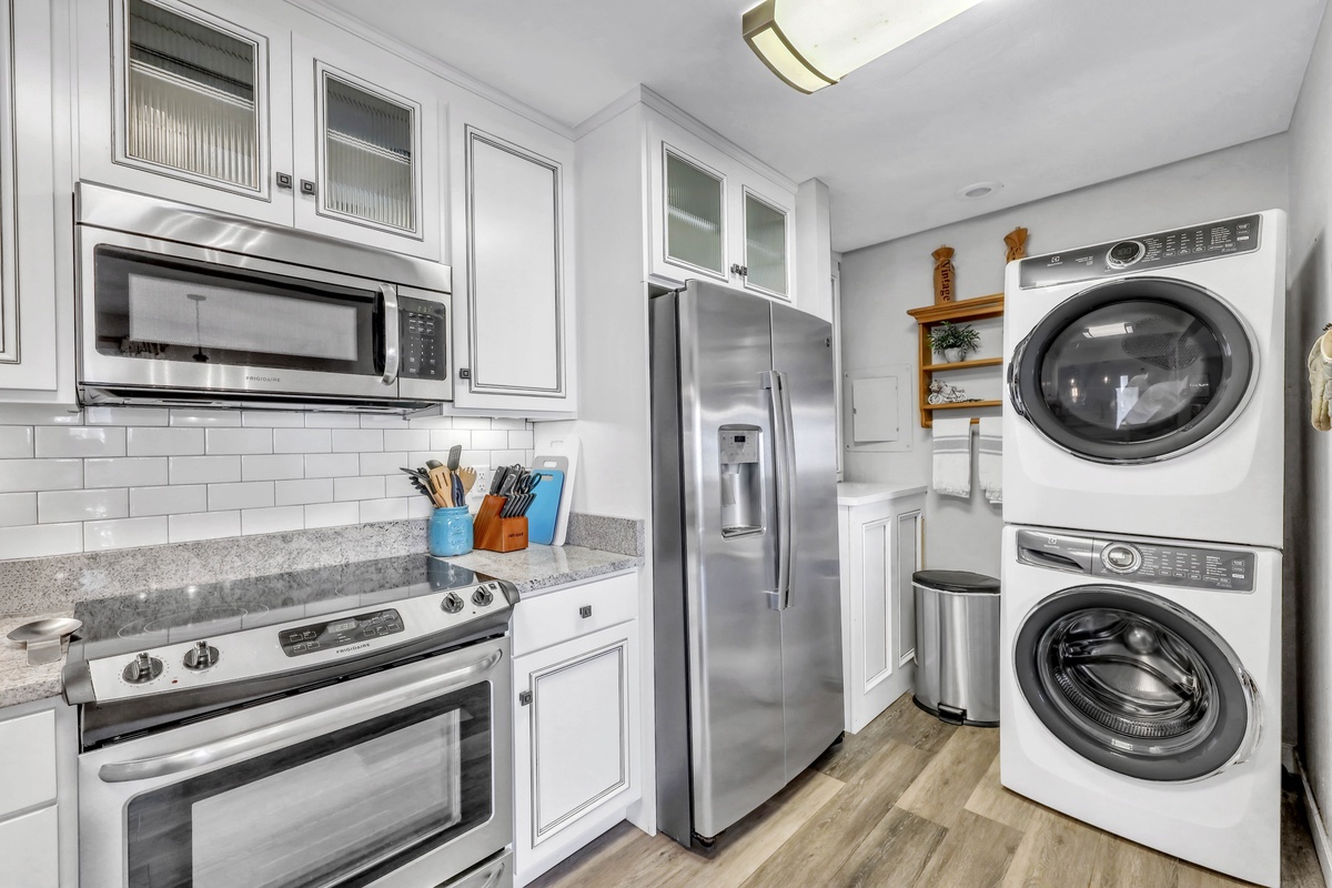As you step inside, you’ll be greeted by a spacious and inviting living room that seamlessly flows into a private balcony, offering a peaceful spot to relax and enjoy the outdoors. Whether it’s your morning coffee or an evening sunset, this outdoor space will quickly become your favorite place to unwind. The well-stocked kitchen offers stainless steel appliances that make cooking a joy. From preparing gourmet meals to quick snacks, you’ll have everything you need at your fingertips. Plus, with a washer and dryer conveniently located in the unit, doing laundry has never been easier or more efficient.