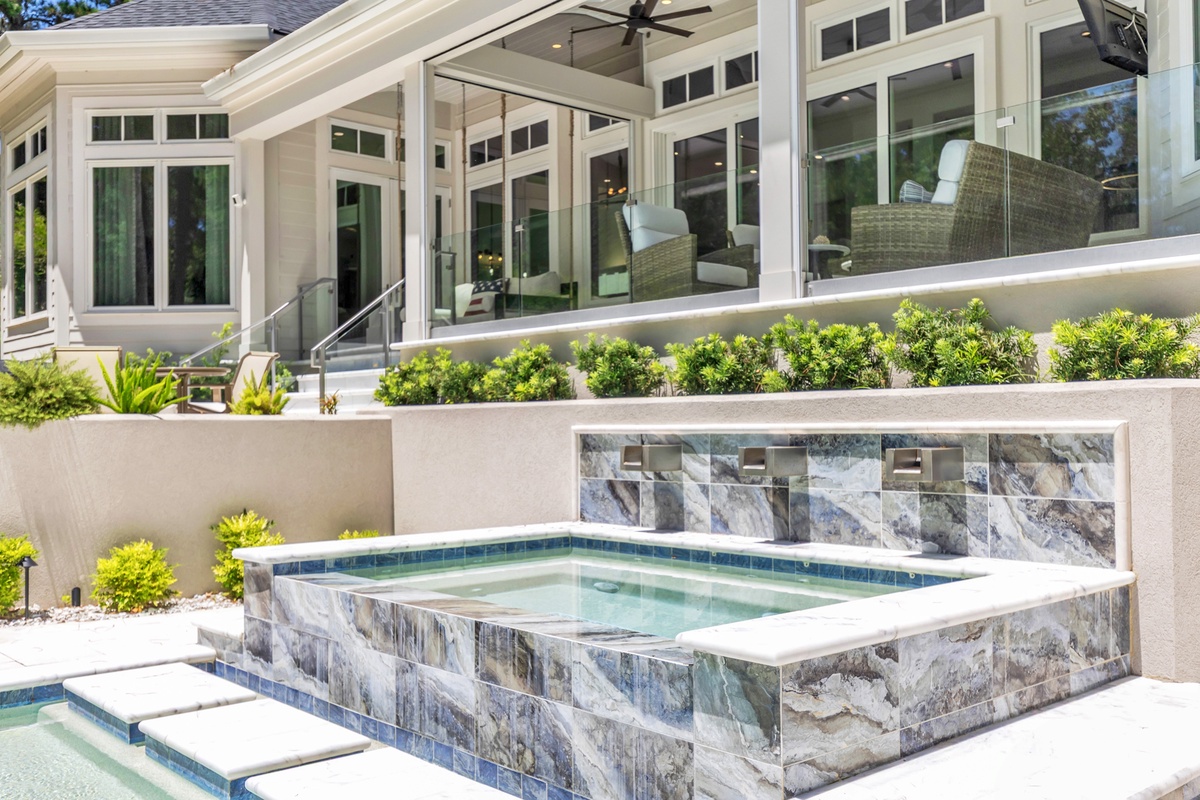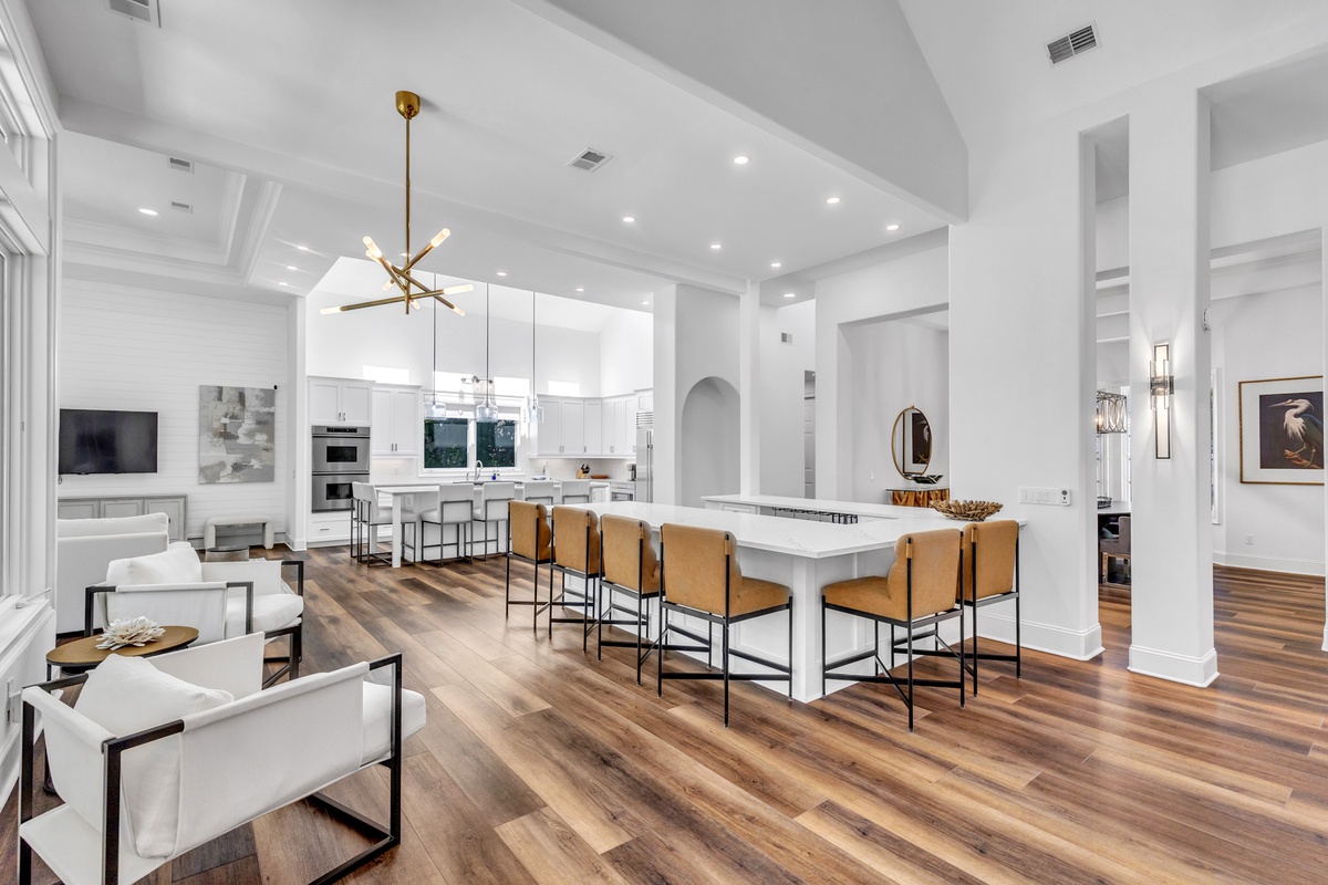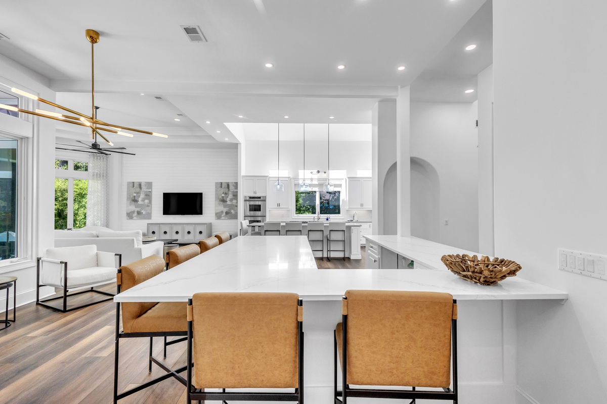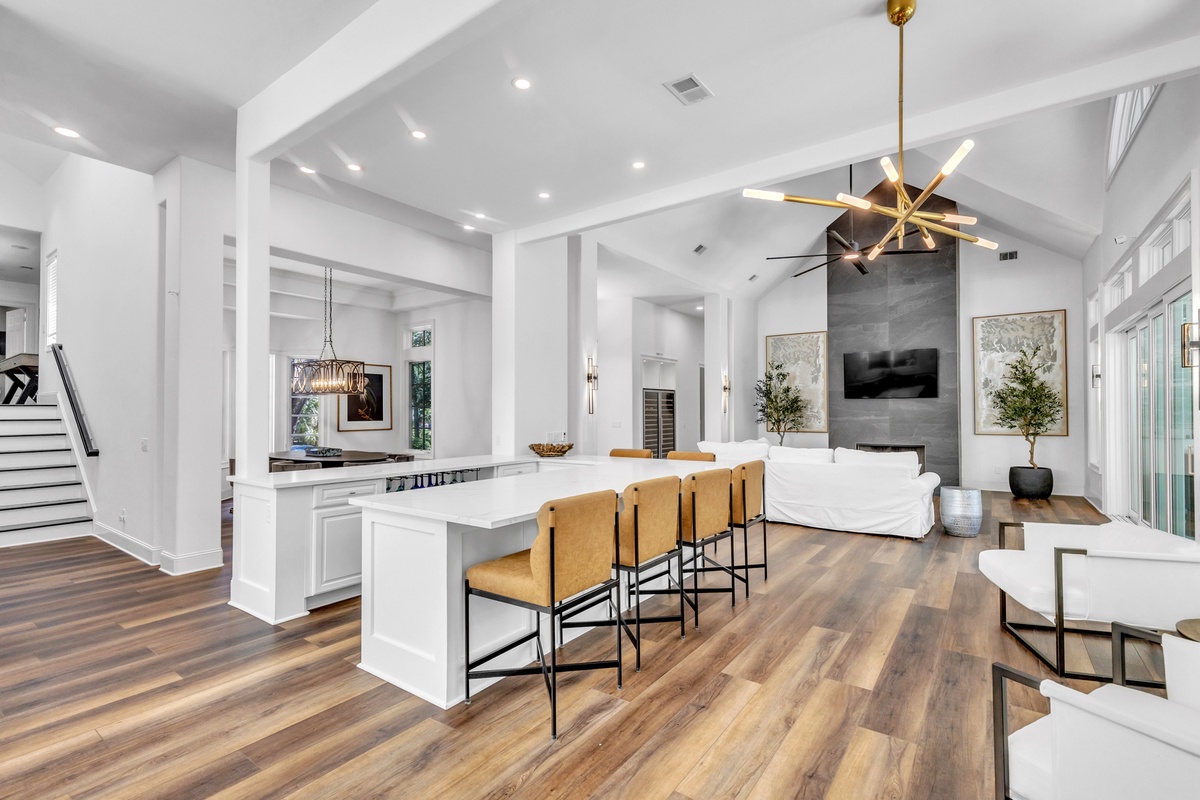 The outdoor oasis is nothing short of spectacular! Lounge by the private pool framed by palm trees, let the soothing sounds of the cascading waterfall melt your stress away, or slip into the in-water loungers shaded by an umbrella for the ultimate afternoon of serenity. The spacious porch is lined with cushioned loungers and wicker dining sets - perfect for everything from sunbathing to al fresco meals under the Carolina sky! Step inside and be greeted by soaring vaulted ceilings, striking modern chandeliers, and a wide-open living space where natural light dances across sleek wood floors. The living room’s bold stone fireplace* and oversized sectional invite cozy evenings, while the fully stocked chef’s kitchen with marble counters, double ovens, and statement pendant lights is a dream for culinary enthusiasts.