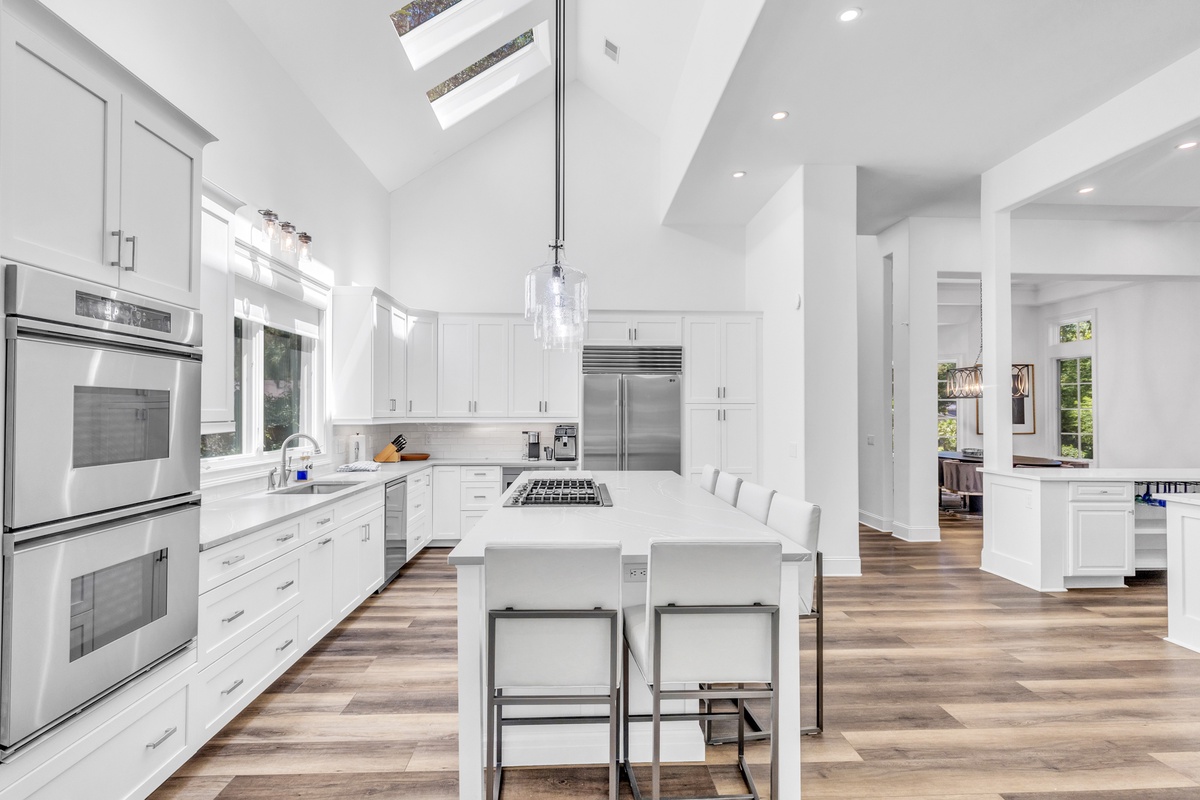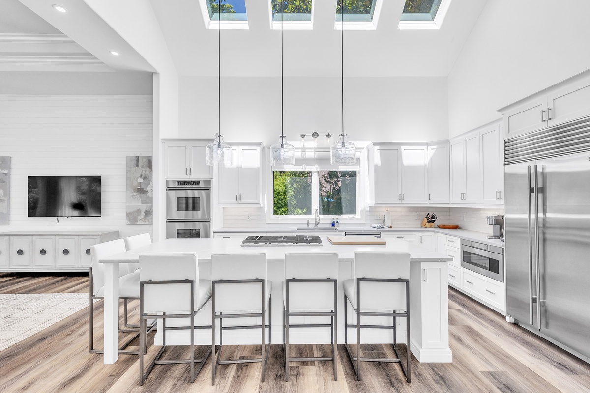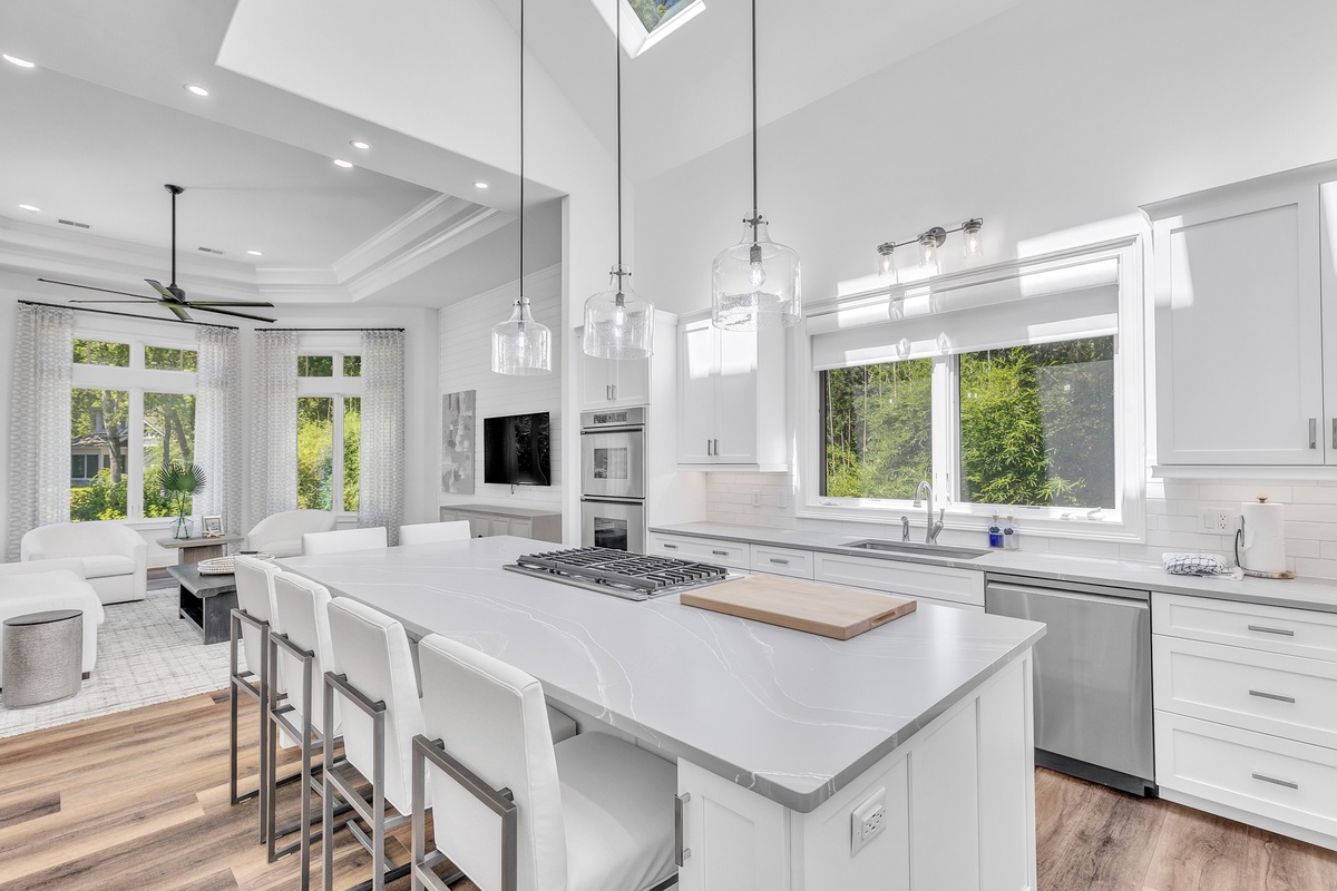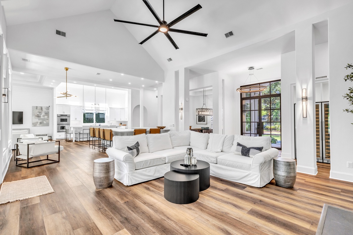 The outdoor oasis is nothing short of spectacular! Lounge by the private pool framed by palm trees, let the soothing sounds of the cascading waterfall melt your stress away, or slip into the in-water loungers shaded by an umbrella for the ultimate afternoon of serenity. The spacious porch is lined with cushioned loungers and wicker dining sets - perfect for everything from sunbathing to al fresco meals under the Carolina sky! Step inside and be greeted by soaring vaulted ceilings, striking modern chandeliers, and a wide-open living space where natural light dances across sleek wood floors. The living room’s bold stone fireplace* and oversized sectional invite cozy evenings, while the fully stocked chef’s kitchen with marble counters, double ovens, and statement pendant lights is a dream for culinary enthusiasts.