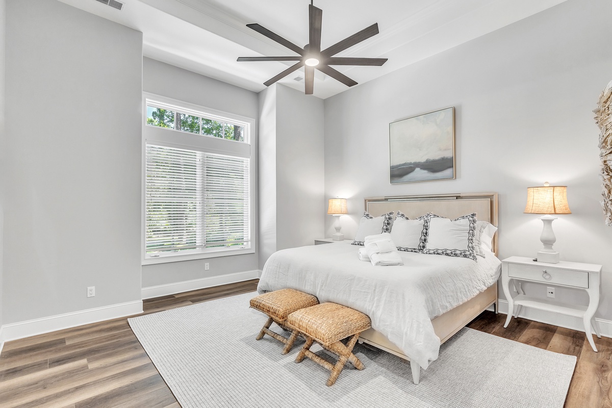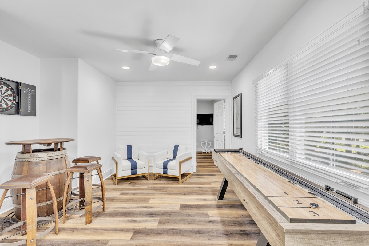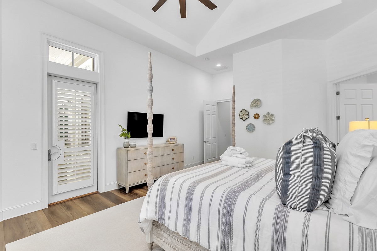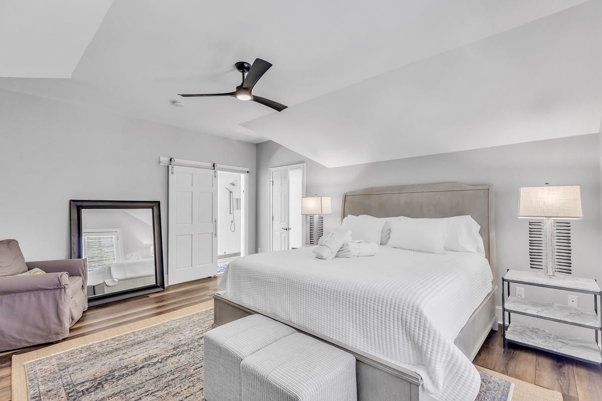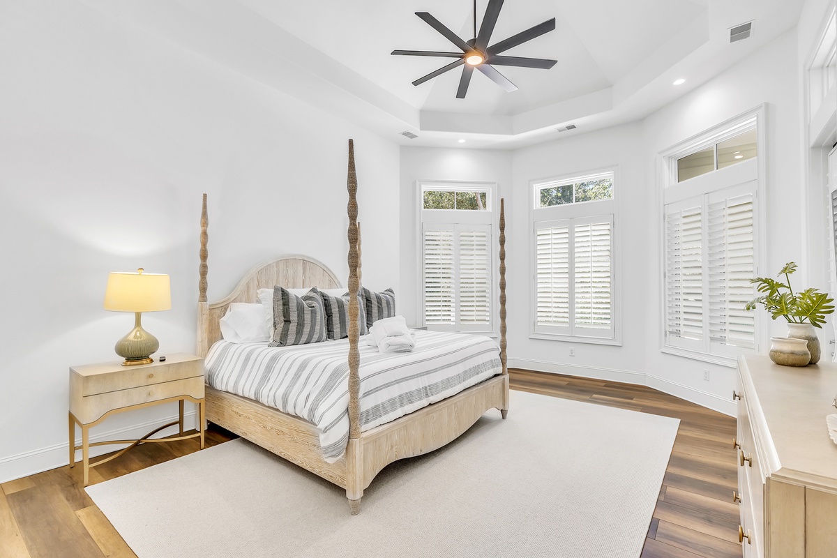Every corner of this home feels designed for indulgence. Imagine sipping cocktails in the screened-in porch as ceiling fans keep the coastal breeze flowing, or gently swaying on the custom rope-hung porch swing while gazing out over the pool. For lively evenings, retreat to the game room complete with shuffleboard and dartboard, where fun and laughter fill the air. The bedrooms are serene sanctuaries with plush bedding, designer furnishings, and spa-like bathrooms. The primary suite offers a retreat within a retreat, with a king bed beneath a dramatic tray ceiling and oversized windows framing the natural beauty outside. Whether you crave vibrant gatherings or peaceful solitude, this home delivers it all in effortless style.