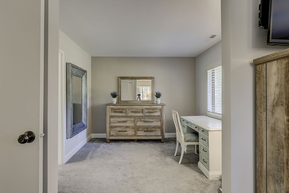 Upstairs, the primary suite feels like a personal sanctuary, complete with a king bed, a quiet office nook, and an en-suite bathroom with a walk-in shower. It’s the perfect retreat after exploring Hilton Head’s pristine beaches or biking along its winding trails. The guest bedroom, with both a queen and a twin bed, ensures comfort for families and friends, while the hall bathroom provides ease and convenience. A laundry closet upstairs makes extended stays effortless, allowing you to settle in and feel at home in your island escape.