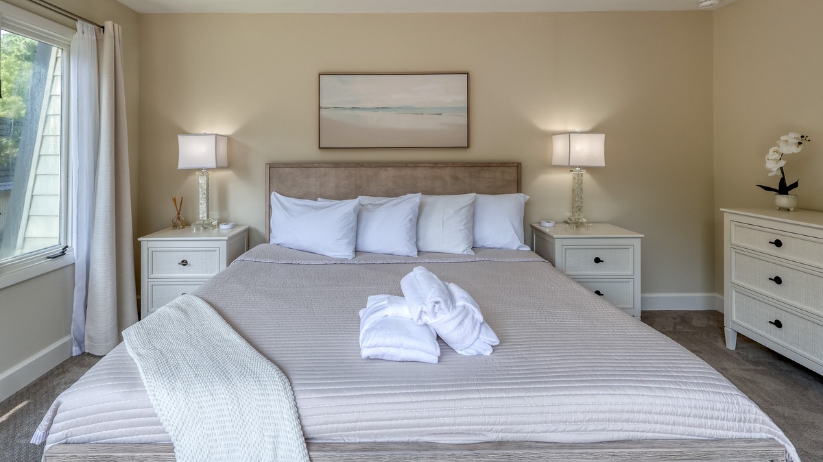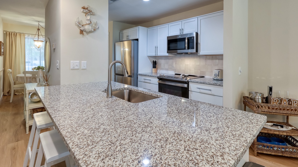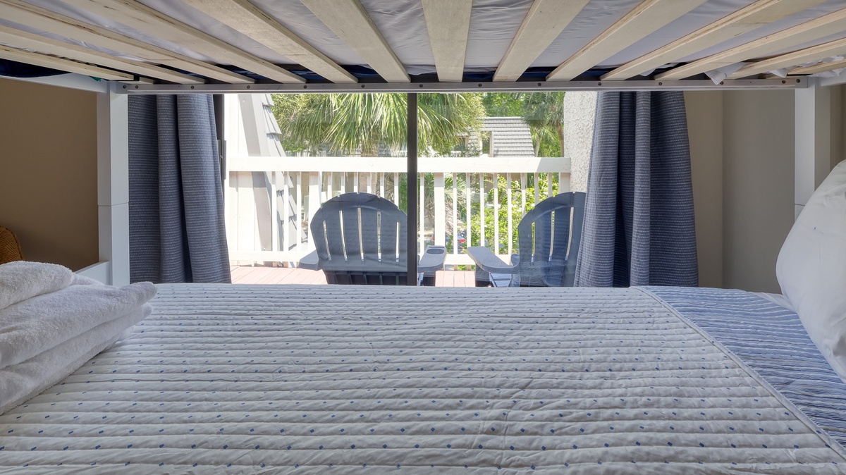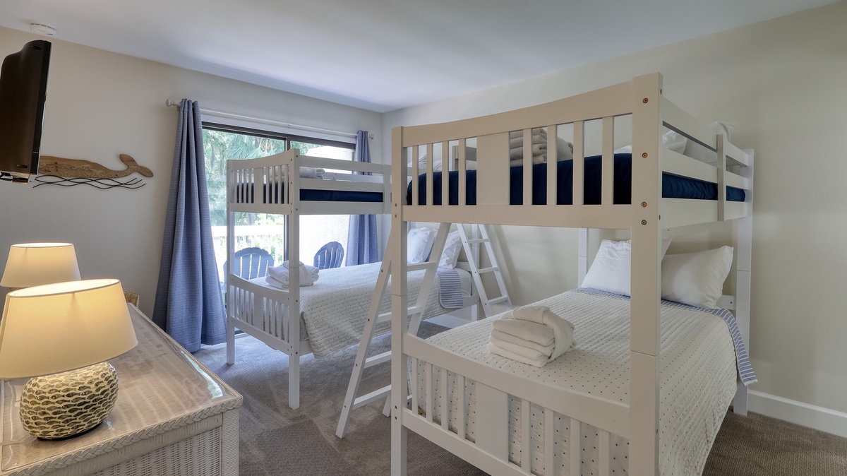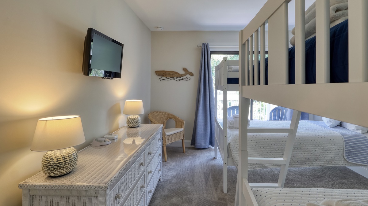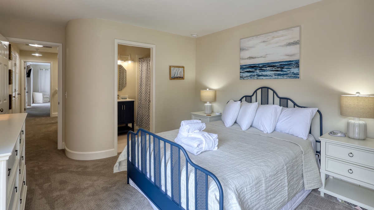 On the first level, you'll find a designated workspace with super-fast WiFi, perfect for those who need to work remotely. There's also a convenient laundry area and a half bath. Upstairs, the primary suite offers a luxurious king bed, an en-suite bathroom with a shower and soaking tub, and a private balcony overlooking the lagoon. The second bedroom features a cozy queen bed and its own bathroom, while the third bedroom, with two sets of twin bunks, is a dream for kids and has its own full bathroom.