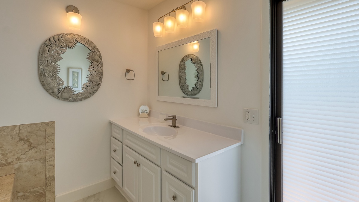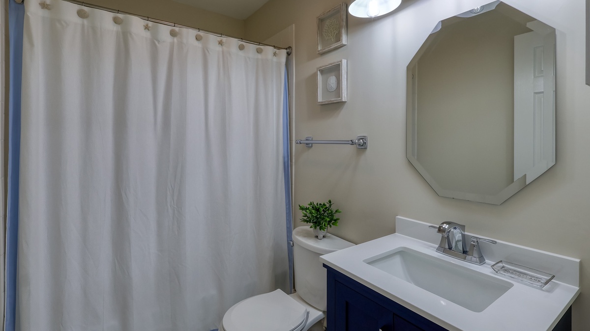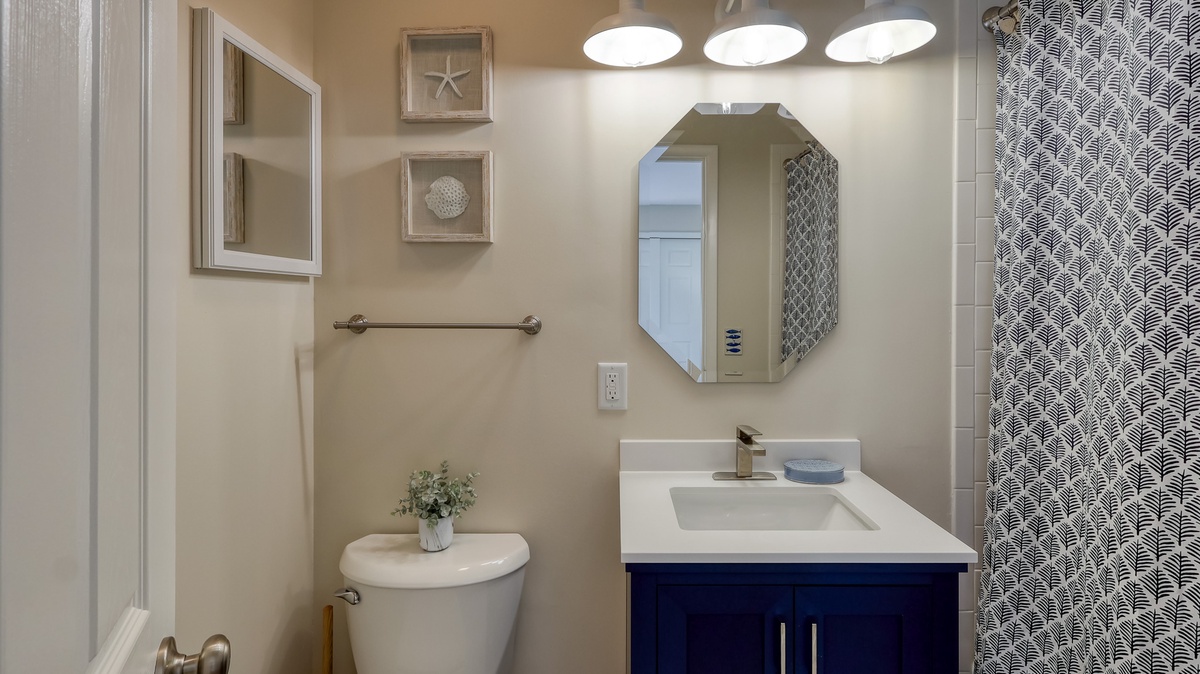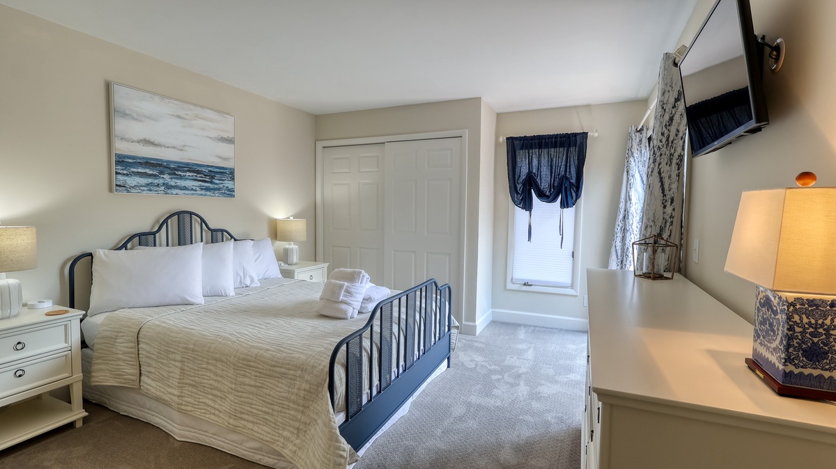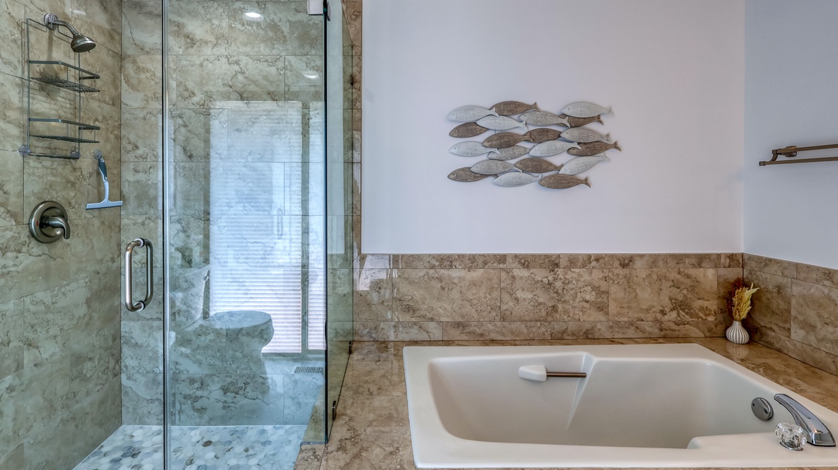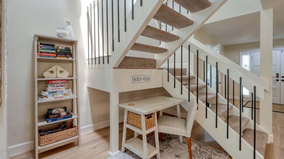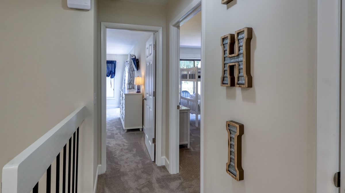 On the first level, you'll find a designated workspace with super-fast WiFi, perfect for those who need to work remotely. There's also a convenient laundry area and a half bath. Upstairs, the primary suite offers a luxurious king bed, an en-suite bathroom with a shower and soaking tub, and a private balcony overlooking the lagoon. The second bedroom features a cozy queen bed and its own bathroom, while the third bedroom, with two sets of twin bunks, is a dream for kids and has its own full bathroom.