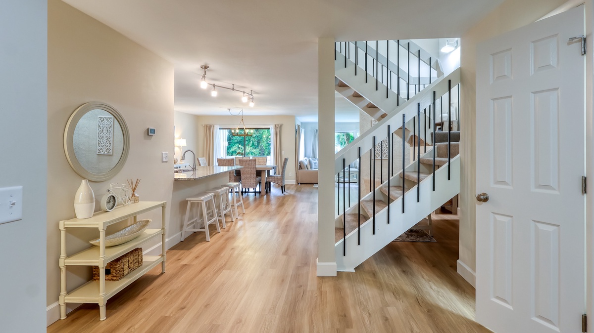 The open concept living and dining areas invite you to relax in style, whether you're lounging during the day or cuddling up for a movie night after exploring the island. The fully equipped kitchen is a chef's dream, complete with a separate coffee bar and a large eat-in area, perfect for morning coffee or family meals. Take in serene lagoon and fountain views from virtually every room or step out onto the covered porch or upstairs balconies for some fresh air and relaxation.