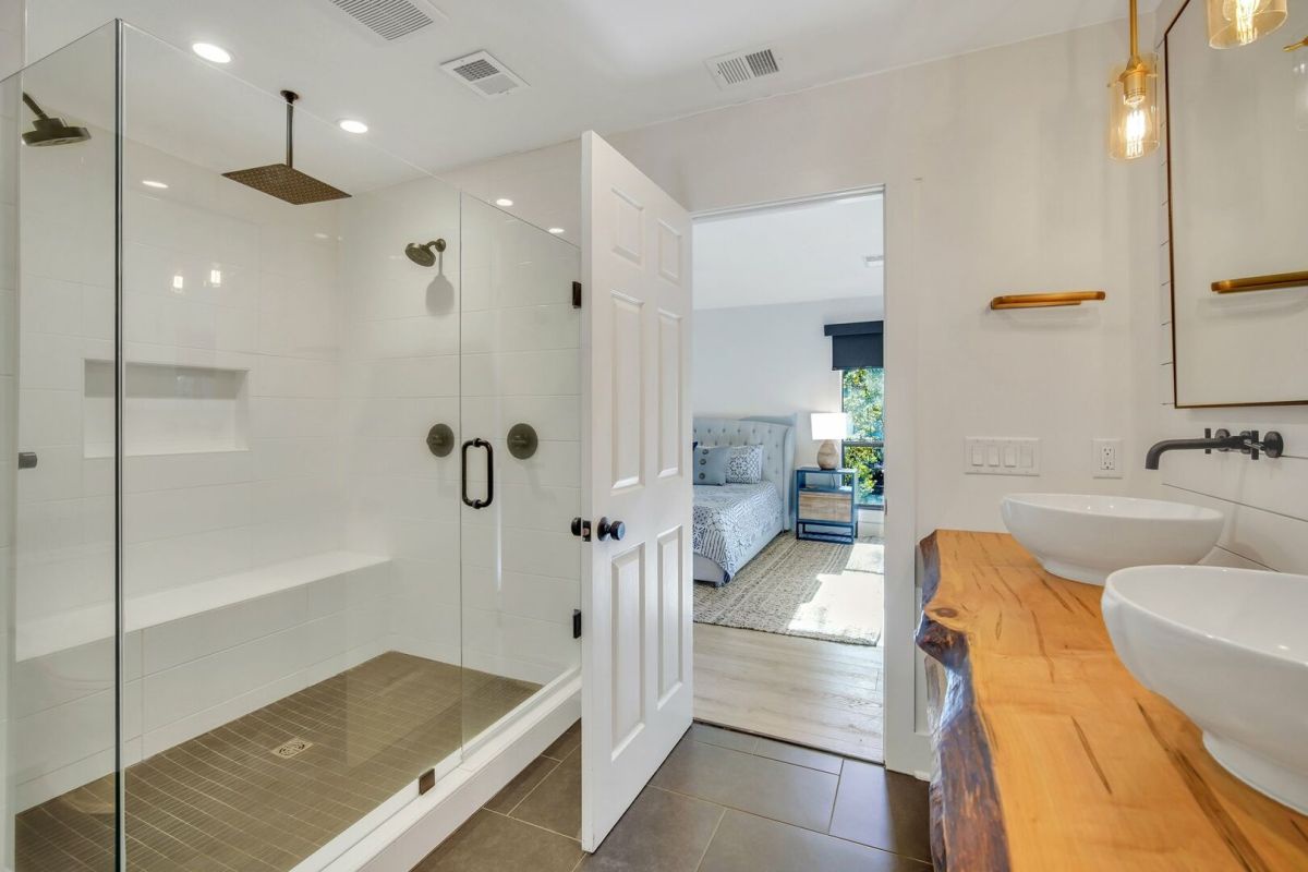 As you explore the home, comfort and design come together to create a true sanctuary. The layout easily accommodates up to eight guests, with two king bedrooms, one queen bedroom, and a sleeper sofa for added flexibility. The primary suite offers a peaceful escape, complete with private deck access that lets you start your day with gentle ocean breezes and the sound of rustling palms. The en suite bathroom is a luxurious retreat with a double vanity and a walk-in shower featuring dual and rainfall heads. The second bathroom mirrors that spa-like comfort with a double vanity and a tub and shower combination that includes both rainfall and handheld options.