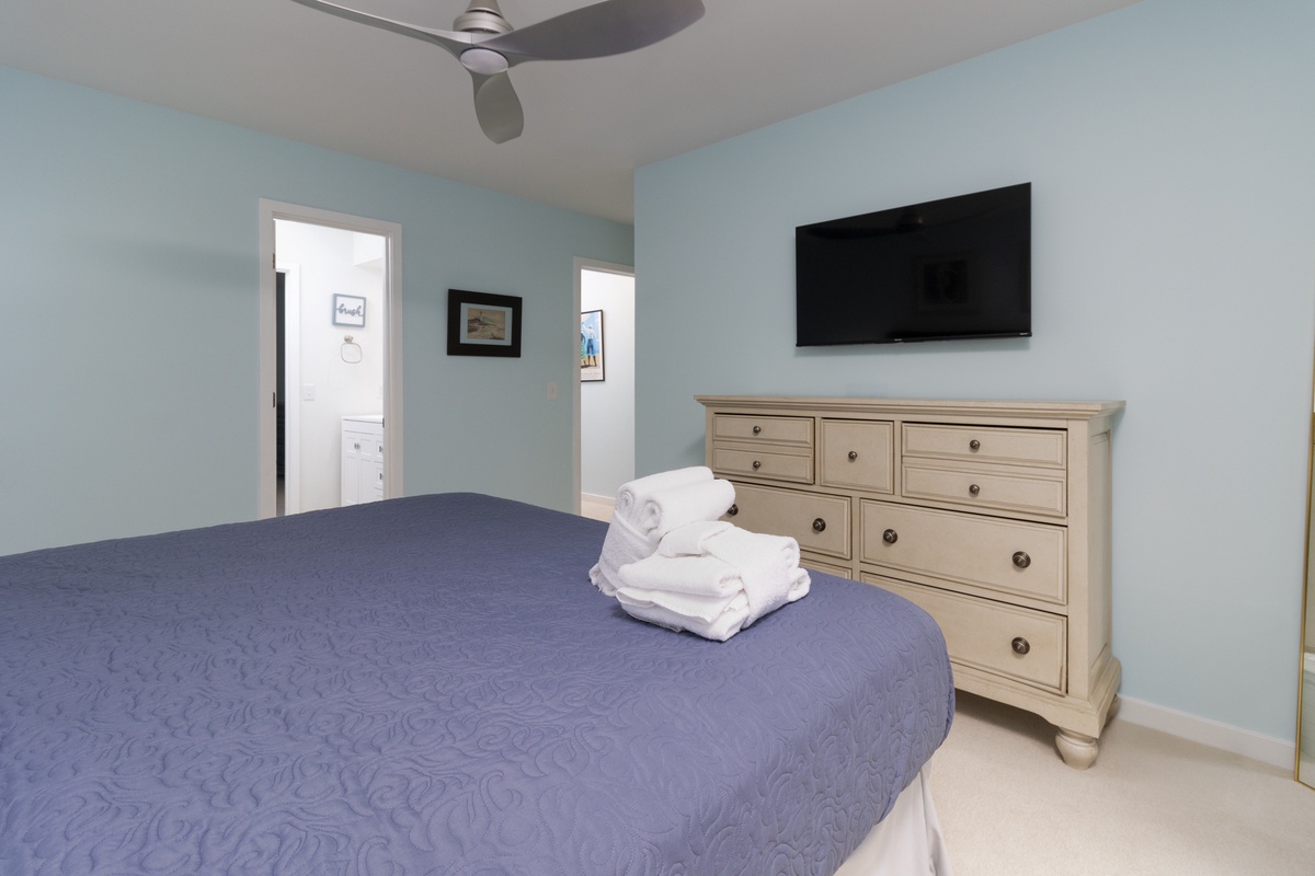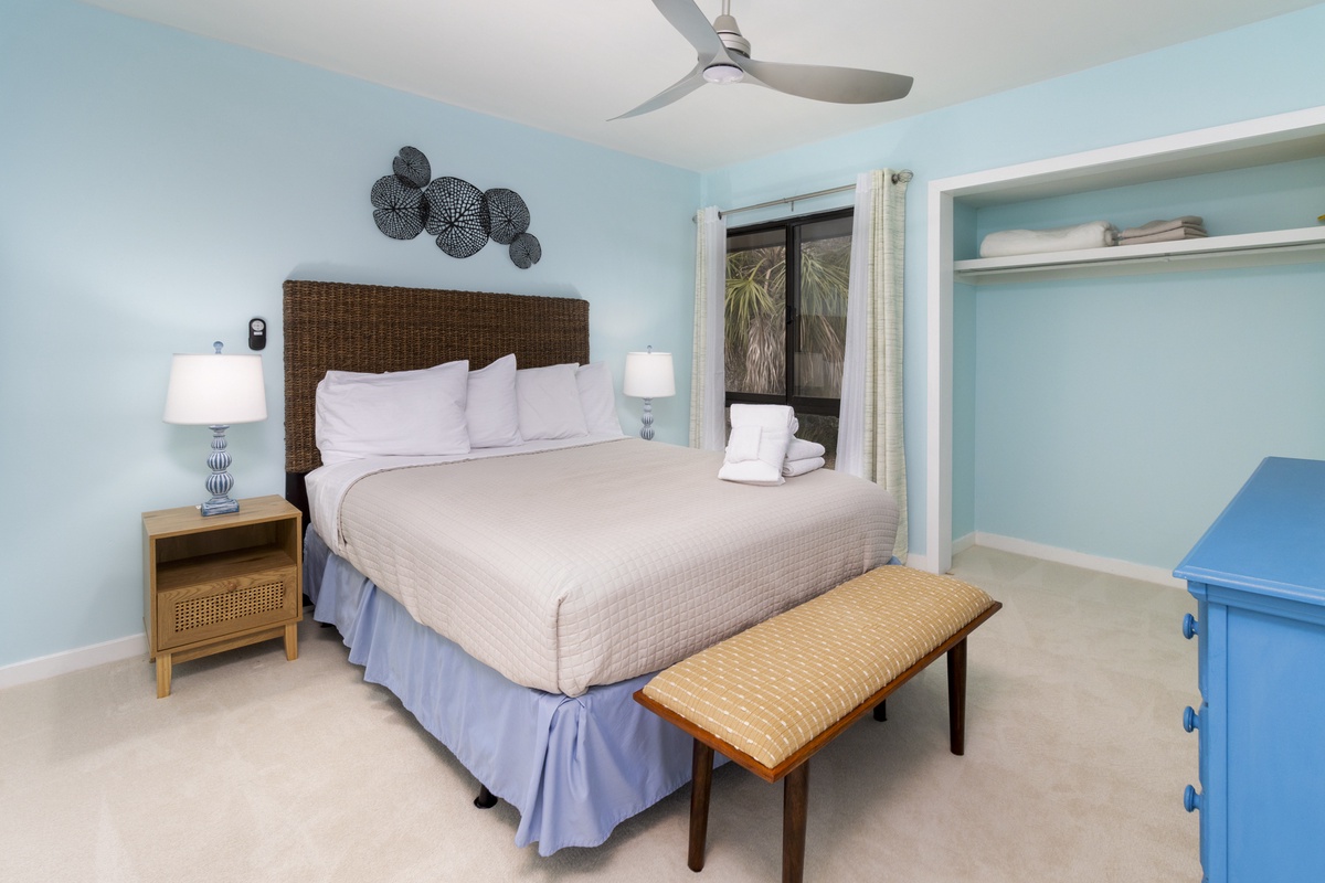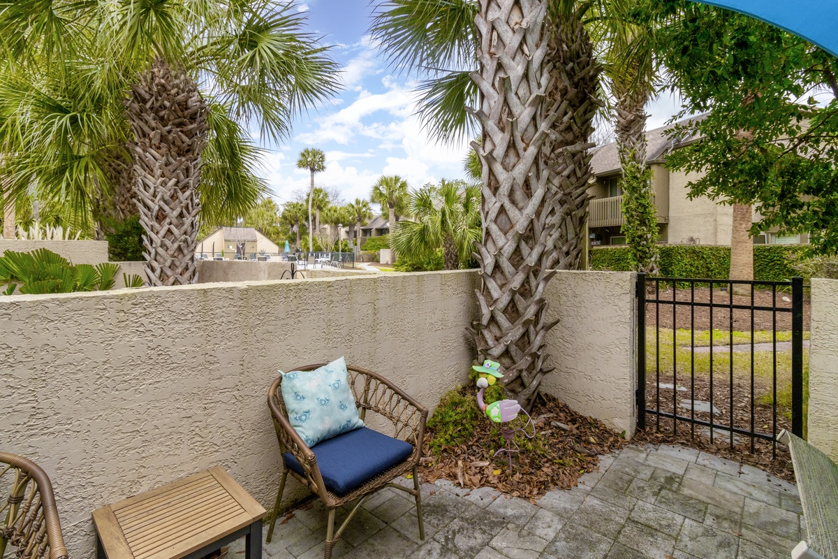 Spread across two stories, this beautifully designed villa features an open floor plan that seamlessly blends modern updates with coastal charm. The kitchen boasts stainless steel appliances and granite countertops, making it a pleasure to prepare meals. Gather in the inviting living area with plush furnishings and a Smart TV, perfect for cozy evenings indoors. Step outside to your private patio, complete with an umbrella-shaded dining area, where you can savor al fresco meals or unwind in the warm island breeze. Upstairs, the king-size primary bedroom offers a serene balcony overlooking the courtyard, while both bedrooms come equipped with Smart TVs and ample closet space for ultimate convenience.