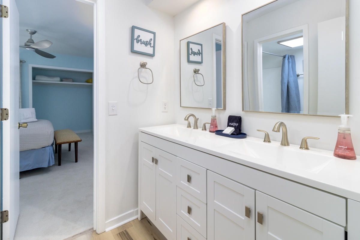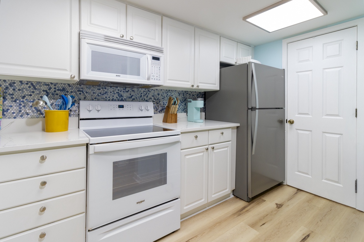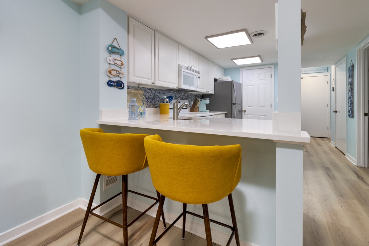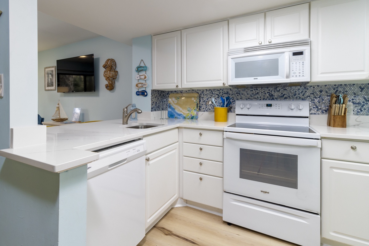 Spread across two stories, this beautifully designed villa features an open floor plan that seamlessly blends modern updates with coastal charm. The kitchen boasts stainless steel appliances and granite countertops, making it a pleasure to prepare meals. Gather in the inviting living area with plush furnishings and a Smart TV, perfect for cozy evenings indoors. Step outside to your private patio, complete with an umbrella-shaded dining area, where you can savor al fresco meals or unwind in the warm island breeze. Upstairs, the king-size primary bedroom offers a serene balcony overlooking the courtyard, while both bedrooms come equipped with Smart TVs and ample closet space for ultimate convenience.