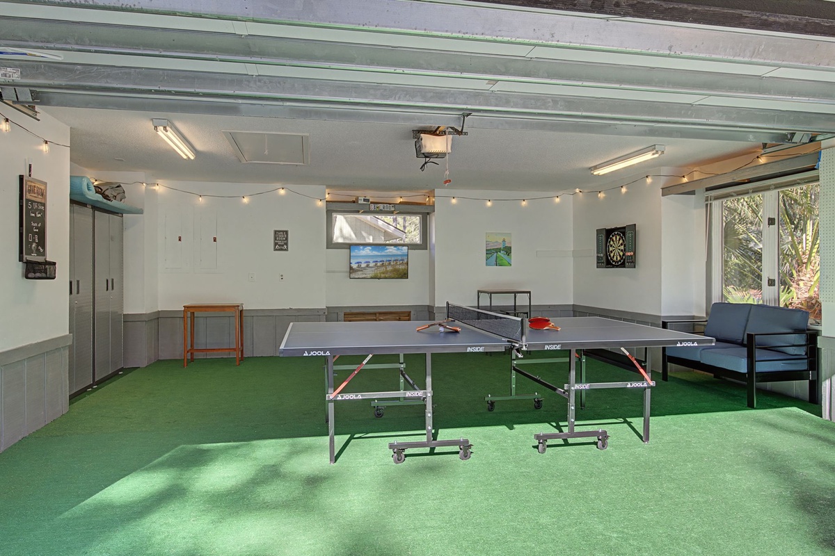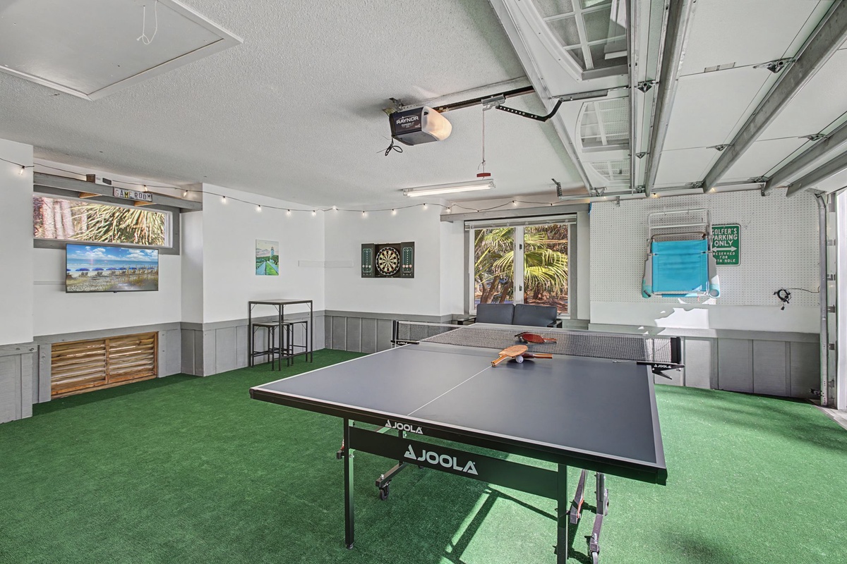 The spacious primary suite offers serene backyard views and a spa-like ensuite with dual vanities, a skylight, a jetted tub, and a zero-entry walk-in shower. Two additional guest bedrooms and a beautifully updated secondary bath provide comfort and privacy for family and friends. A custom laundry room with convenient access adds ease for longer stays. An extra spacial bonus is the newly converted game room with a ping pong table, darts, tv, and lounge area! Enjoy a vacation reimagined with host2coast, your trusted Hilton Head Island Property Management partner.