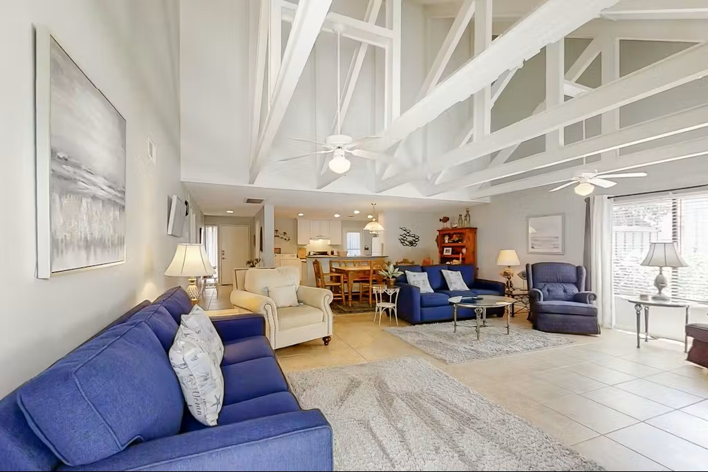 Inside, vaulted ceilings and abundant natural light create an inviting and airy living space designed for relaxation. The comfortable living room features a large television and additional seating, making it an ideal place to unwind after a day of beach adventures. The open layout flows easily into the dining area and kitchen, creating a welcoming setting for shared meals and casual gatherings. Step outside onto the private deck where guests can enjoy fresh coastal breezes and grill summer favorites on the gas grill.