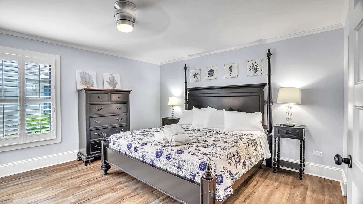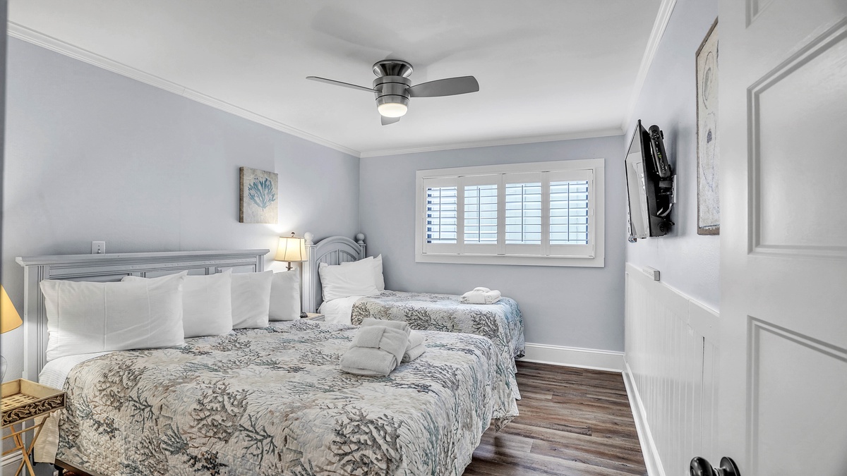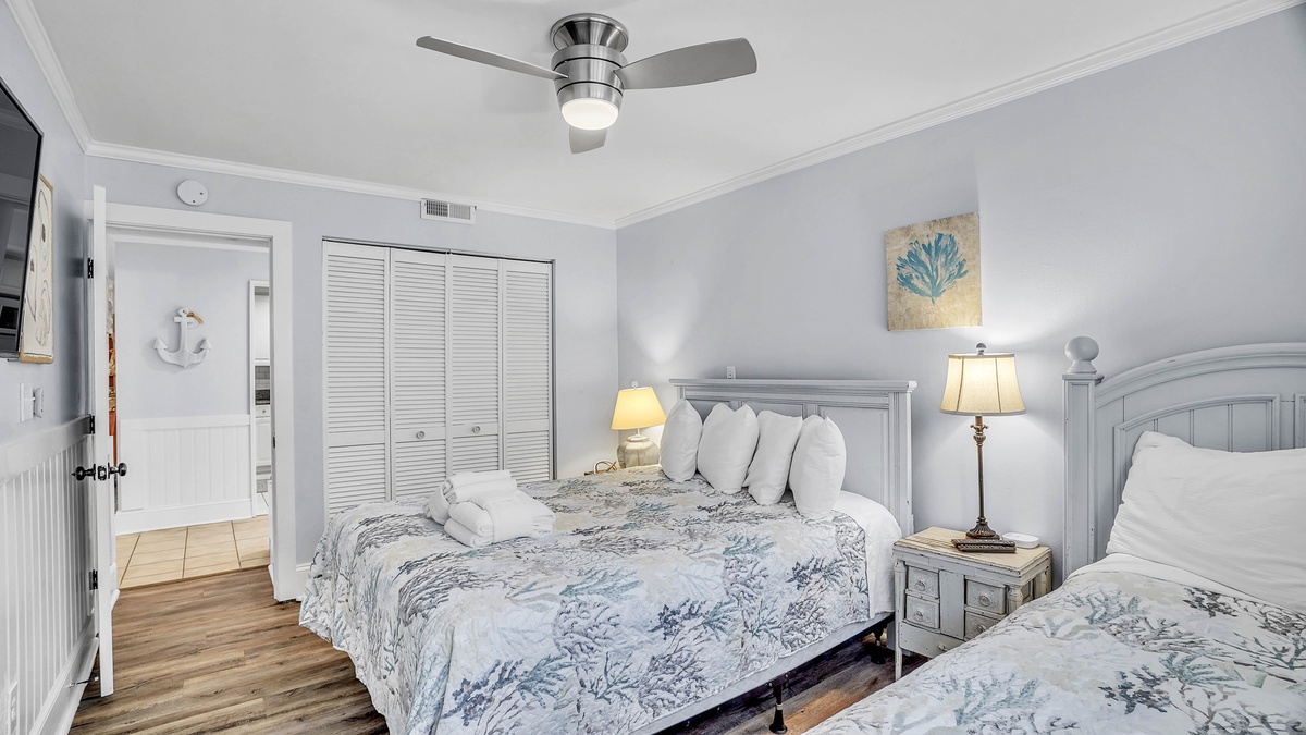 From the moment you step inside, you’ll be immersed in a seamless blend of sophistication and warmth. The open-concept living area features plush seating, a smart TV for entertainment, and elegant coastal accents in soft blues and sandy neutrals. Natural light pours through large windows, enhancing the airy ambiance. The modern, fully equipped kitchen boasts stainless steel appliances, granite countertops, and all the essentials for cooking up unforgettable meals. Each bedroom is thoughtfully designed for a restful stay. The master suite is a luxurious haven - complete with a king-sized bed and private en-suite. The second bedroom offers versatile accommodations with both a queen and twin bed, ensuring comfort for all guests. Premium linens, tasteful decor, and meticulous attention to detail elevate your experience.