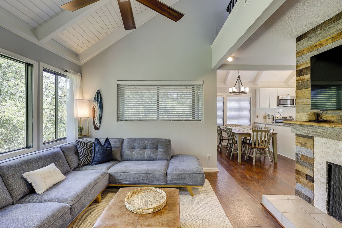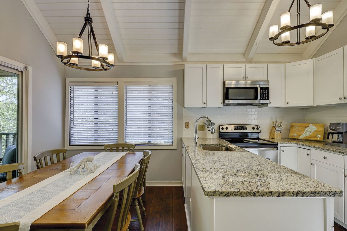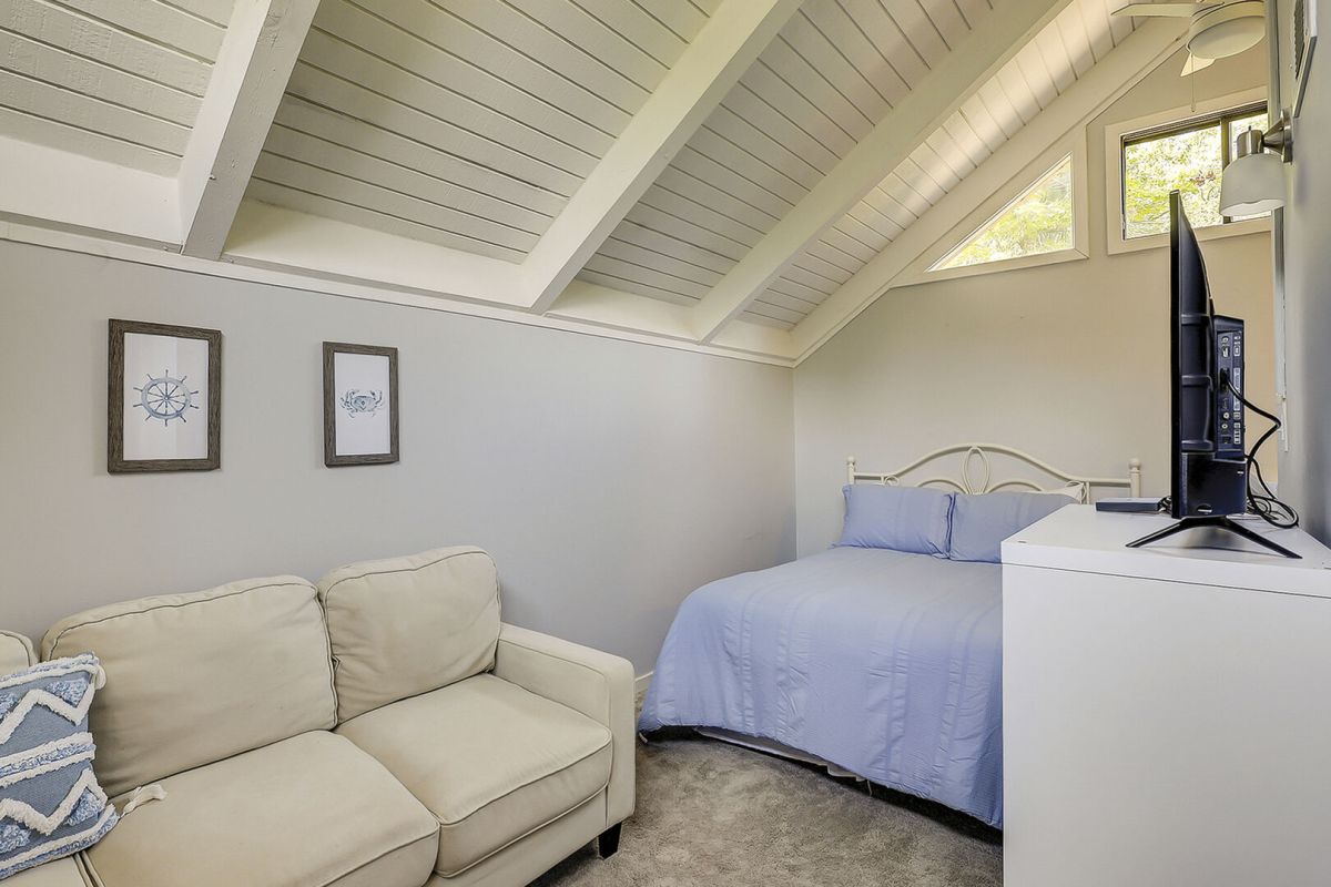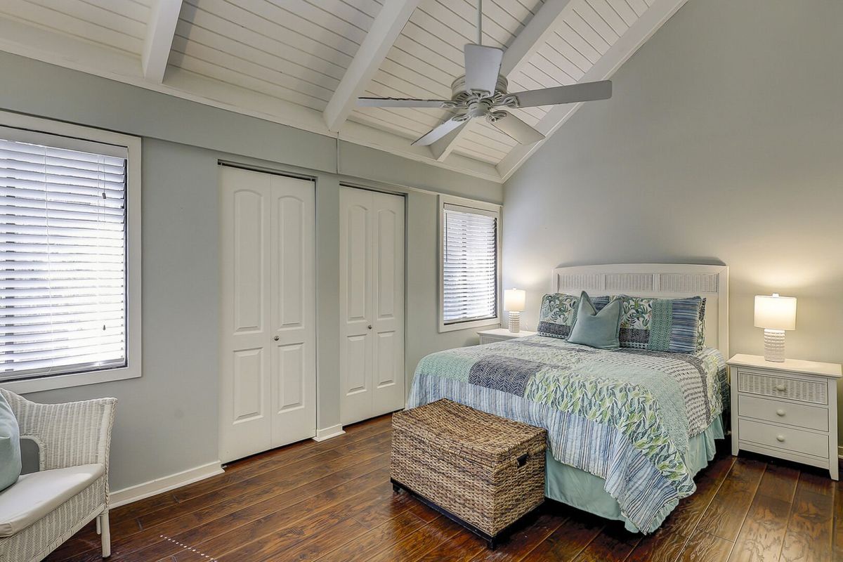 Inside, vaulted ceilings and an open layout create a bright, inviting space. The kitchen is fully equipped for easy meals, while the dining and living areas encourage togetherness after days spent exploring the island. The screened porch invites slow mornings with coffee and quiet evenings surrounded by nature. The primary bedroom offers a comfortable queen bed and private bath, the guest bedroom features another queen with easy access to the hallway bathroom, and the upstairs loft adds flexibility with a double bed and cozy seating.
