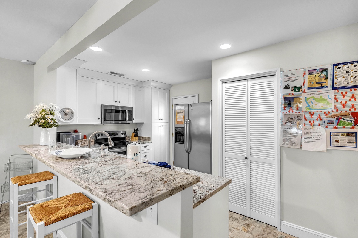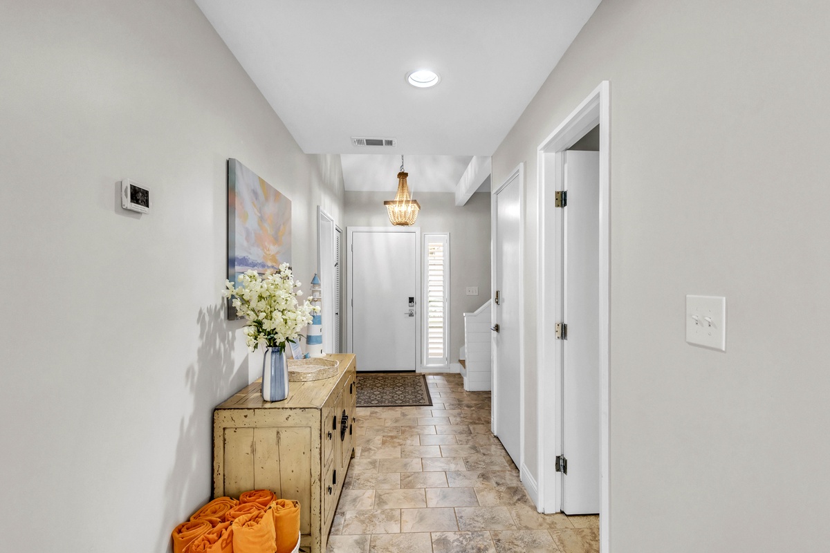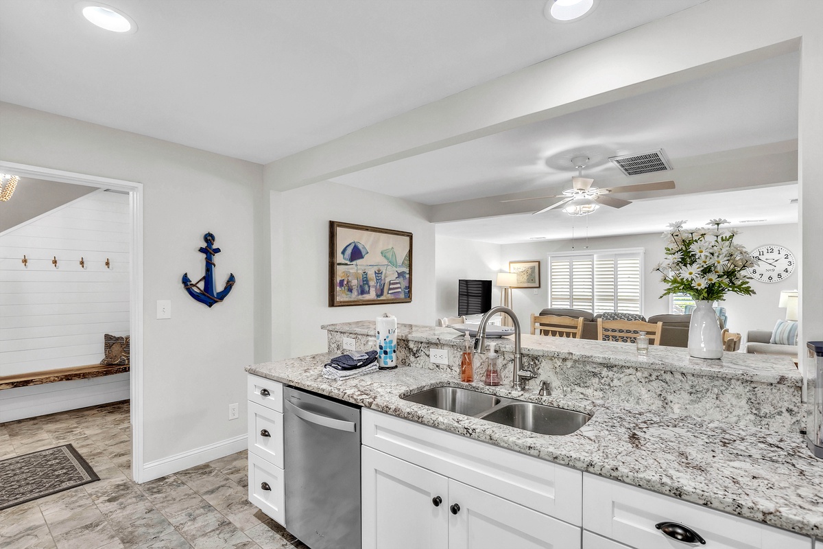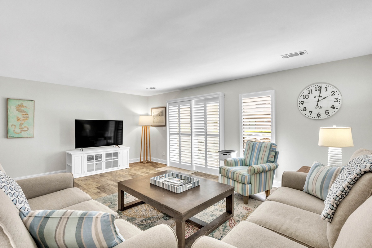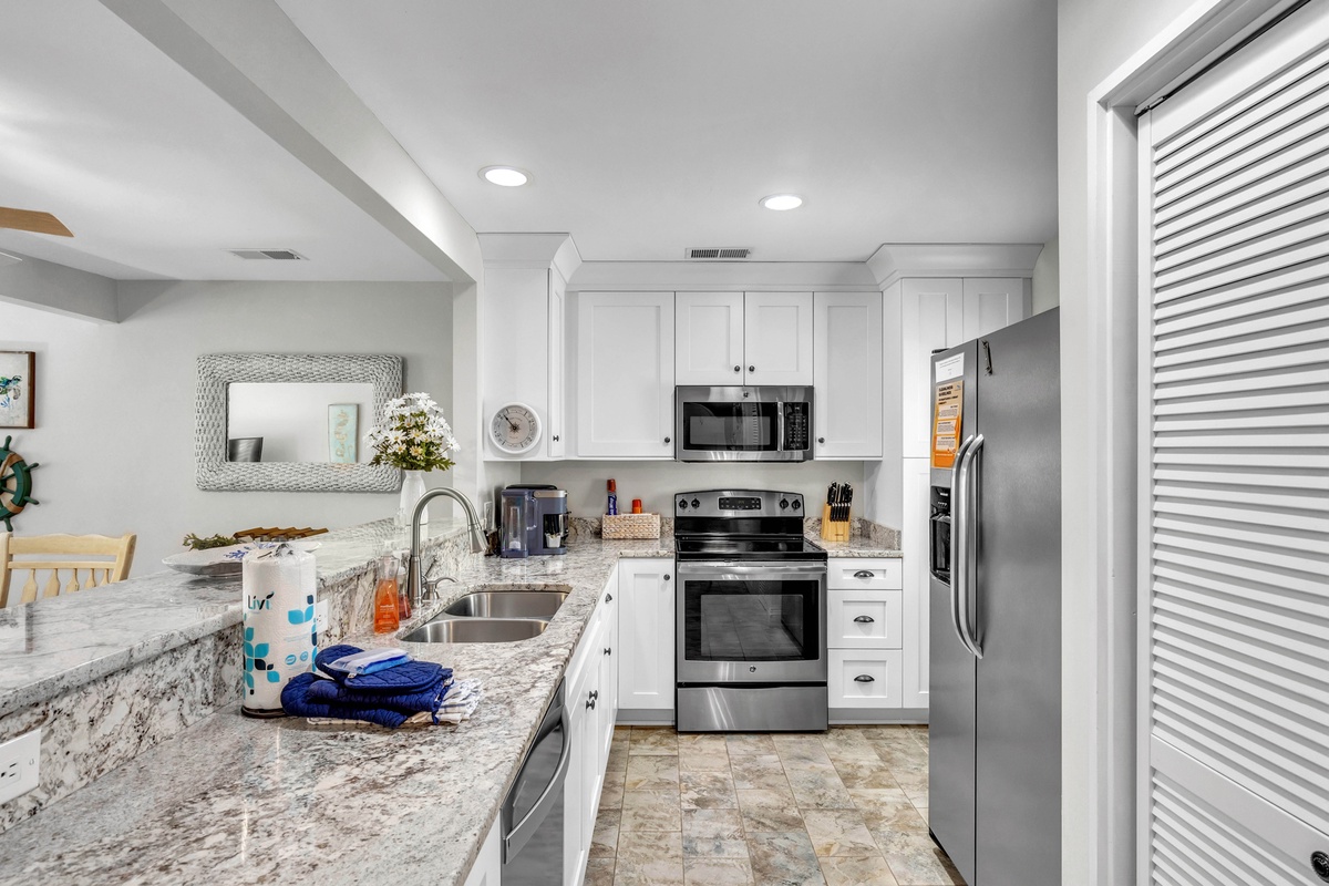 1900 square feet of living space provides plenty of room for up to 7 guests. A lovely 2-story entry sets the tone for the main level open floor plan that includes a living area with cozy oversized furnishings, 65" Smart TV and sliding doors to the deck, a dining area with seating, and a fully-equipped kitchen with stainless steel appliances, granite counter tops, a Keurig, and your cooking essentials. The kitchen also features a stackable washer and dryer and access to the storage yard which includes an outdoor shower, perfect for rinsing off after the beach! The enclosed deck includes a patio table with seating and grill, perfect for dining outdoors!